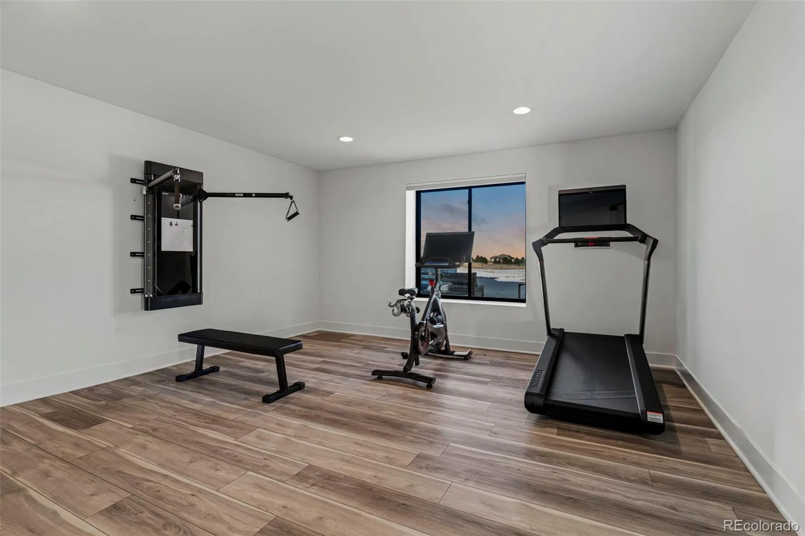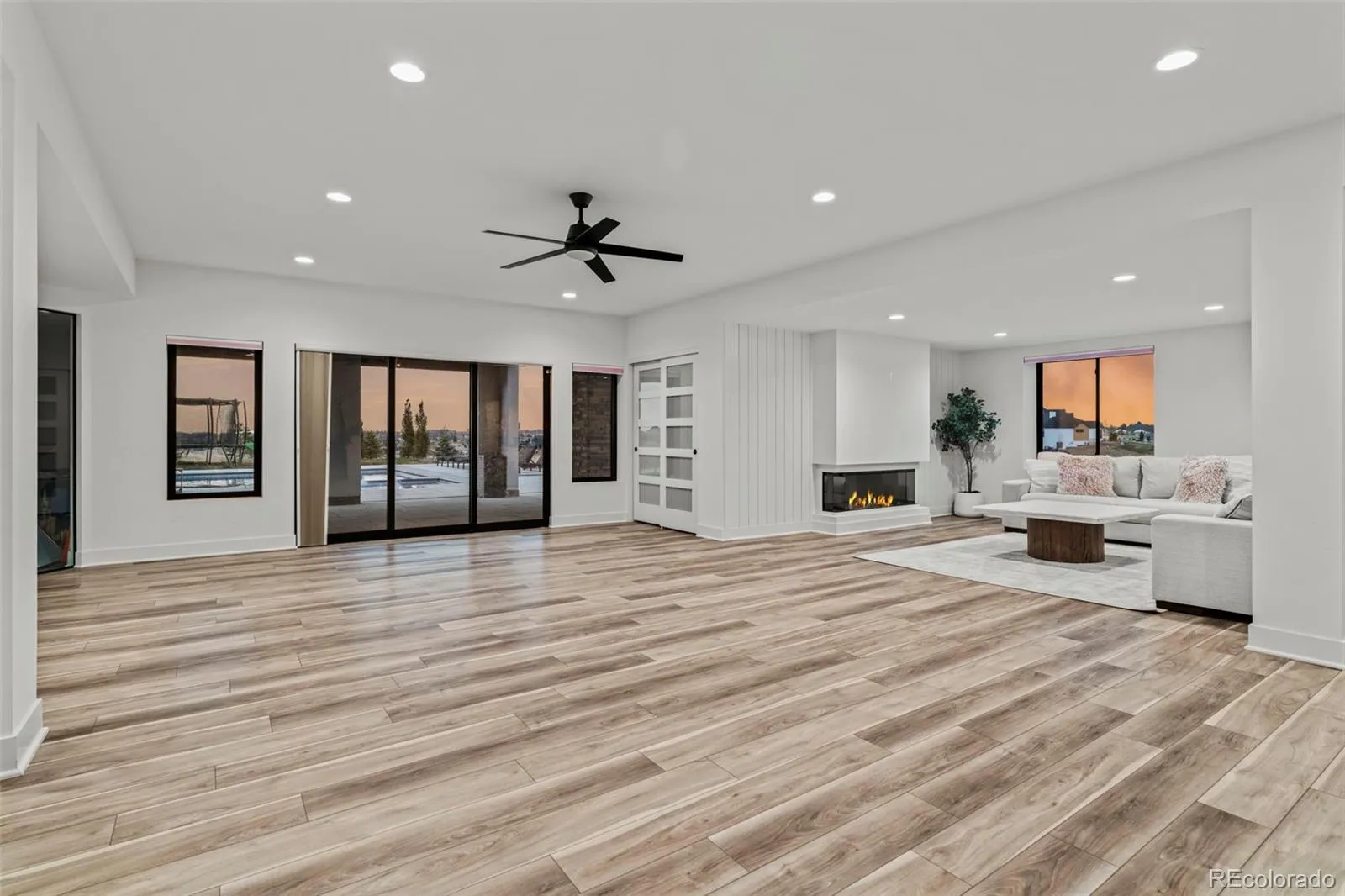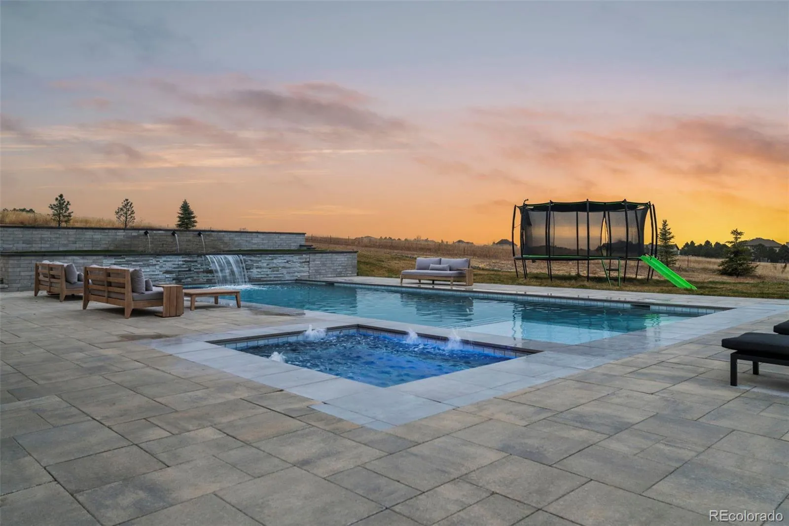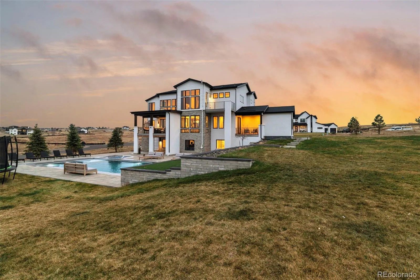 Huge $50,000 Price Improvement! Meticulously maintained two-story modern farmhouse on a quiet cul-de-sac in one of Parker’s most desirable neighborhoods, set on a sprawling 1.5-acre lot backing to open space with beautiful mountain views. Designed by award-winning Joyce Homes, this residence blends modern luxury with sustainable living and features floor-to-ceiling windows, sliding glass panel doors, and seamless indoor/outdoor flow to an expansive covered deck with gorgeous views!. The gourmet kitchen is equipped with stainless steel appliances, quartz countertops, custom cabinetry, and a full scullery kitchen ideal for prep and entertaining. A main-floor guest suite with private bath adjoins a convenient home office, creating a highly functional multigenerational layout. The upper level offers a generous owner’s suite with private balcony, freestanding spa tub, multi-head walk-in shower, and ample closet space. Three oversized secondary bedrooms, a full bath, and an upper-level laundry room complete the second floor. The fully finished walk-out basement provides exceptional natural light and includes a wet bar, 54-bottle glass-front wine room, large great room with modern gas fireplace, fitness room overlooking the pool, and a guest bedroom with adjacent 3/4 bath featuring a steam shower. Outdoor living is unmatched with a heated 20 x 47 salt-water pool, 8 x 10 hot tub, two-tier waterfall feature, and safety covers for year-round peace of mind. An oversized and fully finished 3.5-car garage offers abundant space for vehicles, gear, toys, and hobbies. This extraordinary home combines luxury, livability, privacy, and resort-style amenities in a premier Parker location. Just minutes from the highly rated Legend High School, Colorado Golf Club and The Pinery/Pradera Country Club! Full property tour available at www.9645CanyonWindPlace.com