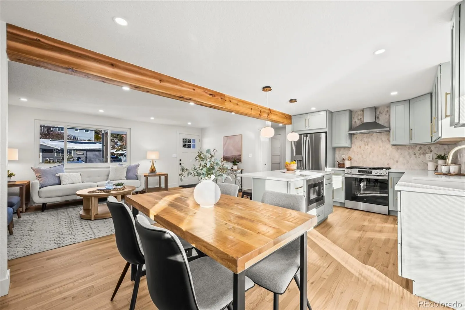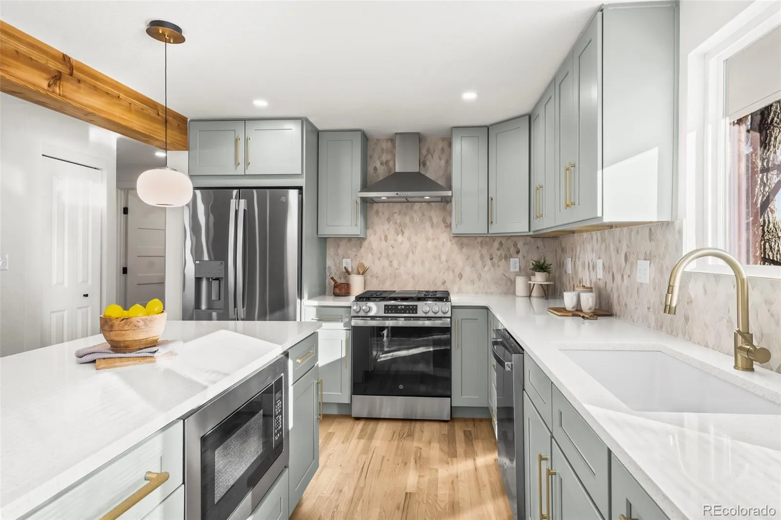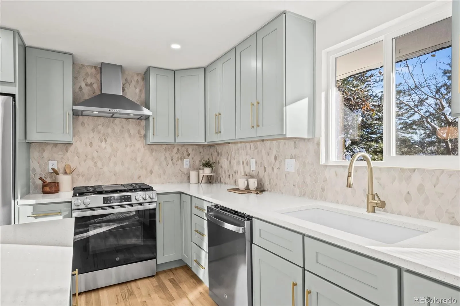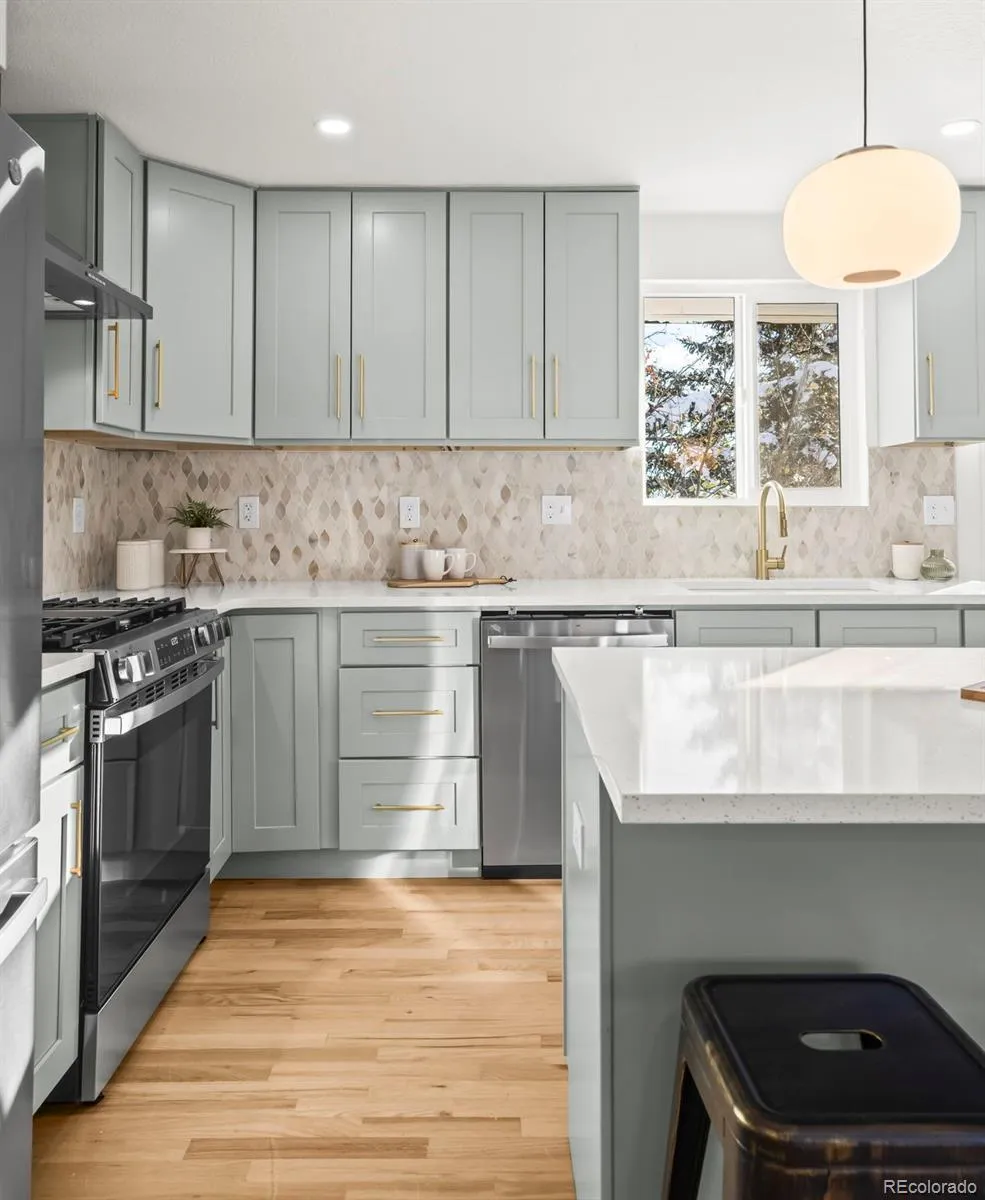 This newly remodeled Arvada ranch blends cozy comfort with understated luxury from the very first glance. Natural light spills across the beautiful hardwood floors, highlighting an open, easy-flow layout that makes the home feel instantly inviting. The kitchen serves as the home’s centerpiece with custom cabinetry, quartz countertops, a gas range, brand-new GE appliances, and a striking Pandoro Lantern Marble backsplash that brings everything together with style.