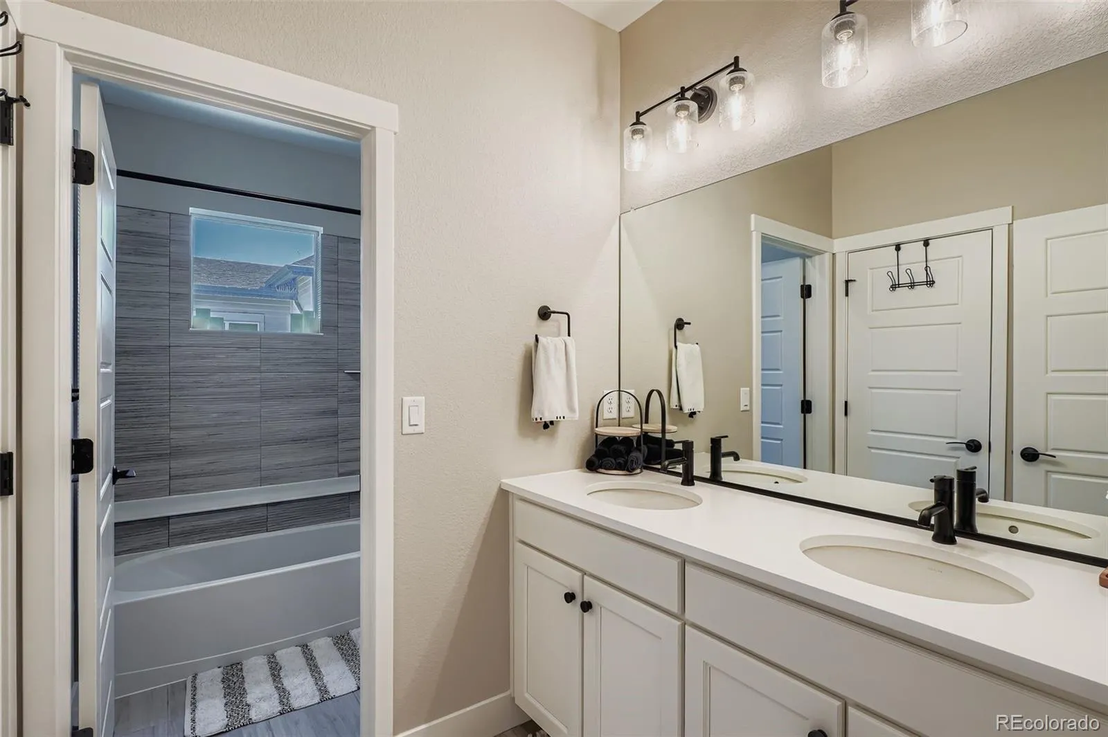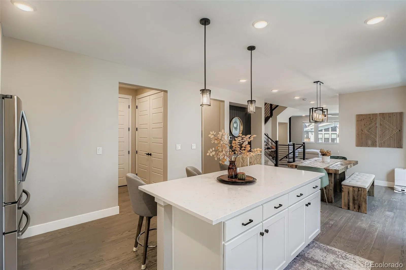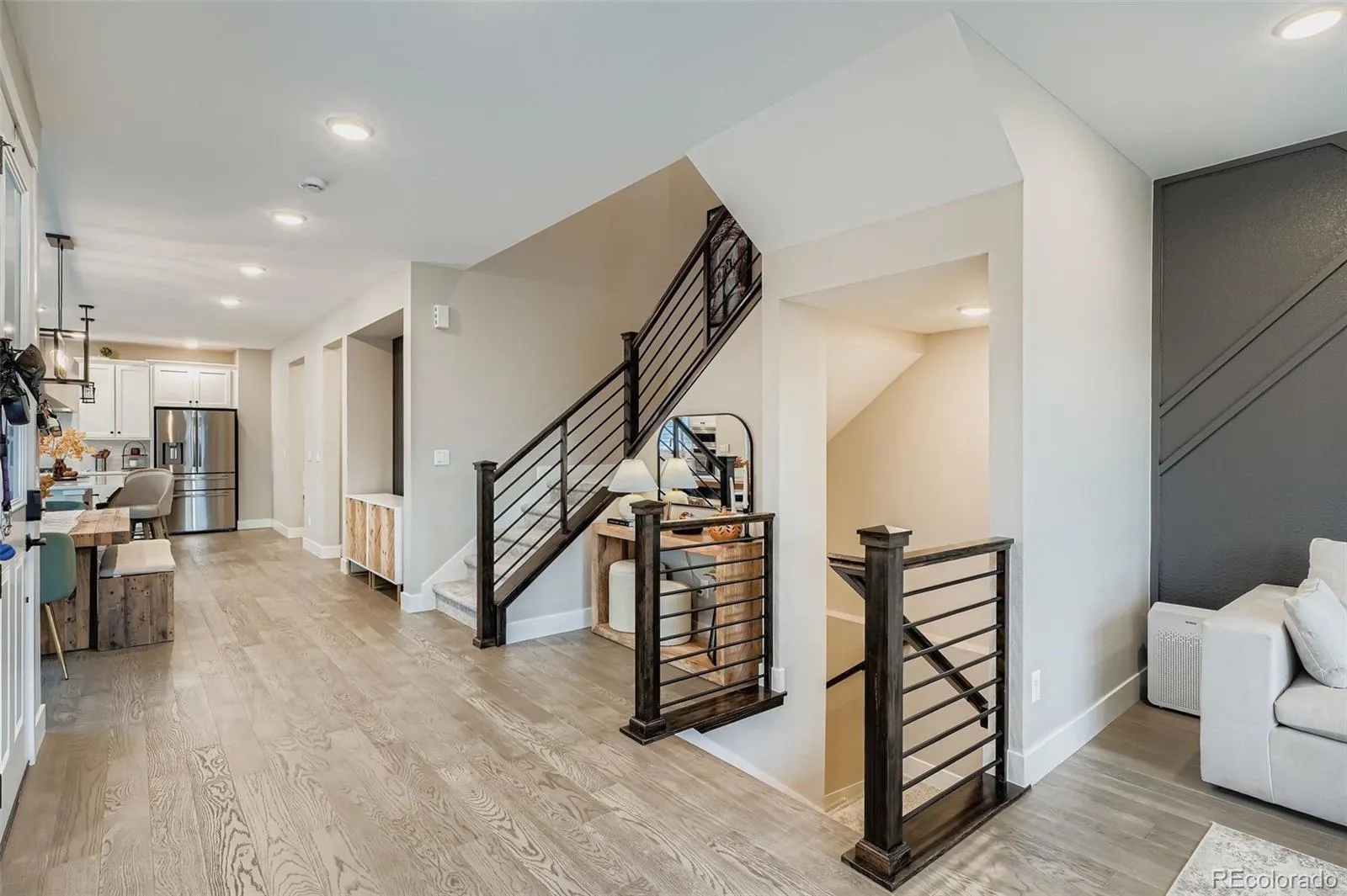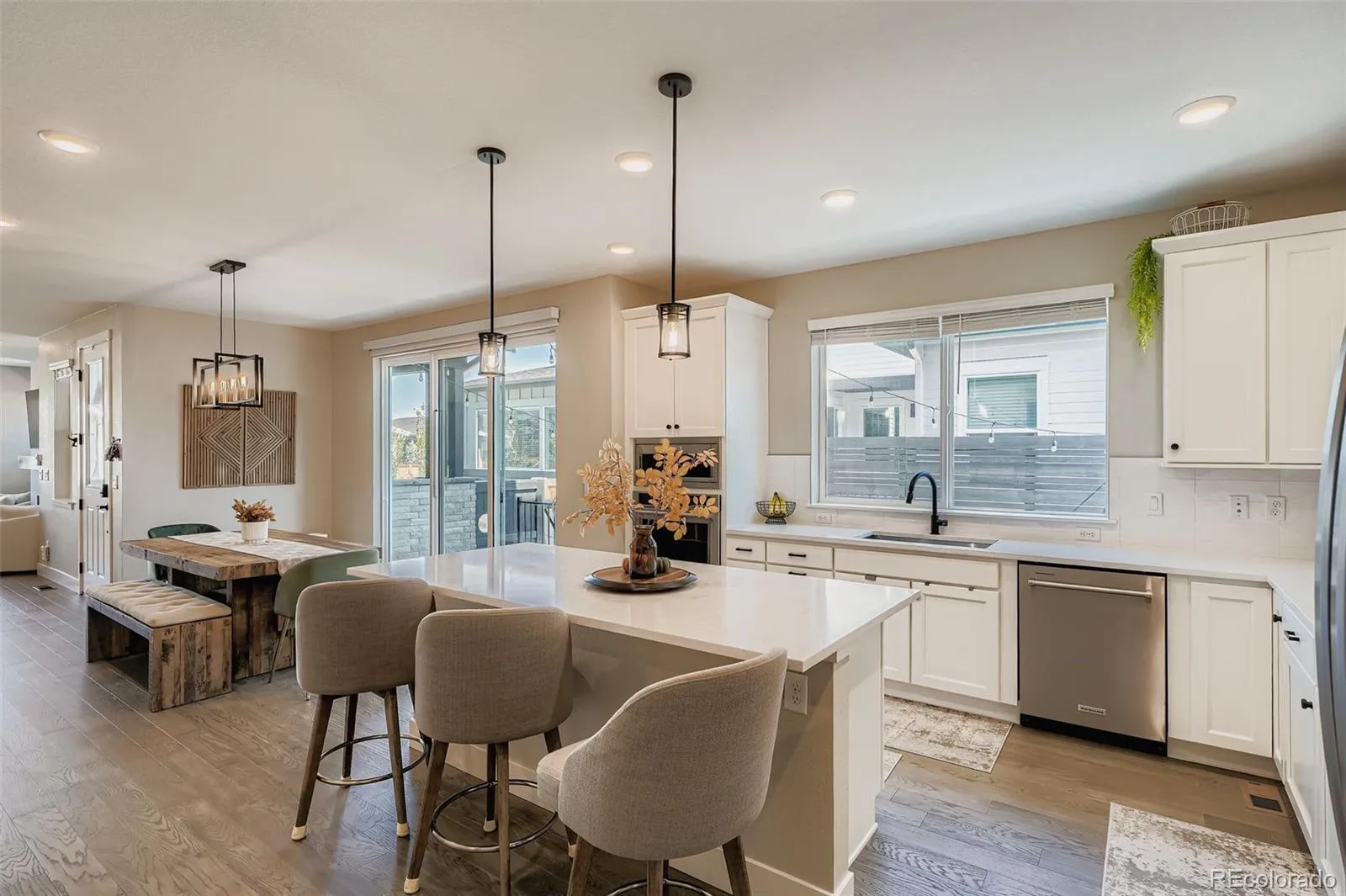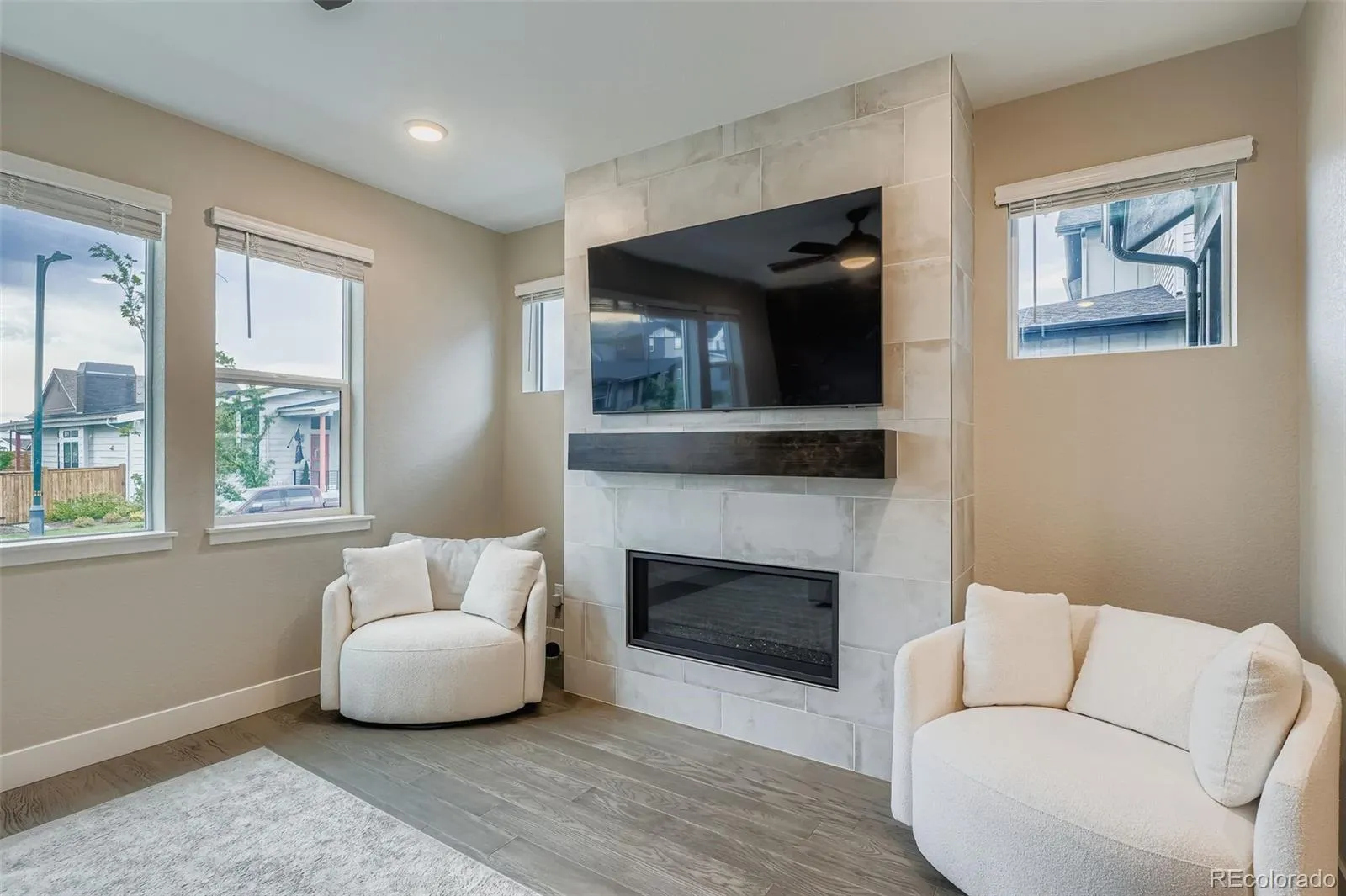 Welcome to this stunning Brookfield Villa 4. Designed with high-quality soundproofing to ensure a quiet living environment. This beautifully crafted paired home features 4 bedrooms and 3.5 bathrooms and is located in the heart of Central Park’s North End. Step inside to an open, light-filled main level with beautiful hardwood floors that set the tone for sophisticated yet comfortable living. Throughout the home, thoughtfully designed accent walls add depth and character, elevating the overall aesthetic. The inviting living room is centered around a gas fireplace with a floor-to-ceiling tile surround and a sleek floating wood mantel. A spacious dining area connects seamlessly to the heart of the home and opens directly to your own private backyard oasis. Designed with low-maintenance living in mind, the backyard features a patio and a composite-wood deck, ideal for outdoor entertaining, grilling, or simply enjoying the Colorado sunshine. The chef’s kitchen is sure to impress with its white, soft-close cabinetry, sleek quartz countertops, spacious island, elegant backsplash, and premium stainless steel KitchenAid appliances. A generous mudroom adds everyday convenience and connects to the attached two-car garage, which includes a 240V EV outlet. The garage is accessed via an oversized alley, providing easier maneuverability and added space between neighboring homes. Upstairs, escape to the luxurious primary suite featuring his and hers walk-in closets and a spa-inspired bathroom with double vanities and a frameless glass rain shower. Two additional bedrooms, a stylish full bath with tub and shower offer comfort and flexibility for family or guests. The finished basement expands your living space with a second large living room, a fourth bedroom and full bath, plus a bonus area that’s perfect for a home office, gym, or game room.