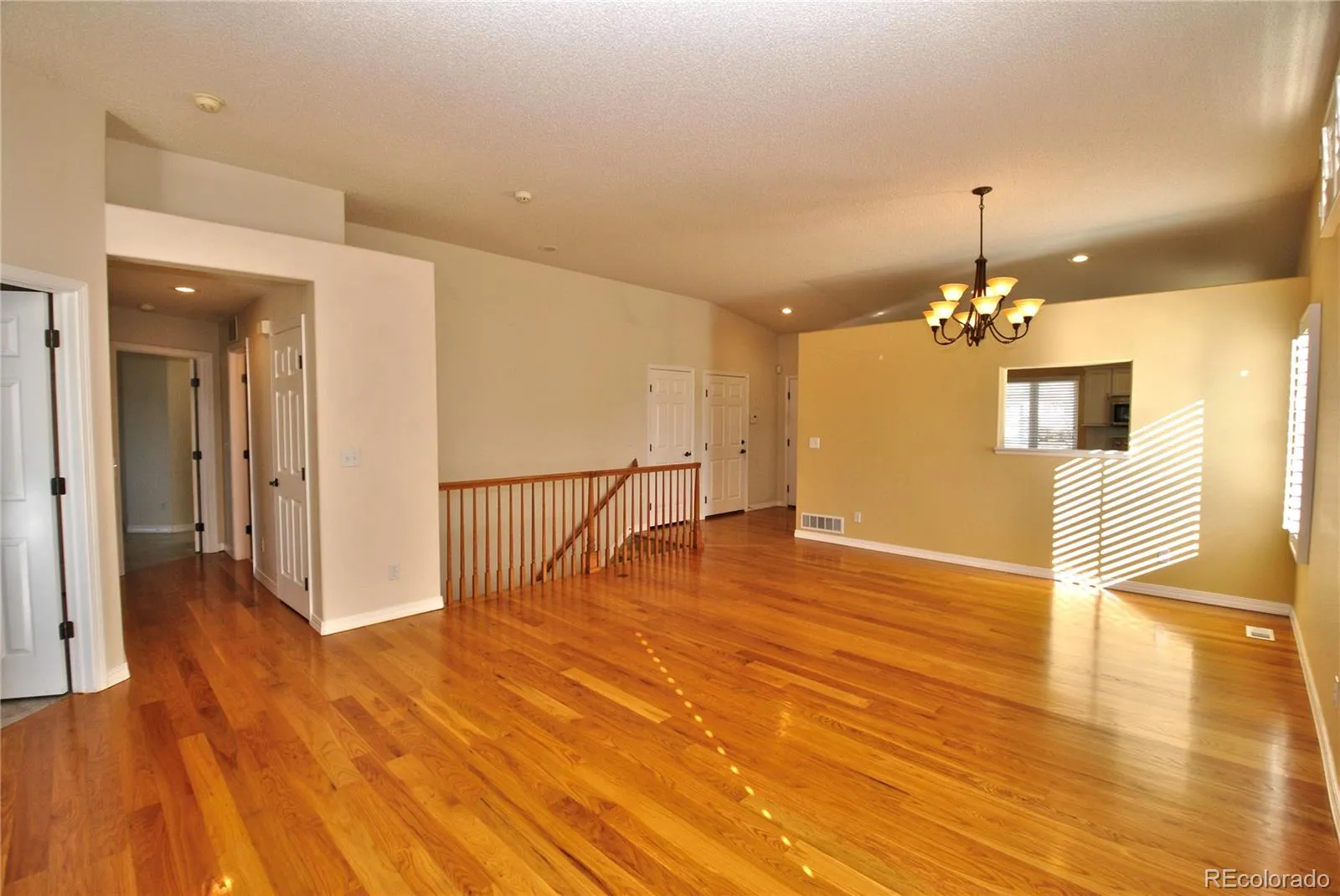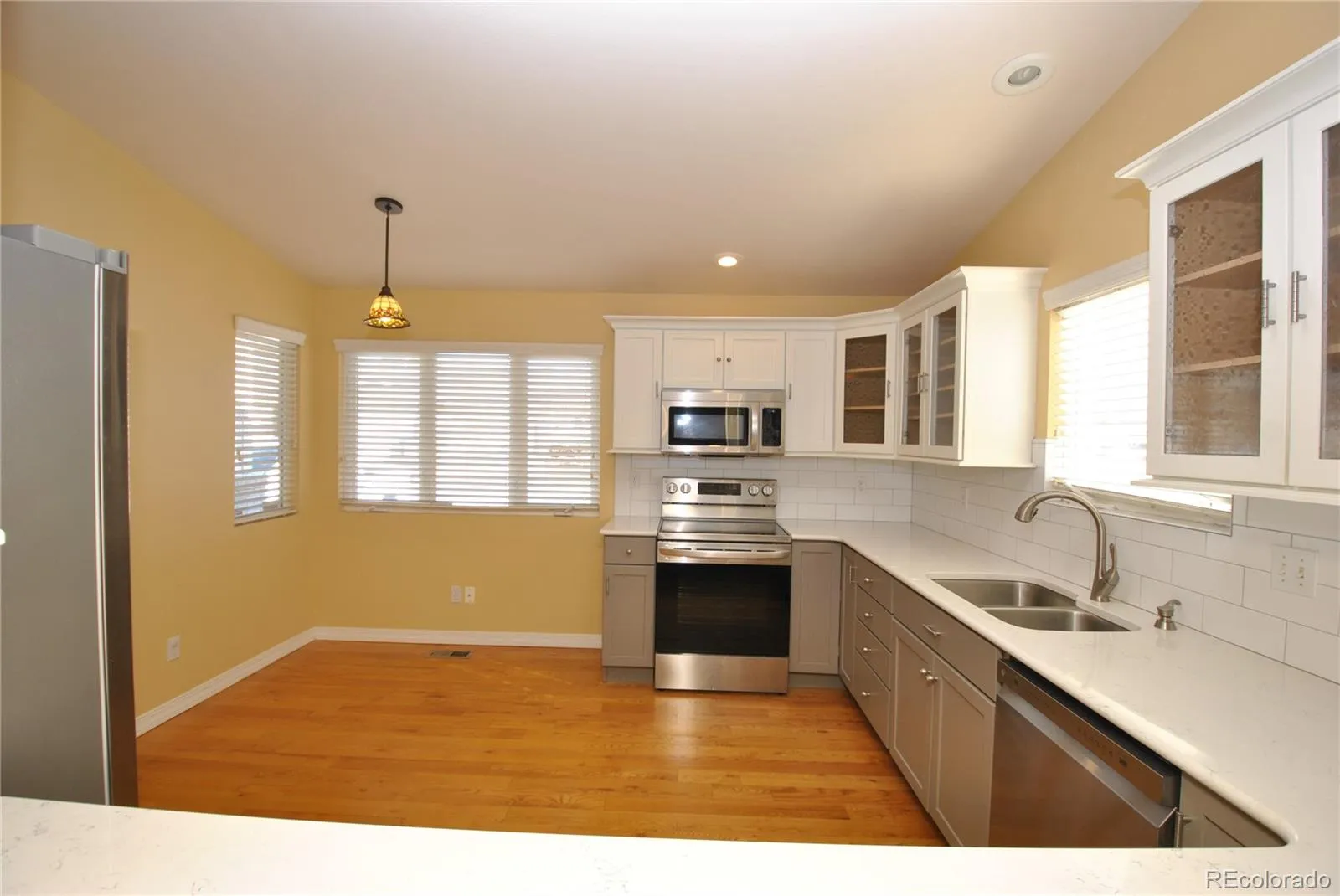 BIG, OPEN PIKES PEAK AND MOUNTAIN VIEWS!! and Big open Main level living. Enjoy the hardwood floors throughout the main living area complimented by custom LVT tiled bedrooms. New updated eat in kitchen features quartz countertops, Stainless Steel appliances, Subway tiled backsplash and Custom cabinets. The great room flows with vaulted ceilings and stacked stone fireplace with built in bookshelves that walks out to reading sunroom to the composite deck with full front range Mountain Views. Wide doorways and halls take you to the master suite and huge 2nd bedroom. The walkout basement features more views and amazing bedroom suite. Gigantic family and game room ices the finished basement. Custom blinds, Central A/C, humidifier, Big garage with extra shelving. Only minutes from the Powers Corridor.
