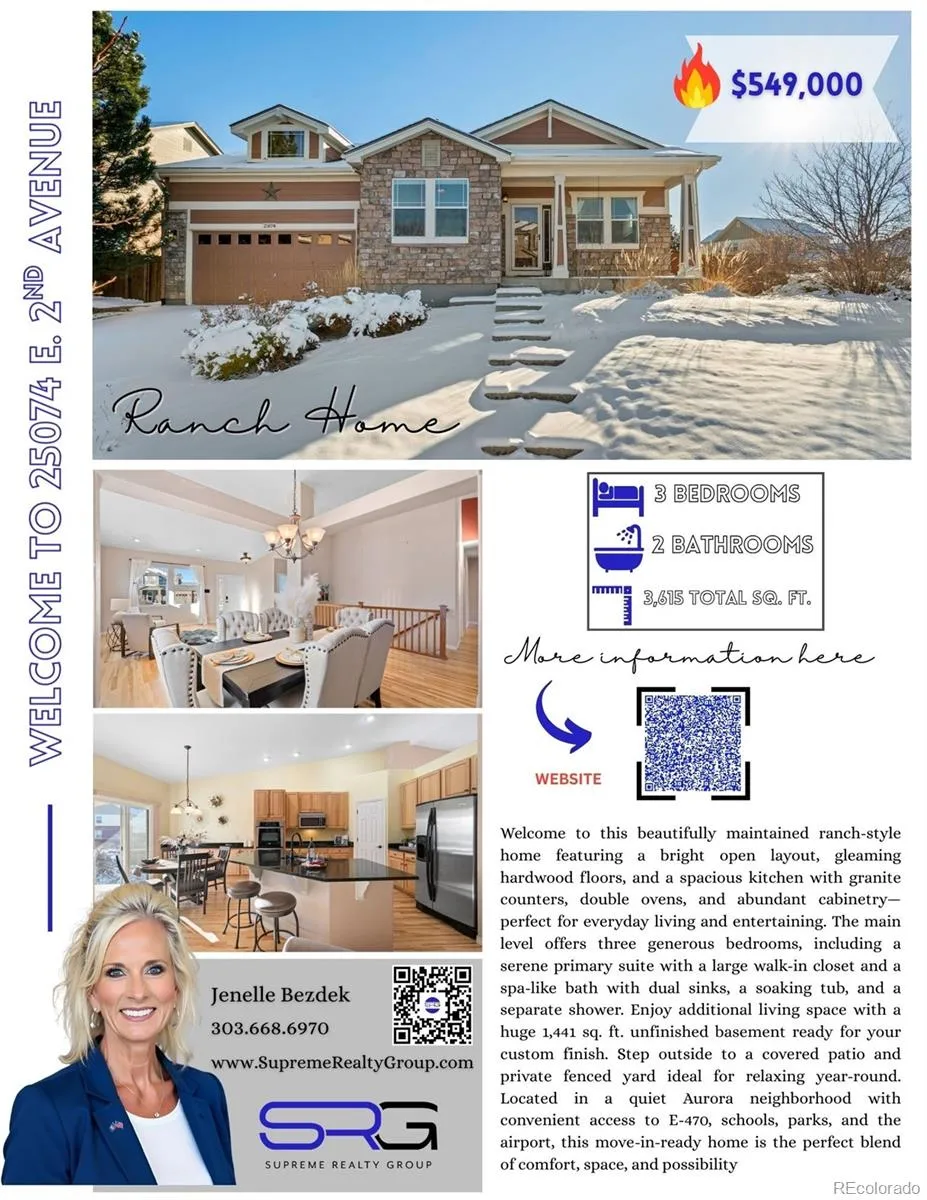 Welcome home to this beautifully staged and move-in-ready ranch in the highly desired Traditions community! Featuring 3 bedrooms, 2 baths, a bright open-concept layout, and a HUGE 1,441 sq ft unfinished basement offering endless equity potential. Enjoy main-level living, a spacious kitchen with abundant storage, and a private primary suite with walk-in closet. The corner lot, large backyard, 2-car garage, 3-year old roof, and quiet interior location make this home the perfect retreat. Traditions offer a resort-style clubhouse, pool, parks, trails, and quick access to E-470, I-70, DIA, Buckley Space Force Base, and the Anschutz Medical Campus. Immaculate, stylish, and priced to sell — this is the home your buyers have been waiting for! ***ASSUMABLE 2.5% VA LOAN AVAIALBLE FOR QUALIFIED OWNER-OCCUPIED BUYERS – ASK FOR DETAILS *****