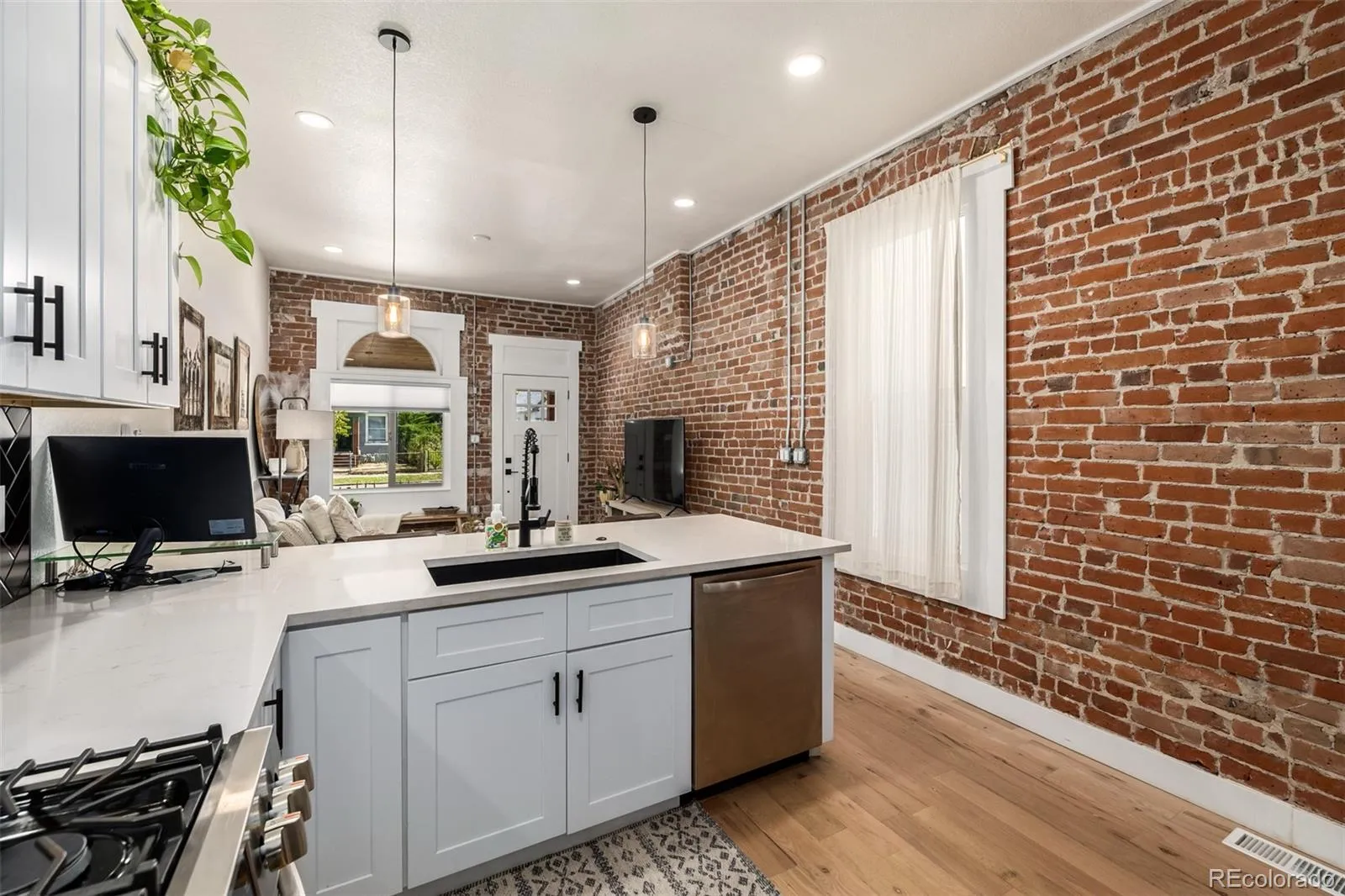 Welcome to the vibrant and highly desirable Cole neighborhood in Denver—an area celebrated for its welcoming community and convenient access to downtown. Step onto the inviting front porch, a perfect spot to enjoy your morning coffee or wind down in the evening. Inside, this modern bungalow offers a harmonious blend of style and comfort, with rich wood flooring, soaring ceilings, and an abundance of natural light streaming through oversized windows—all creating a warm and welcoming atmosphere. The open-concept layout seamlessly connects the living, dining, and kitchen areas, making it ideal for everyday living and entertaining alike. The kitchen is a true showstopper, featuring classic shaker cabinetry, expansive quartz countertops with bar seating for four, and a layout that flows effortlessly into the living area. An exposed brick wall adds warmth and character, creating a perfect backdrop for both meals and conversation. The generous primary bedroom includes a spacious closet, and private access to the backyard—your own serene retreat. The outdoor space is ideal for fall gatherings and year-round enjoyment. This thoughtfully updated home includes numerous upgrades completed in recent years, such as a fully remodeled kitchen, modernized bathroom, new furnace, A/C unit, water heater, windows, and appliances. The laundry room has also been refreshed for added functionality.