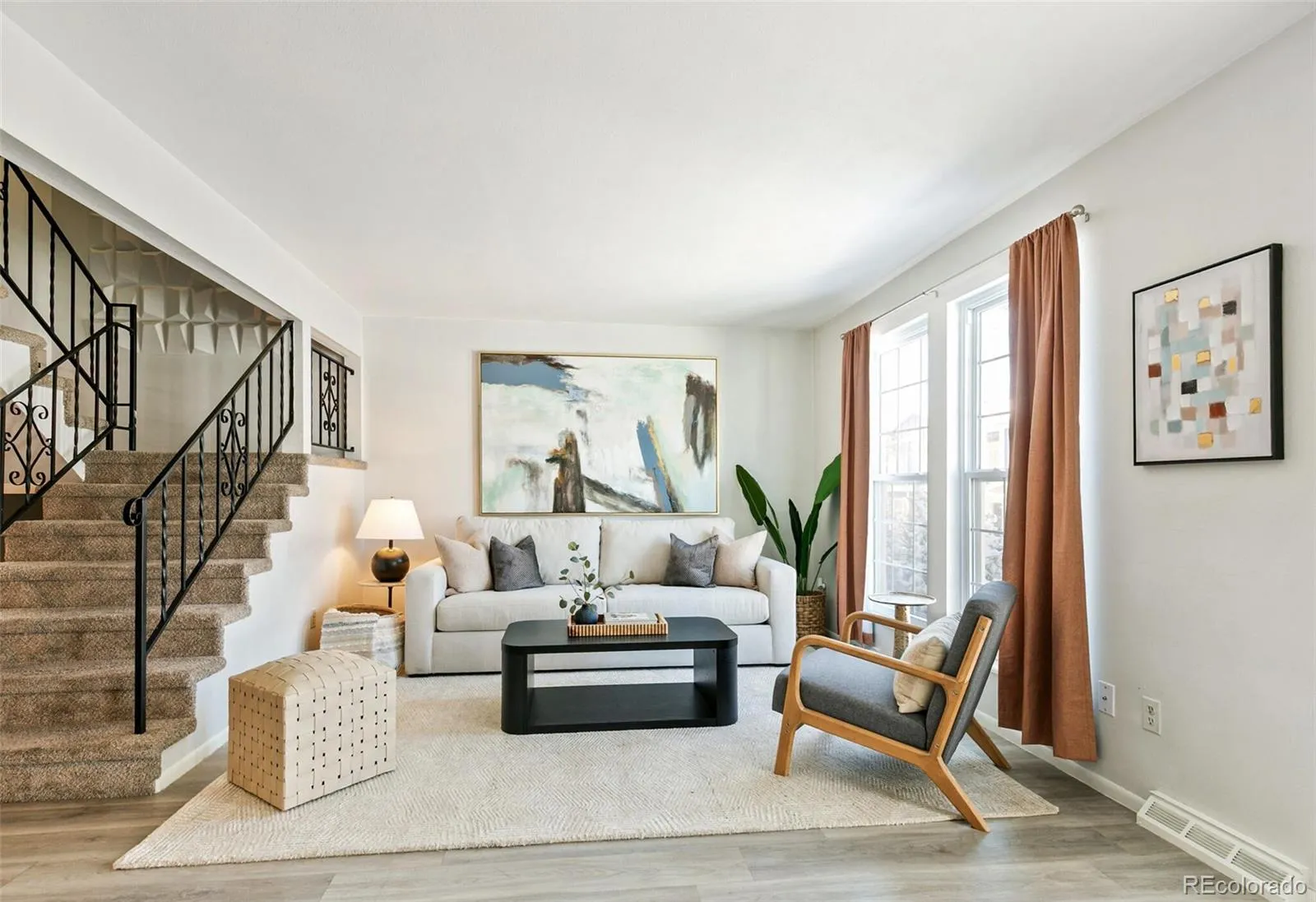 Featuring wide plank luxury vinyl flooring, the ample living room has updated windows providing wonderful natural light, and a powder bathroom with waterfall faucet and designer touches makes for easy entertaining. The kitchen with two tone cabinets, stainless steel stove and microwave, a new stainless steel dishwasher (December 2025), and elegant brushed gold faucet and cabinet hardware, this lovely home has a contemporary flair. The sizeable dining room opens up to an enclosed area with two skylights flooding the area with natural light. This bonus area could be used as a mudroom or workout space, or multipurpose room, and includes a large storage closet. The 2-car attached garage makes commuting in Colorado weather a breeze.