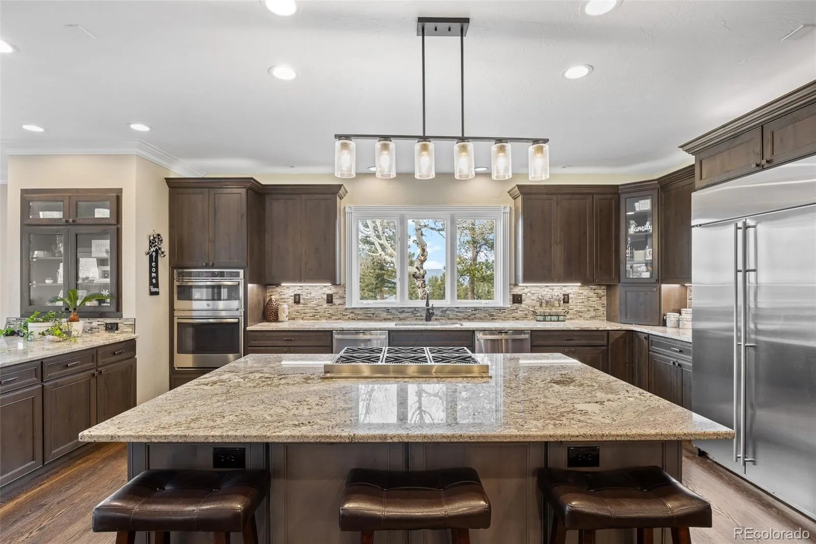The 7,700± sq ft brick-built estate was designed for longevity and low maintenance in the Colorado climate, while expansive windows and vaulted interiors frame the surrounding beauty. A floor-to-ceiling brick fireplace anchors the great room, complemented by custom timber trusses, a glass-wrapped sunroom, and a gourmet kitchen with premium appliances and a large granite island. The primary suite is a retreat of its own, featuring a double-sided fireplace that opens to a spa-like ensuite with a freestanding tub and sweeping mountain views. The expansive lower level offers a stone fireplace, large family room, game area, bedrooms, and a theater room—ideal for multi-generational living or extended guests.