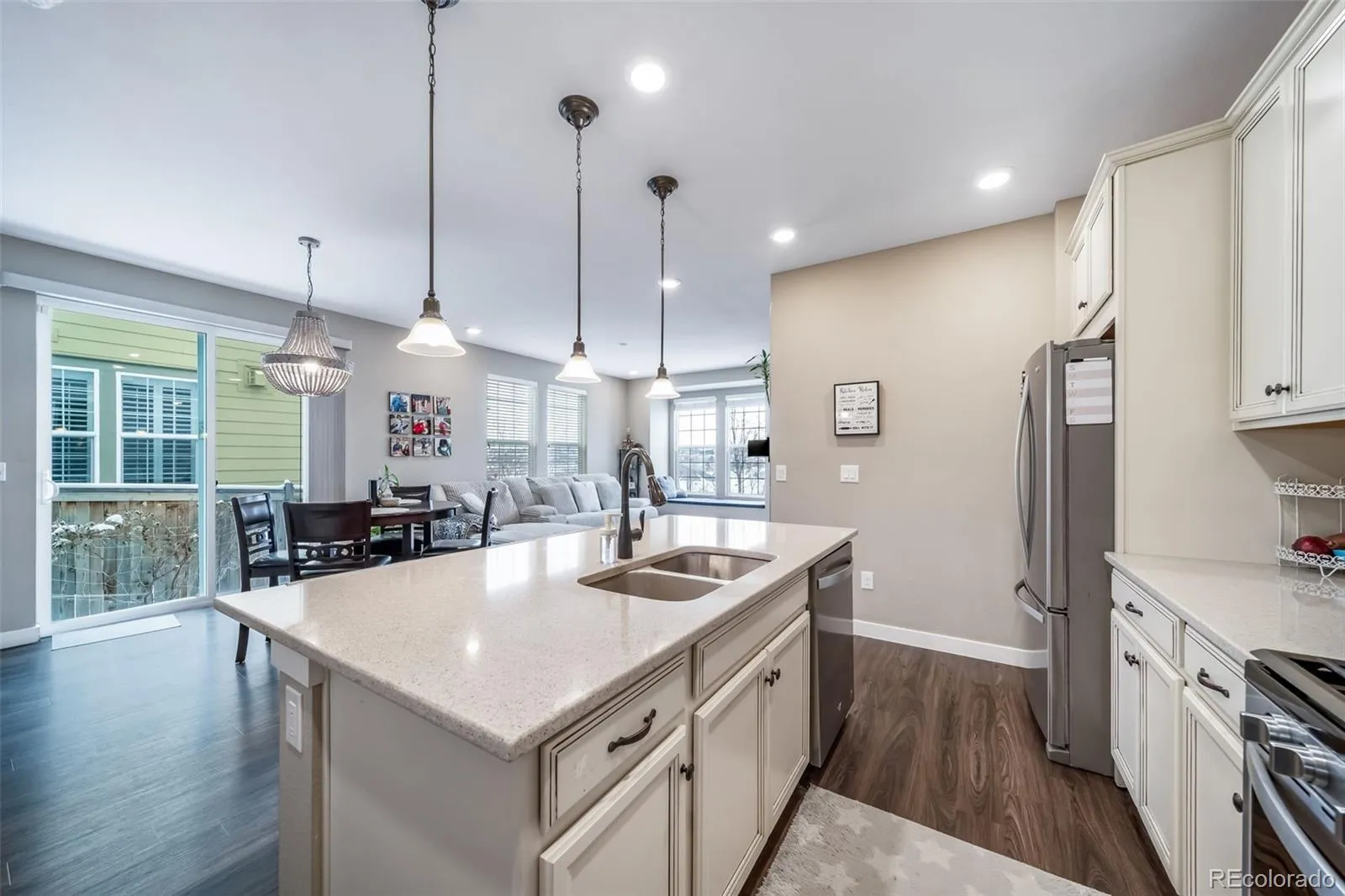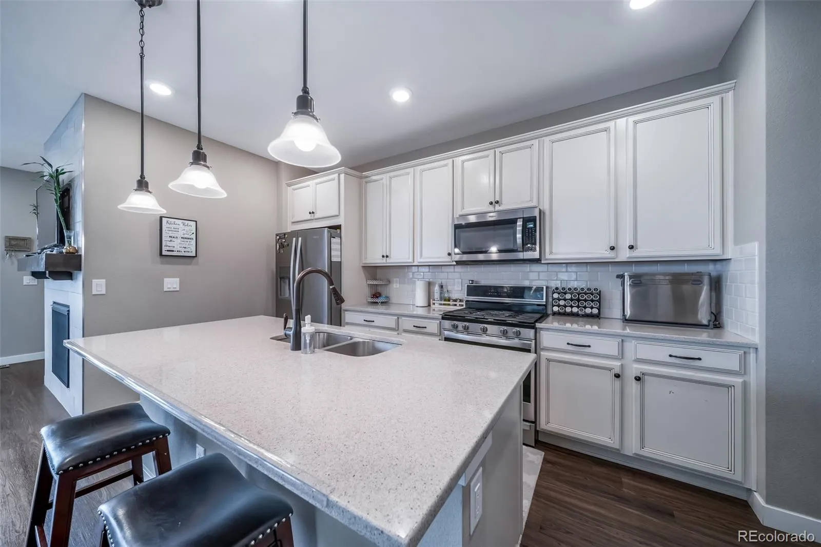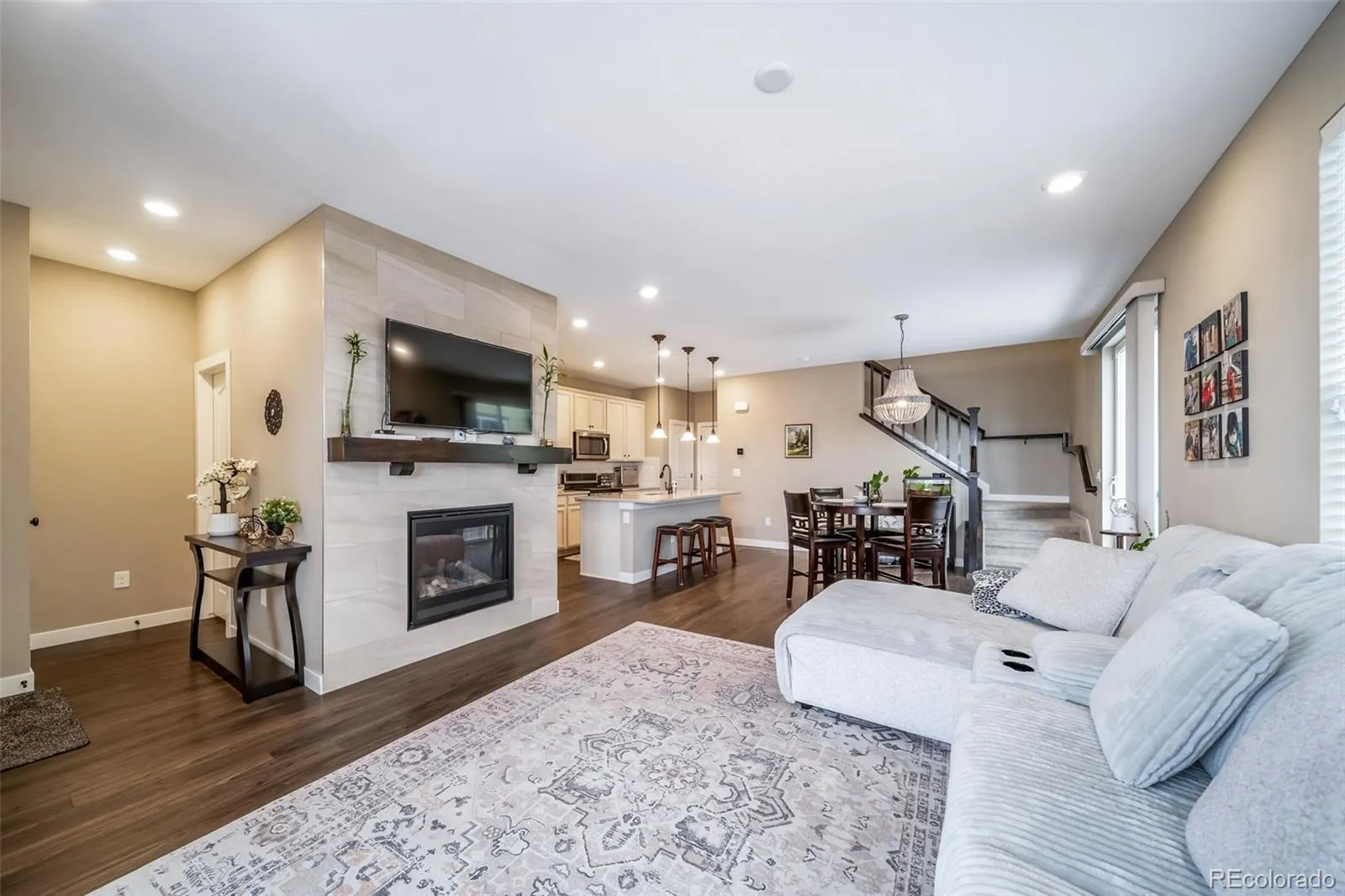 This beautifully maintained home offers the warmth, style, and functionality buyers love. The main level welcomes you with rich wood-style flooring, tall ceilings, and an inviting living area anchored by a sleek fireplace. The open kitchen features upgraded white cabinetry, stainless steel appliances with a gas range, a spacious island with pendant lighting, and generous counter space-perfect for casual dining or entertaining. Upstairs, a bright loft provides flexible space ideal for an office, home gym, movie lounge, or creative area. The primary bedroom feels serene and spacious, offering a large walk-in closet and a bathroom with crisp white cabinetry, Corian-style counters, and a walk-in shower. Additional bedrooms share a well-appointed full bath, and the laundry room is conveniently located on the upper floor. The full unfinished basement offers exceptional storage and the potential to expand with an additional bedroom, media room, or office. The home also boasts value-adding features like built-in window seats and a full radon mitigation system in the basement. Enjoy city views from the property, enhancing the overall appeal of this highly sought-after location . Outside, the private side yard is a low-maintenance retreat-ideal for a small garden or pets. The home faces a quiet, parkable street, making guest parking incredibly convenient. Located in the highly regarded Cherry Creek School District and close to shopping, dining, golf, and major highways, this home truly blends comfort, convenience, and modern style.