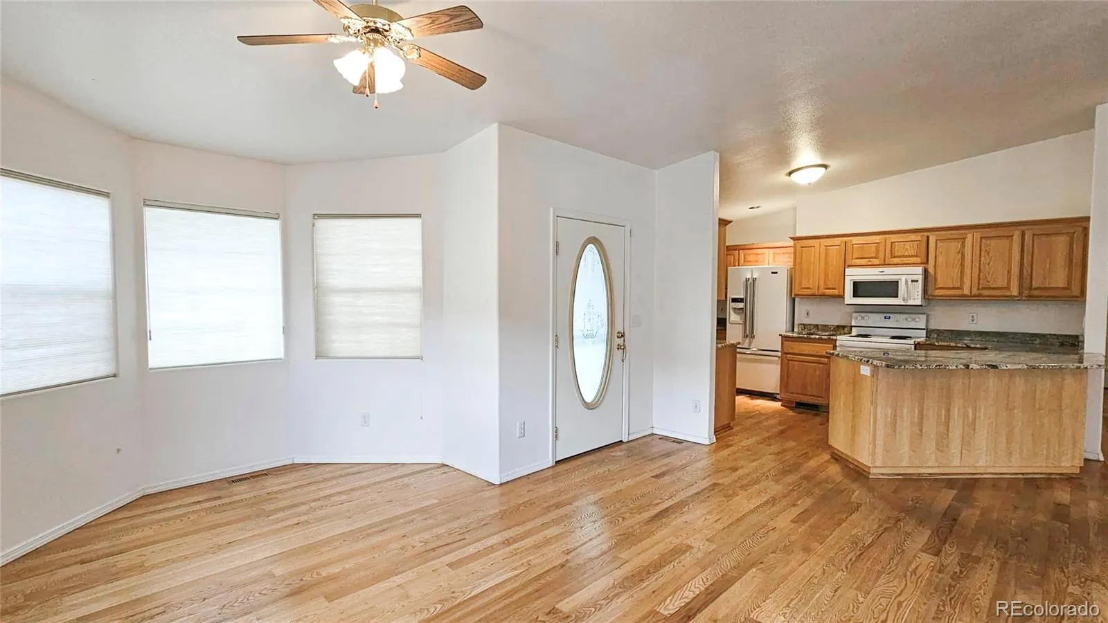 Tall ceilings throughout the home enhance the sense of openness, complemented by tastefully accented ceiling fans. The stone-wrapped kitchen creates a warm, inviting workspace that feels tucked away yet remains open enough for entertaining guests. Whether you’re preparing a quiet dinner or hosting company, the layout supports both convenience and connection.