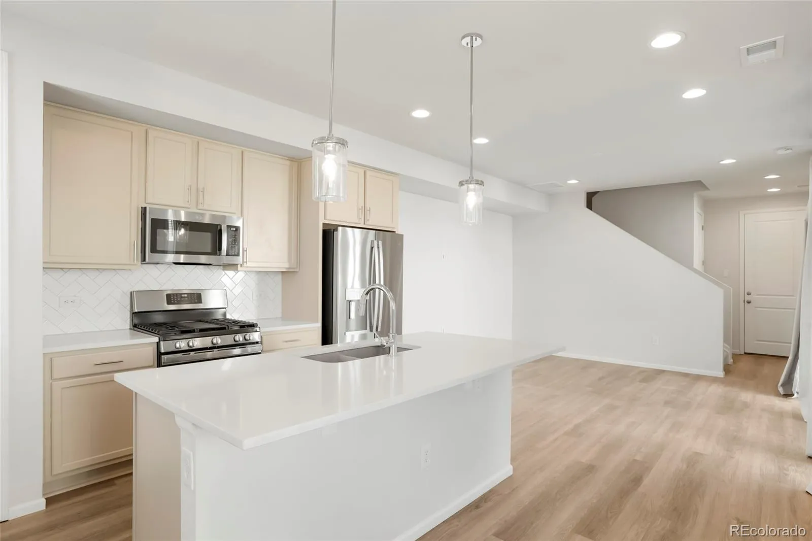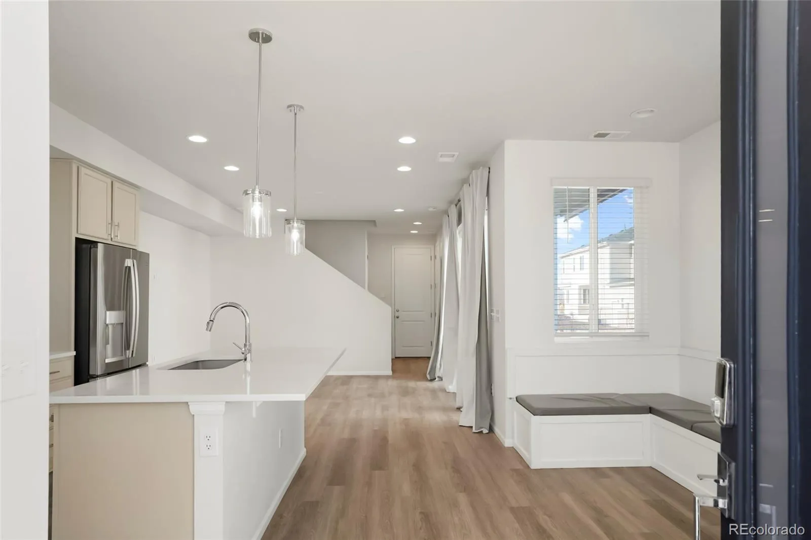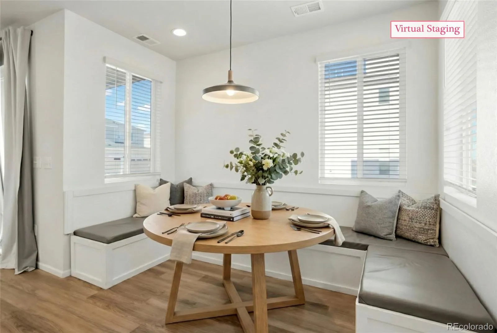 Beautiful Newer Paired Richmond built home constructed in 2022. Larger unit on interior lot with after-market upgrades. The main level hosts an Open concept with luxury vinyl plank flooring, upgraded lighting, hardware, shelving. There is an extended island, quartz counters, soft close cabinets, stone sink in the kitchen. Custom built seating with storage and up lighting in dining space. Great room/living space just off the kitchen area with access to outside patio area. Half bath, under stair storage with crawl space access and two-car finished west facing garage access. Upper level houses the spacious primary bedroom with ceiling fan, walk-in closet and an ensuite bathroom with quartz counters and added storage. The after market updates gives it a designer feel. Eastbend sub area offers a quaint open space for gatherings, family play and dog walking. Buckley air force base, children’s hospital, parks, restaurants, transit and shopping close by.