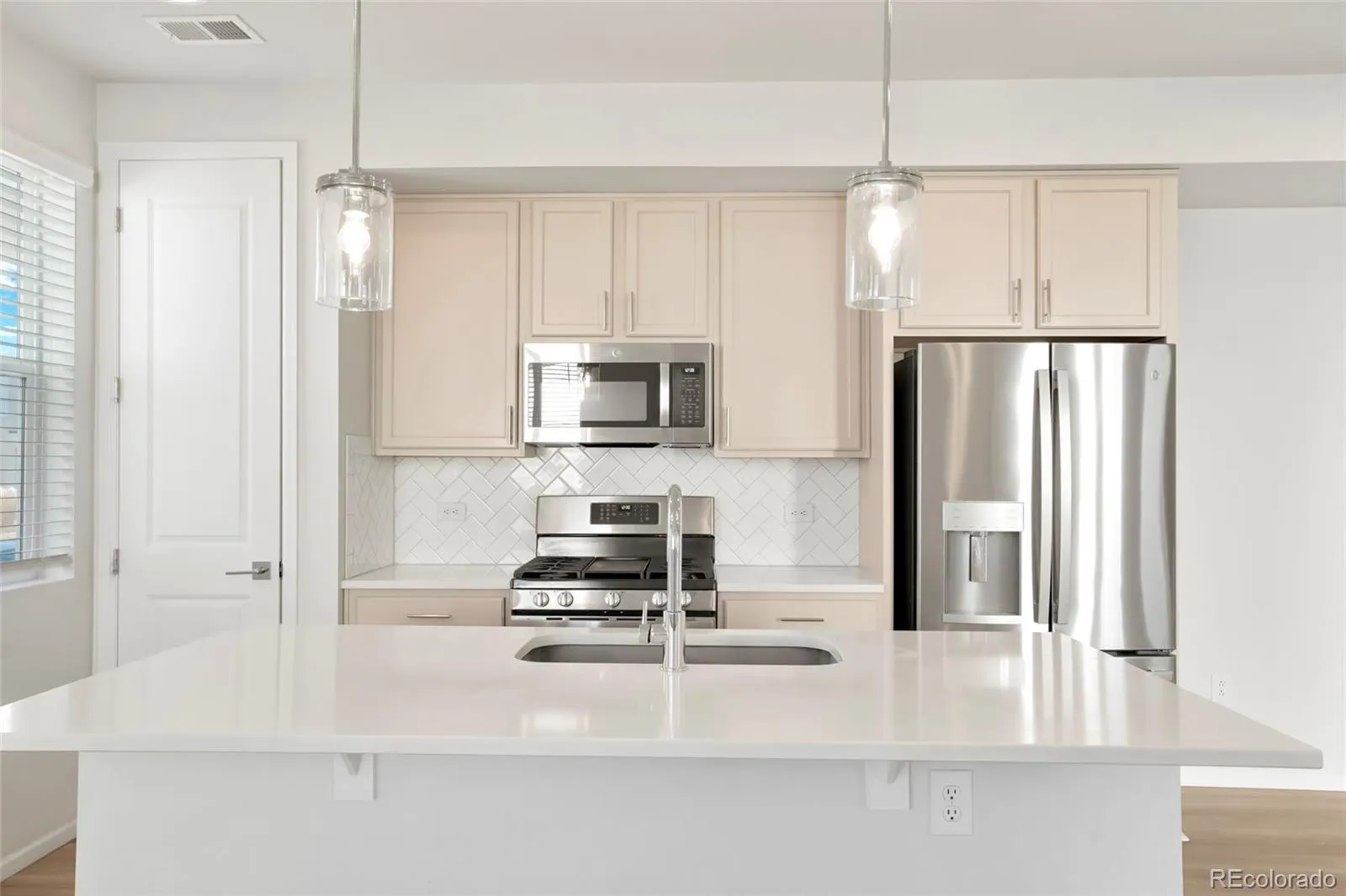 Beautiful Newer Paired Richmond built home constructed in 2022. Larger unit on interior lot with after-market upgrades. The main level hosts an Open concept with luxury vinyl plank flooring, upgraded lighting, hardware, shelving. There is an extended island, quartz counters, soft close cabinets, stone sink in the kitchen. Custom built seating with storage and up lighting in dining space. Great room/living space just off the kitchen area with access to outside patio area. Half bath, under stair storage with crawl space access and two-car finished west facing garage access. Upper level houses the spacious primary bedroom with ceiling fan, walk-in closet and an ensuite bathroom with quartz counters and added storage. The after market updates gives it a designer feel. Eastbend sub area offers a quaint open space for gatherings, family play and dog walking. Buckley air force base, children’s hospital, parks, restaurants, transit and shopping close by.