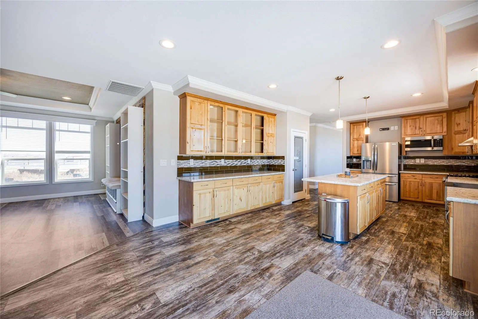 Step inside to a warm, inviting family room featuring shiplap walls, built-ins, and custom bookshelves. The gourmet kitchen impresses with a gas range, vent hood, built-in pot filler, expanded island, upgraded cabinetry, separate pantry, and abundant storage. The adjoining dining area flows seamlessly to the expansive patio with views of Pikes Peak.