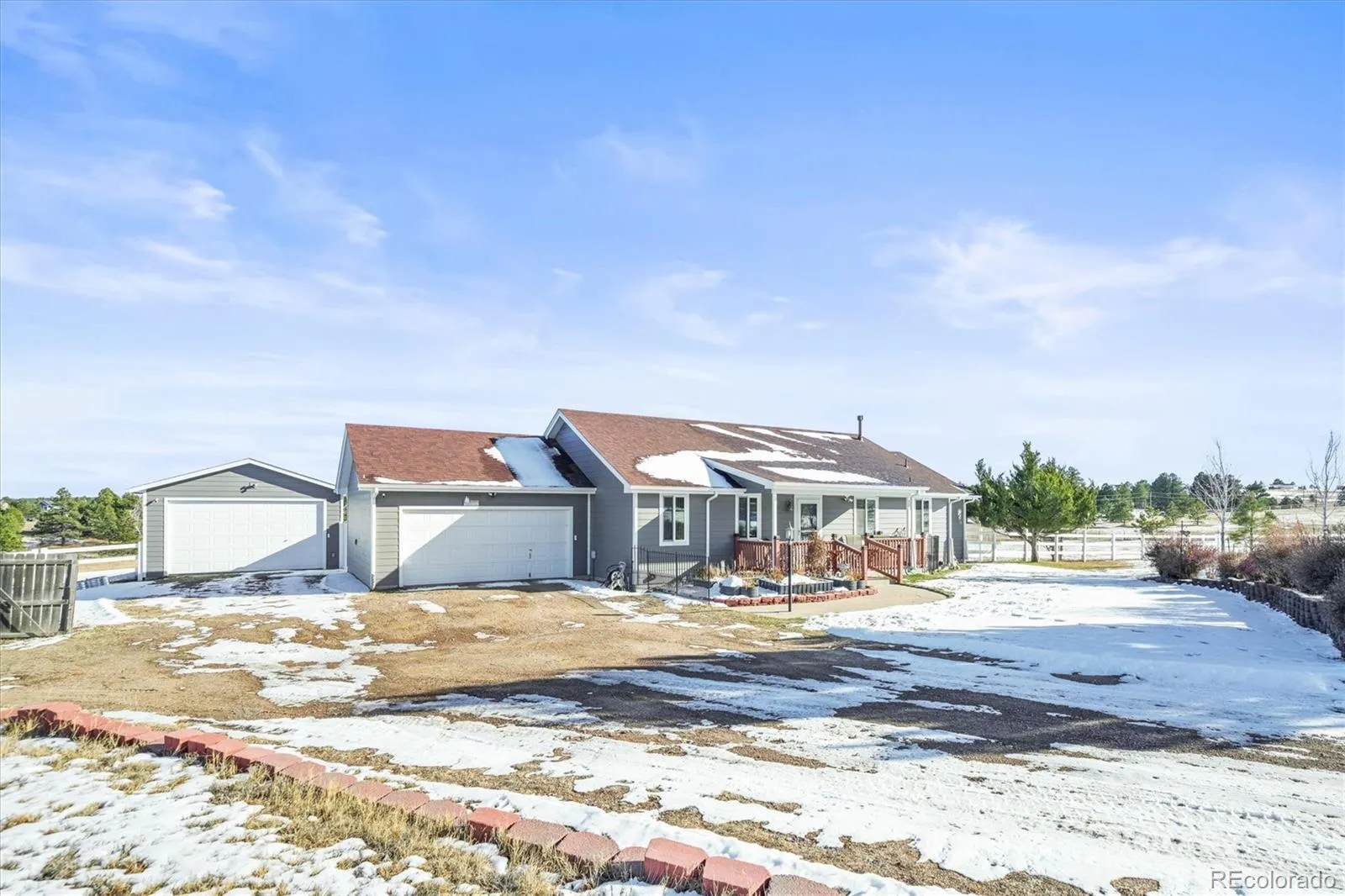 WELCOME HOME! Gorgeous ranch located in Pawnee Hills subdivision in Elizabeth, Colorado! Where peaceful country living meets everyday convenience. Situated on 5 beautiful acres, this home offers the perfect blend of open space, privacy, and easy access to amenities. Located just minutes from downtown Elizabeth, you can enjoy local shops, dining, schools, and community events without giving up the quiet, wide-open lifestyle that makes this area so special. The acreage provides plenty of room for outdoor enjoyment, future expansion, and, of course—horses are absolutely allowed! This is a perfect set up for horses- build a loafing shed and have your horses graze in the back acreage that is a fully fenced lot with all usable acreage- your dream outdoor setup! New features include roof in Dec 2024 along with gutters, soffits , and facia. New James Hardie siding and storm doors in 2024. Newer Milgard windows, stainless appliances, granite counter tops, secure gate, and 3 rail white fencing. Open kitchen with large walk in pantry. Primary bedroom has 2 good size closets and a remodeled primary bathroom. 3 bedrooms and 2 bathrooms on the main level and 2 bedrooms and bath in the basement. Large detached garage that is perfect for those wanting a work shop or room for more cars, tractors, or RV’s. This is an exceptional opportunity to own usable acreage in a prime location—perfect for anyone seeking tranquility, elbow room, and the best of Colorado country living.