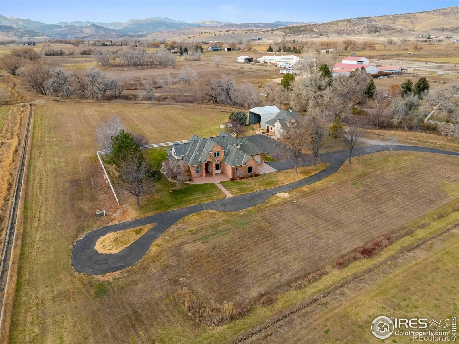 Original Owners of this magnificent 35-acre irrigated property with custom built home are now selling for the first time. The moment you approach the entrance to the property you are greeted by an iron security gate and a 900-foot-long driveway with large trees to the right while drawing your attention to the picturesque brick home with the foothills behind. The setting is magical with a majestic backdrop of Longs Peak, the foothills and the surrounding well cared for properties. With a slight breeze the hay fields wave like water while growing up to 4 feet creating a living landscape. So much thought went into the custom 4 bed, 4 bath 3743 SF home with complete main floor living including a spacious primary suite, study, formal dining, living room, large kitchen overlooking nook and family room, and a large laundry/mud room with attached 1/2 bath. 2 separate attached garages both have direct access. The upper-level features 3 additional nice sized bedrooms, 2 bathrooms, and large loft area with balcony facing west. Only the highest level of quality materials were used when the home was built. The detached 1496 SF shop/outbuilding is open with 2 large overhead doors and has additional 2nd floor of open 1039 SF that has many possibilities to create a space of what your imagination envisions. 30’x32′ hay storage building as well. This entire property shows pride of ownership, which is evident once you step foot on it. With so much to describe and not enough room, we can provide you with an additional features sheet drafted by the seller. Listing Agent must be present for showings.