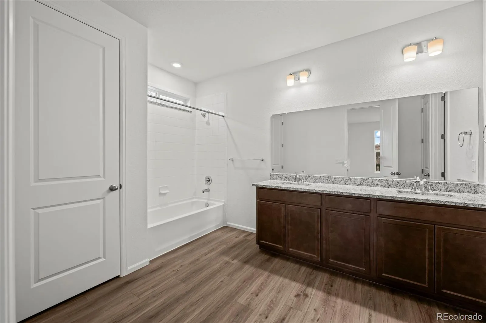 The main-floor primary suite includes a large walk-in closet and an en-suite bathroom with granite counters and LVP flooring. An office/flex room, two secondary bedrooms, full bathroom, and laundry room complete the main floor.