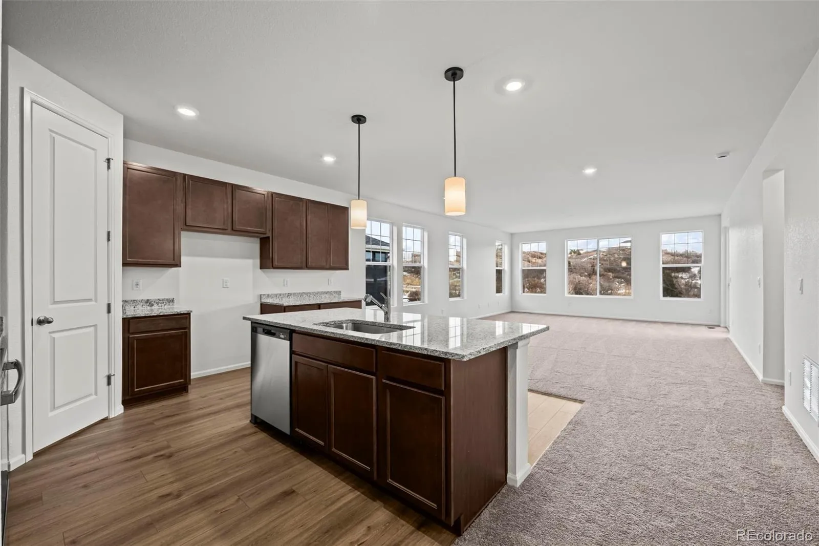 Inside, enjoy an open and inviting floorplan with high ceilings and a spacious great room that flows seamlessly to the large uncovered deck—an ideal extension of your living and entertaining space. The eat-in kitchen features a large center island, 42” truffle-stained hardwood cabinets, granite counters, and GE Profile stainless steel electric range, dishwasher, and microwave.
