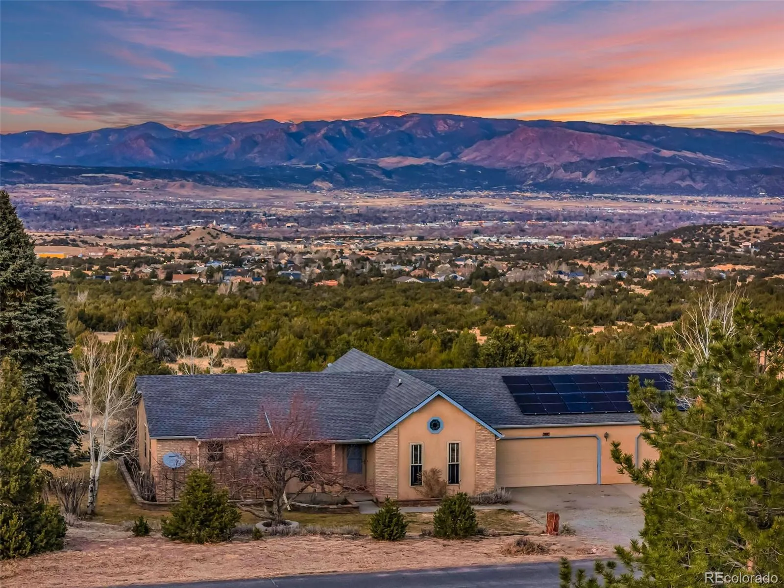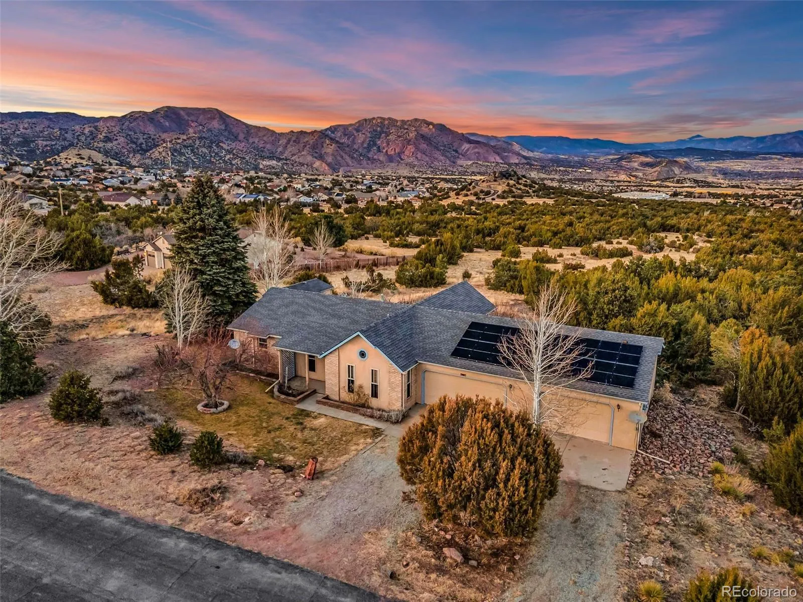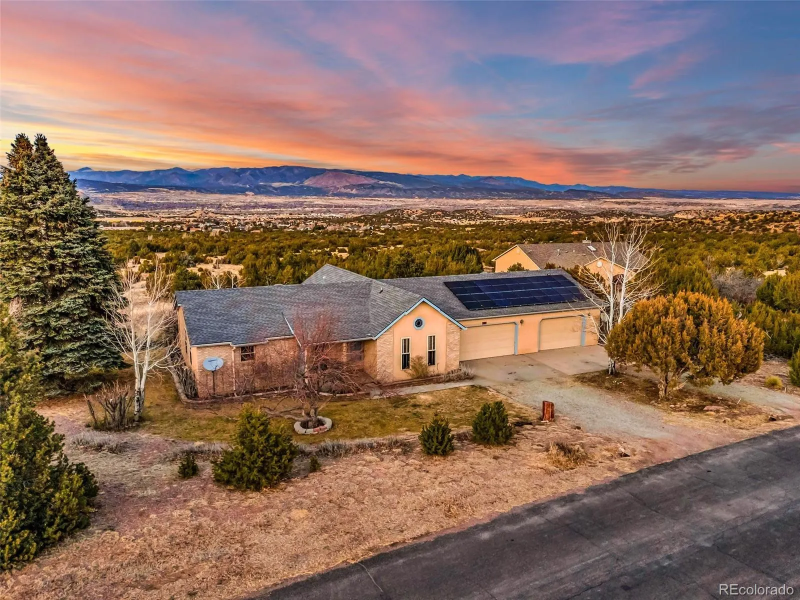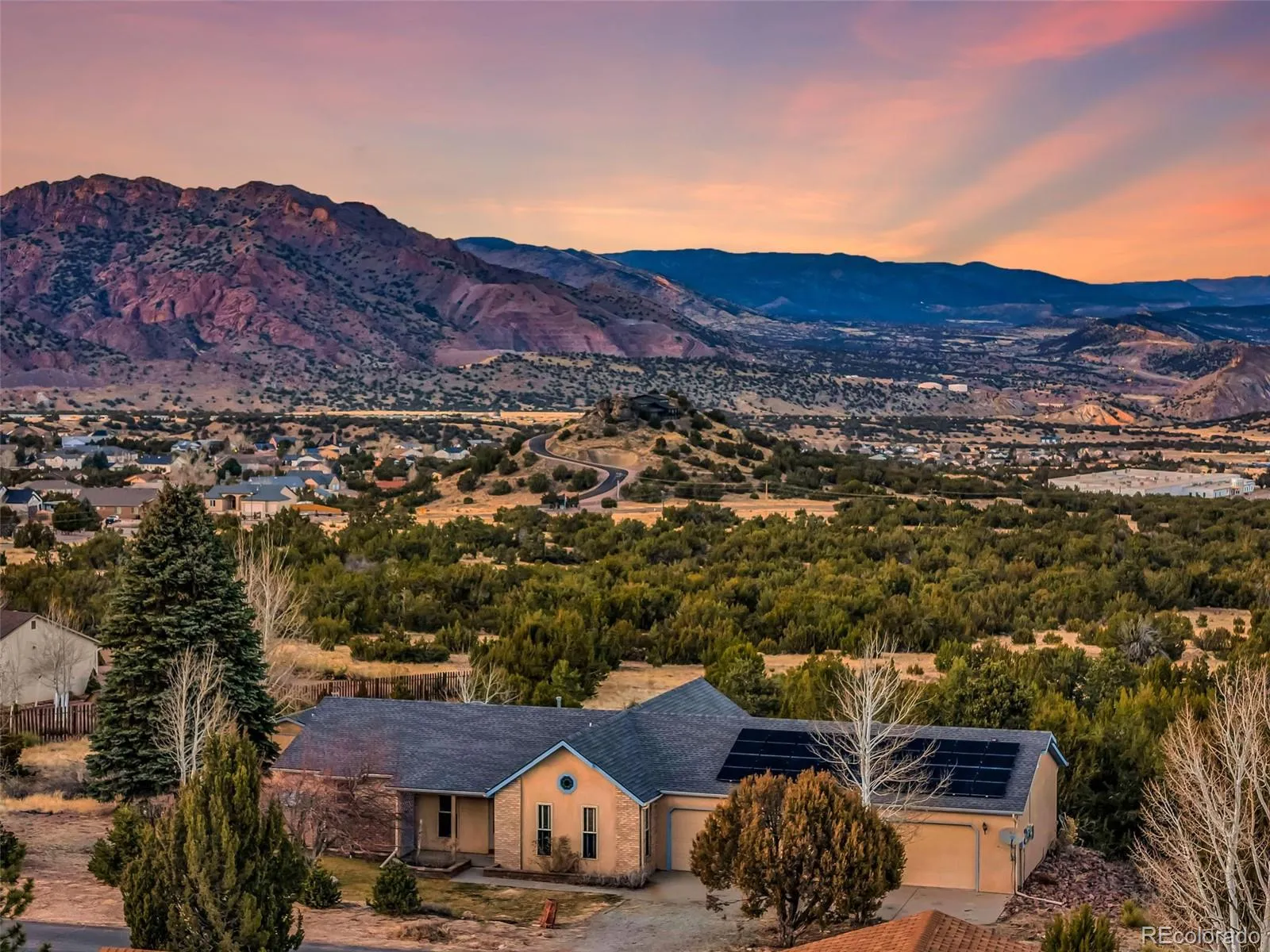 Do not miss this wonderfully maintained 3 bedroom, 2 bathroom home with oversized 3-car garage plus bonus workshop with skylight and a 1.5 acre property, perched in the southern foothills of Canon City with 360-degree mountain views overlooking the Arkansas River Valley and Pikes’s Peak! Step inside and be welcomed into the spacious living room with vaulted ceilings, cozy gas fireplace with marble backsplash, updated luxury vinyl flooring, and a picture window framing the most incredible mountain view. Spend your days relaxing and watching the ever-changing skies from the oversized covered back deck/patio with built-in bench in absolute peace and quiet. Fenced back yard with pergola, rock and astroturf, dog run, and dog door from studio/workshop, along with sprinkler system in the front lawn to support the wonderful lawn lined with honeysuckle, roses, Aspen trees, pines, native plum, nanking cherry, flowering crabapple, butterfly bush, Russian sage, and other perennial delights; making the outdoor space just as lovely as the interior. You will love the functional and beautiful kitchen/dining combo with tile flooring, updated hickory-wood cabinetry, custom built-in pantry with pullout drawers, and dark stainless steel kitchen appliances with 5-burner gas oven/range—all included! The primary bedroom features an ensuite bathroom complete with jetted tub, separate walk-in shower, walk-in closet, and skylight for a bright and airy feel. Very low electric utility costs with an included solar-system (2022), along with more recent updates including a Class-4 roof (installed 2019), furnace and A/C unit (2019), and new hot water heater (2024). Blink cameras, gun safe, and shed with cement floor are also included, with additional storage in the workshop attic. Move-in ready for its next lucky owner, this special home is just the one you’ve been waiting for!
