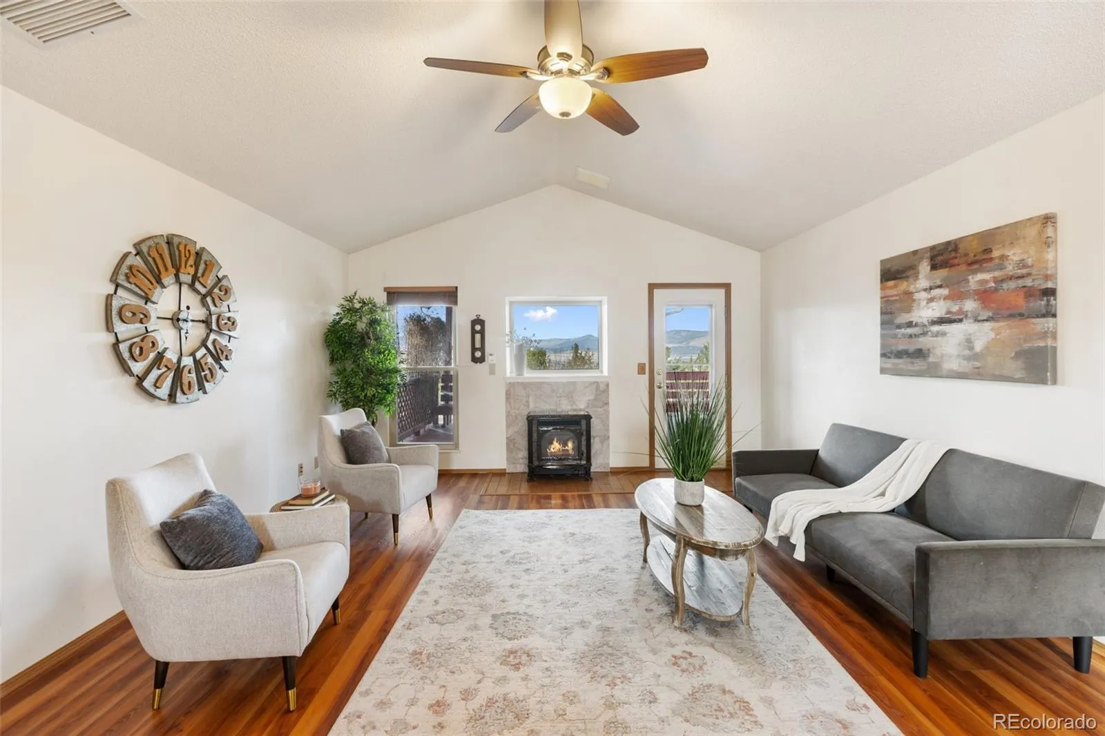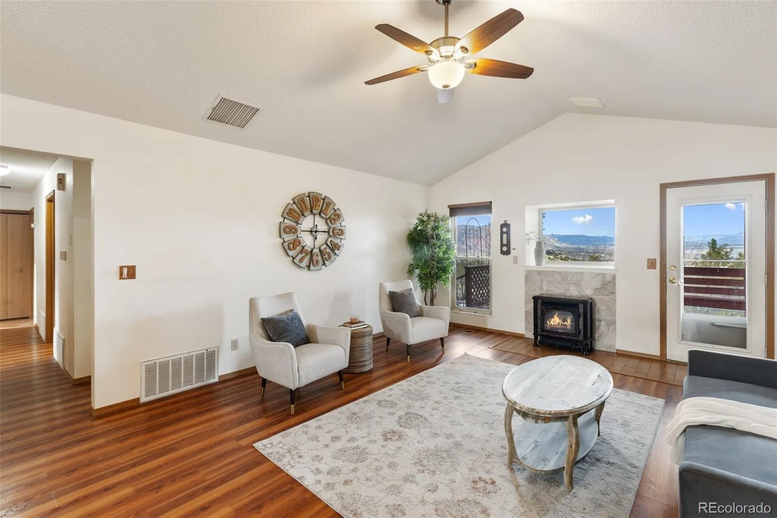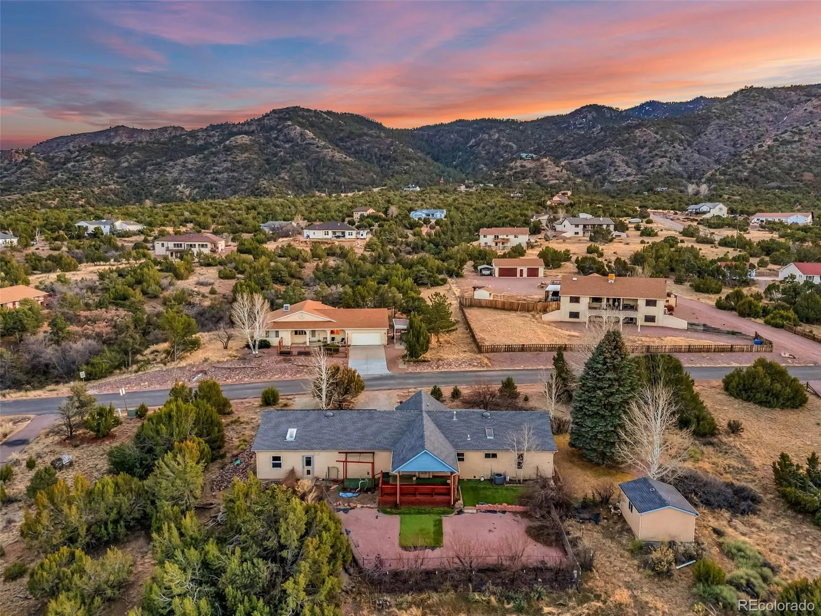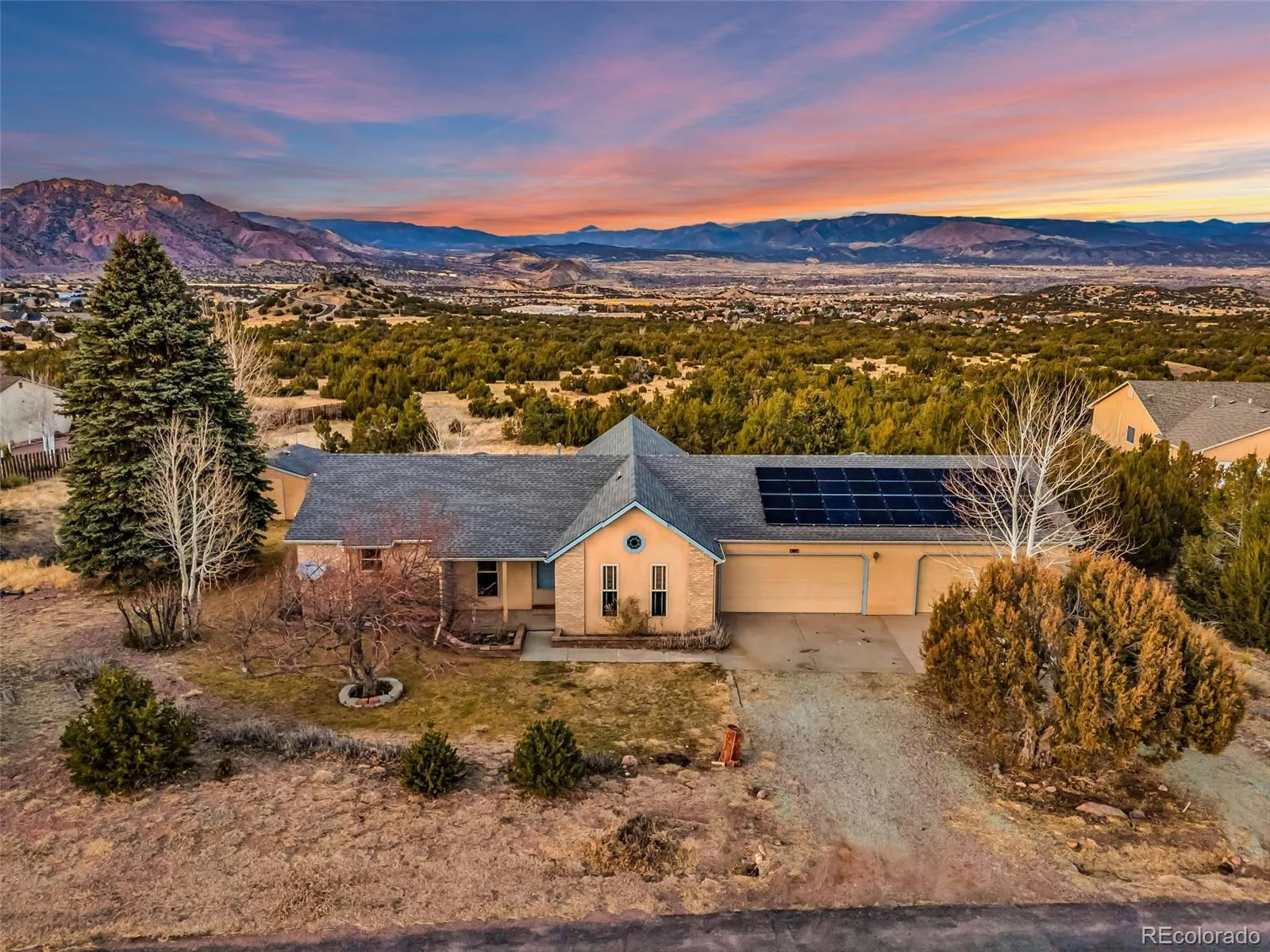 Do not miss this wonderfully maintained 3 bedroom, 2 bathroom home with oversized 3-car garage plus bonus workshop with skylight and a 1.5 acre property, perched in the southern foothills of Canon City with 360-degree mountain views overlooking the Arkansas River Valley and Pikes’s Peak! Step inside and be welcomed into the spacious living room with vaulted ceilings, cozy gas fireplace with marble backsplash, updated luxury vinyl flooring, and a picture window framing the most incredible mountain view. Spend your days relaxing and watching the ever-changing skies from the oversized covered back deck/patio with built-in bench in absolute peace and quiet. Fenced back yard with pergola, rock and astroturf, dog run, and dog door from studio/workshop, along with sprinkler system in the front lawn to support the wonderful lawn lined with honeysuckle, roses, Aspen trees, pines, native plum, nanking cherry, flowering crabapple, butterfly bush, Russian sage, and other perennial delights; making the outdoor space just as lovely as the interior. You will love the functional and beautiful kitchen/dining combo with tile flooring, updated hickory-wood cabinetry, custom built-in pantry with pullout drawers, and dark stainless steel kitchen appliances with 5-burner gas oven/range—all included! The primary bedroom features an ensuite bathroom complete with jetted tub, separate walk-in shower, walk-in closet, and skylight for a bright and airy feel. Very low electric utility costs with an included solar-system (2022), along with more recent updates including a Class-4 roof (installed 2019), furnace and A/C unit (2019), and new hot water heater (2024). Blink cameras, gun safe, and shed with cement floor are also included, with additional storage in the workshop attic. Move-in ready for its next lucky owner, this special home is just the one you’ve been waiting for!