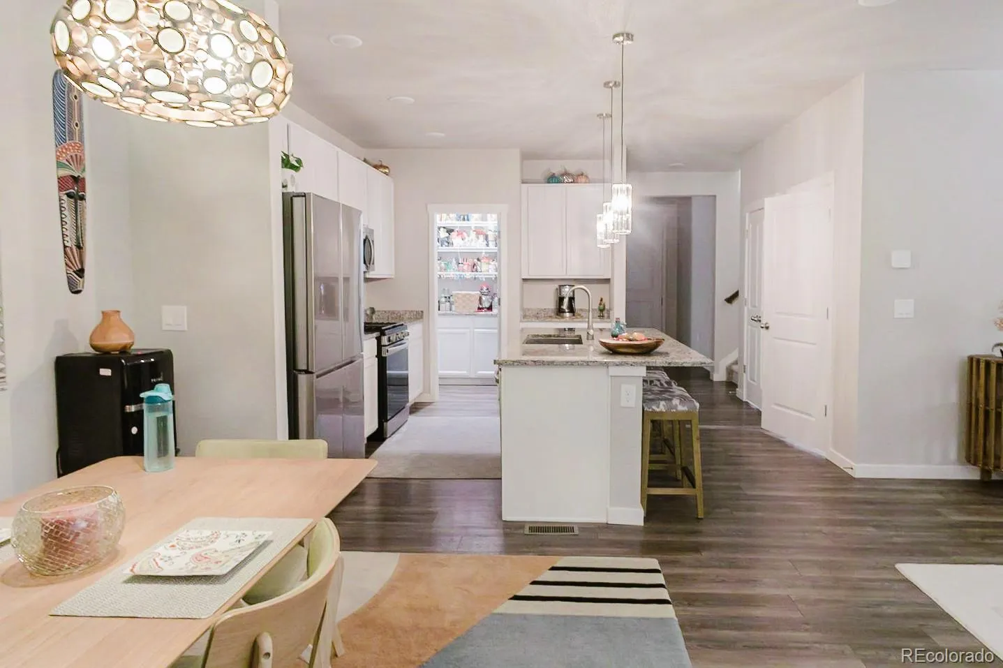 There are easy-care engineered wood floors throughout the main level, high ceilings and oversized windows that flood the home with light.