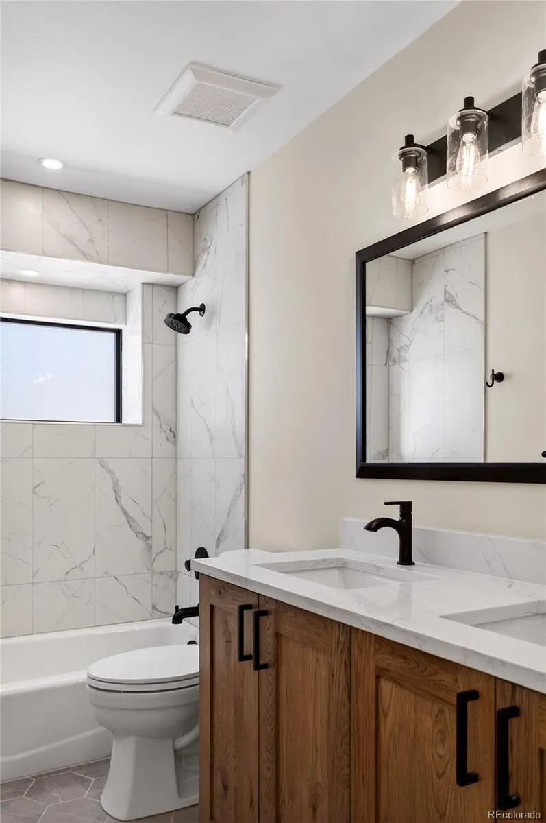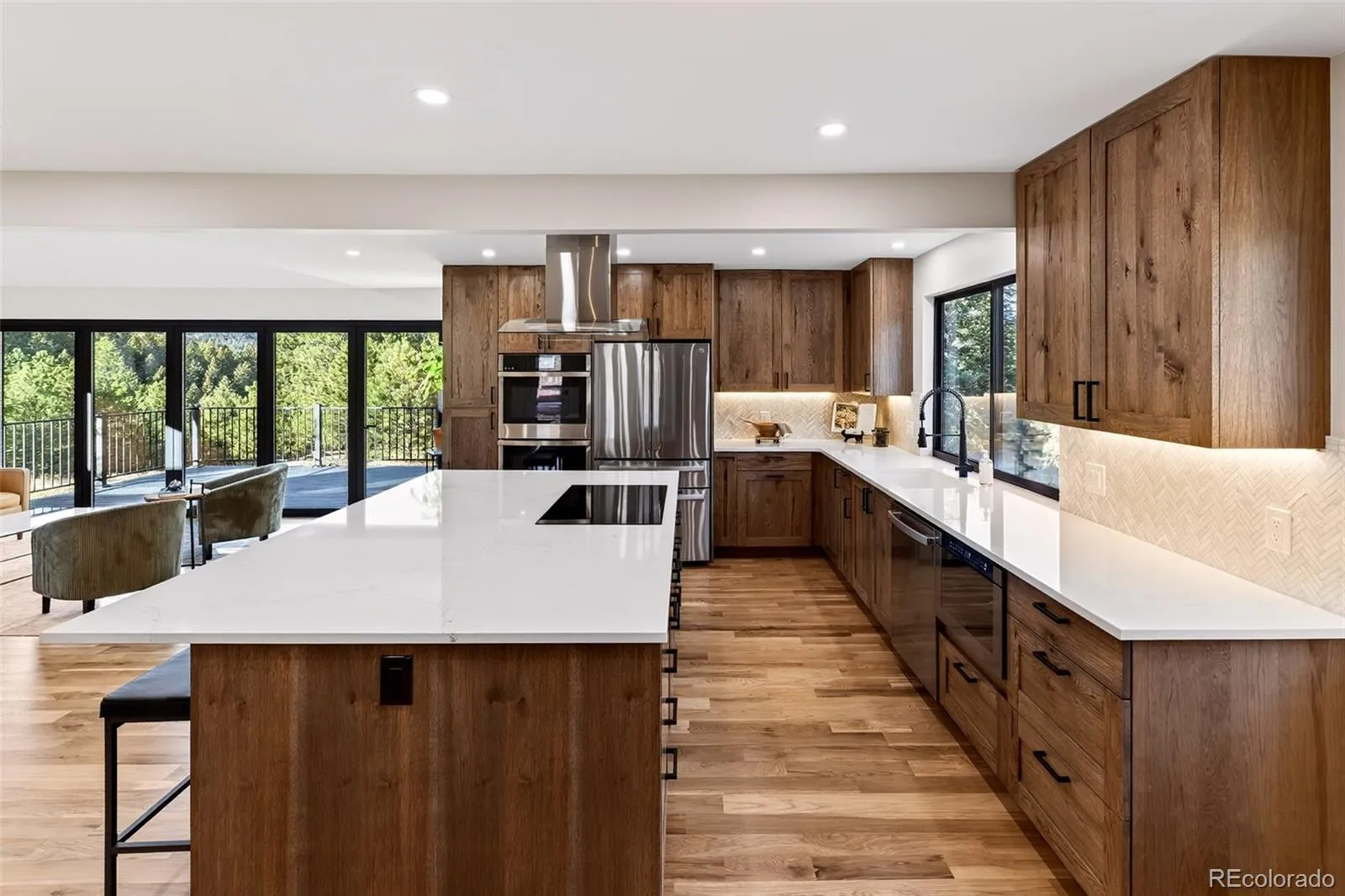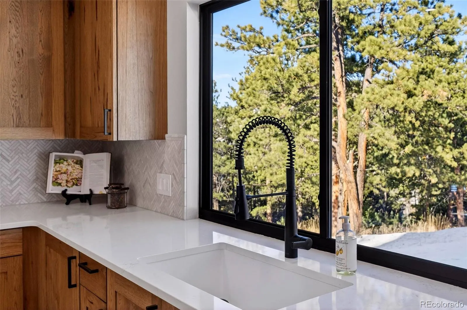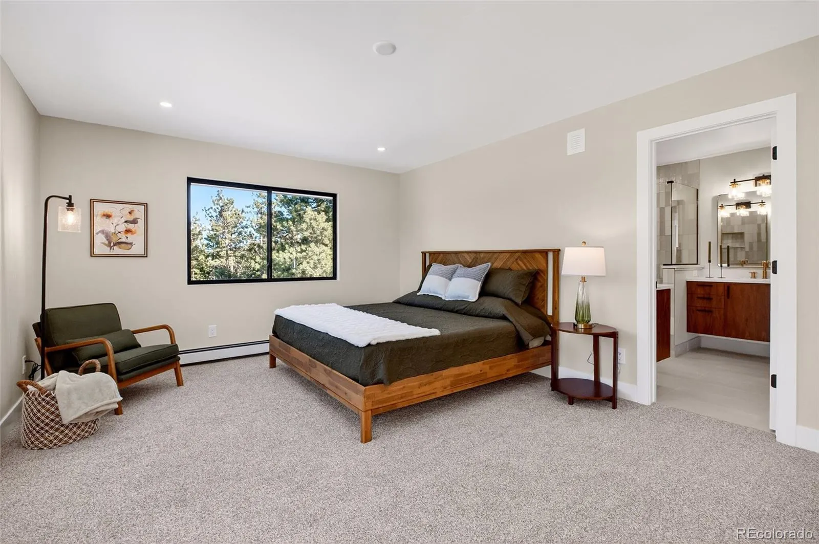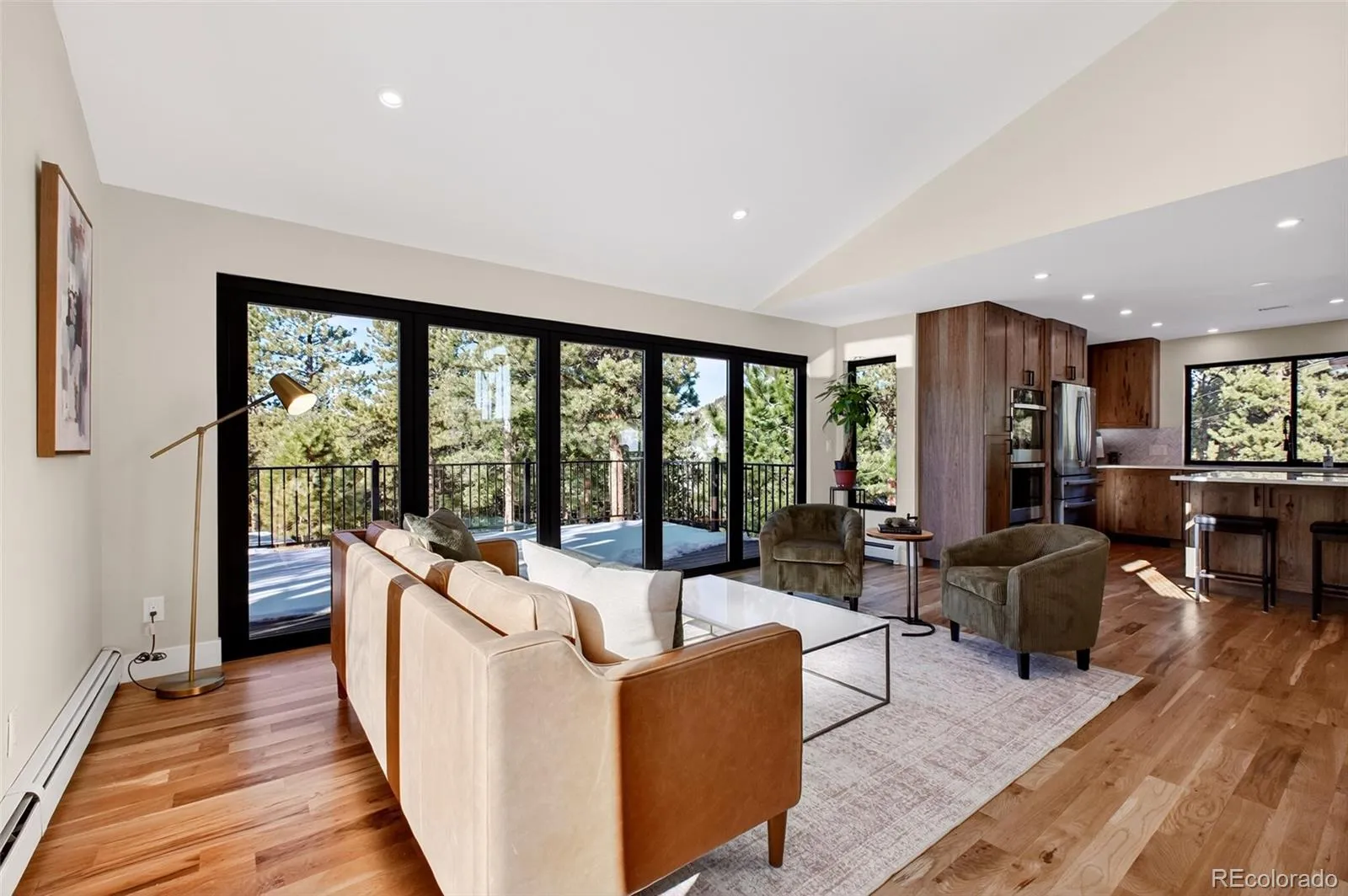 Post modernism architecture meets the finishes of new construction. Elegant open concept vaulted great room features metal banister staircase and a moving glass wall system that provides a wall of windows to the mountain views, or a completely open wall to extend the living room out onto the new Trex deck. Open concept kitchen provides a large island, Custom cabinetry, Coffee Bar, and A walk in Pantry. NEW Stainless appliances include induction cook top, range hood, and drawer microwave. Solid quartz counters offer expansive workspace. Large main level laundry doubles as a mud room. Primary suite is a bright escape with windows on three walls! Prewired for ceiling fan. Ensuite bathroom with walk in shower, two separate vanities for added storage and a smart toilet. Pocket door to the large walk-in closet. Two additional bedrooms and a second bathroom, also with dual sinks, complete the upper level. Hardy board siding for longevity and low maintenance. LED lighting throughout and Energy Star Certified New windows create a highly efficient living space. Wide panel, white oak plank flooring throughout the main level. Cozy carpeting up the stairs and in the bedrooms. A mountain home with Air Conditioning! NEW boiler and baseboard hot water heat also for those with a preference for the quiet and hypoallergenic benefits of baseboard radiant heating. New roof in 2025 with Class IV Impact resistant shingles. Large open finished walk-out basement complete with a fourth bathroom. Updated Electrical and all NEW Plumbing! This 17-acre Horse Property has combined topography including rolling meadow and forested hillside to the back. The front meadow is home to a seasonal pond. County maintained road provides year-round access. And closeness of the highway allows for great commute times: 17 minutes to Red Rocks Amphitheatre, 34 minutes to downtown Denver. Much easier drive if you follow directions in this listing rather than GPS.