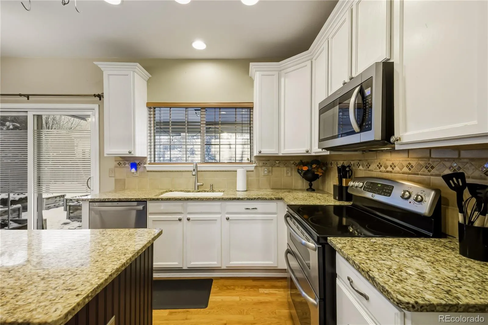 Tucked away in The Enclave at Saddle Rock Ridge, this cozy home is a serene escape. With 5 bedrooms and 3.5 bathrooms, this generous floor plan offers versatile layout options, complete vaulted ceilings, grand living and dining rooms. The gorgeous kitchen boasts an open-concept design and oversized island, perfect for hosting an evening soiree or cooking a spread for family dinner. Additionally, the kitchen seamlessly connects to a family room with a gas fireplace and built-in shelves. For optimal convenience, a flexible office space and newly updated half bath are located on the main level, with stylish tiled floors and shiplap feature wall. On the upper level of the home, find 4 comfortable and spacious bedrooms, 2 bathrooms, and a laundry room. The primary suite offers an ensuite bathroom, serving as a beautiful space for relaxation. The finished basement is outfitted with guest quarters, featuring an additional bedroom and bathroom, and an expansive multi-purpose recreational room. The secluded backyard is a gardener’s paradise and peaceful oasis, with custom raised beds, well-manicured landscaping, covered patio, and lush green space. Located in a centralized location, you’ll gain easy access to Denver International Airport, the Denver Tech Center, Cherry Creek State Park and the Aurora Reservoir, and premier shopping, dining, and entertainment.