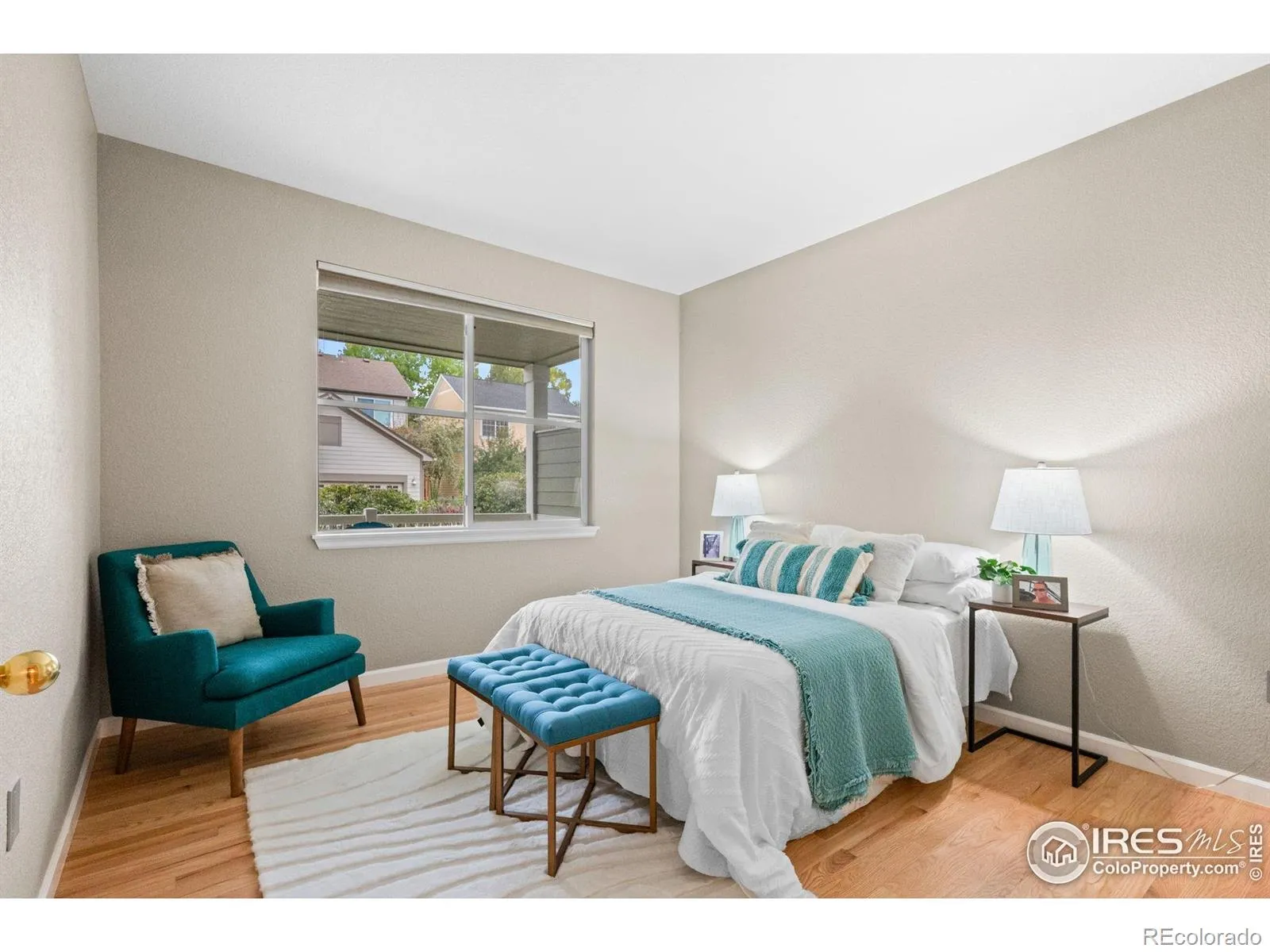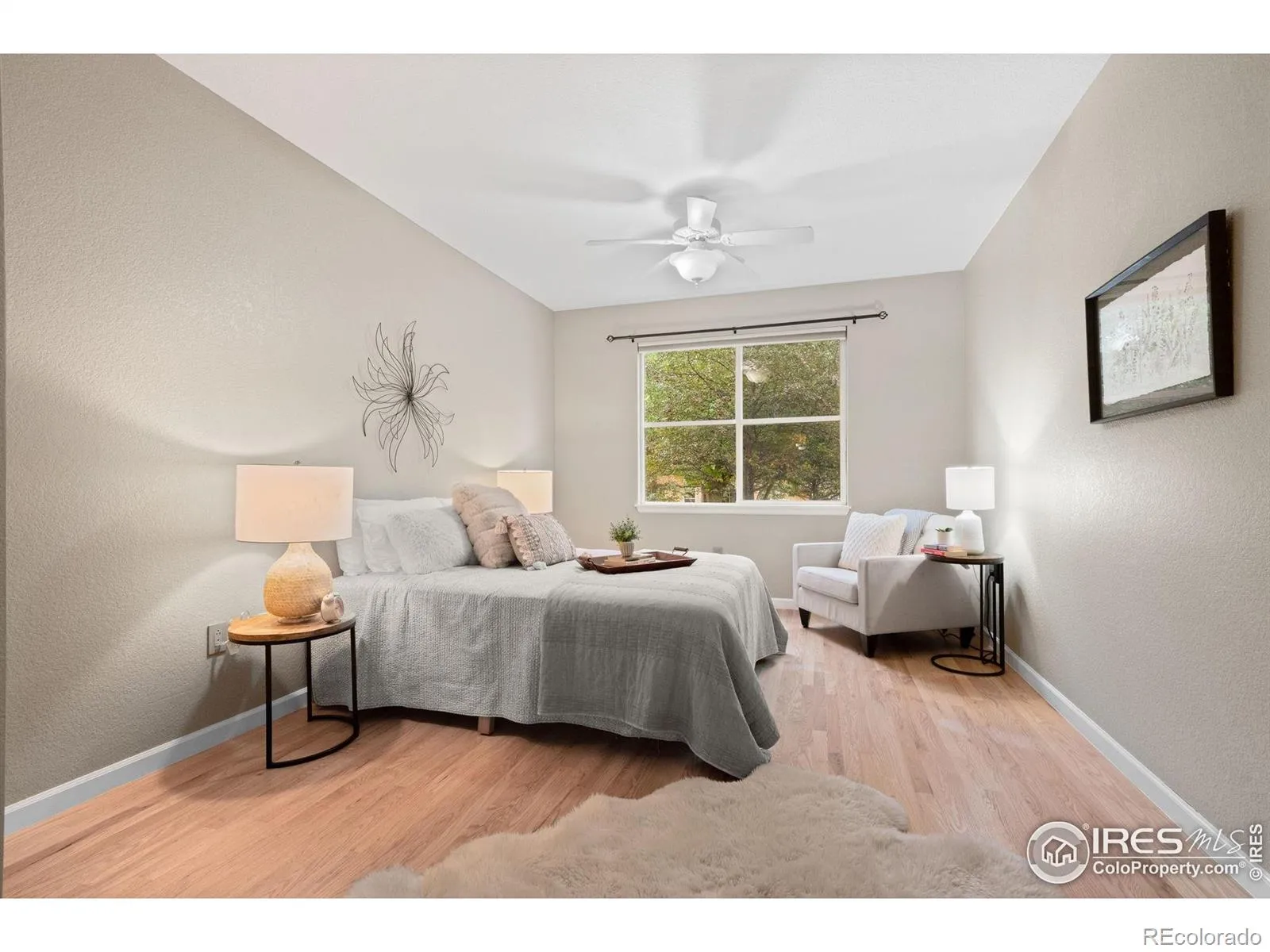LOCATED IN SOUTHWEST LONGMONT, EASY ACCESS TO BOULDER. Sunny ground-floor corner unit with excellent natural light from 3 of the four walls. Not a stair or a step in this freshly updated 3-bedroom and 2-bath condo. The updates include modern white kitchen cabinets and newly refinished hardwood floors throughout; no “lived-in” carpeting to deal with. Open and easy to entertain between the kitchen, dining, and living areas. The master bedroom is spacious, with ample closet space, and is light and bright with a crawl space in the closet. The master bath features a tub/shower surround and a large vanity with ample storage space. The second bedroom has a large walk-in closet, and with lots of natural light, the third bedroom can also be used as a home office for the work-from-home professional. The main bath also features a tub/shower surround and a spacious vanity. The detached single-car garage is just steps away from the unit and includes shelving for additional storage-located in the highly desired St. Vrain Valley School District. The unit also includes an ample, fenced outdoor space, landscaped with low maintenance in mind, that provides a nice, private place to entertain in warmer months. Close to shopping at Village of the Peaks, Whole Foods Market, and Target. This lovely home is ready to move in and enjoy!