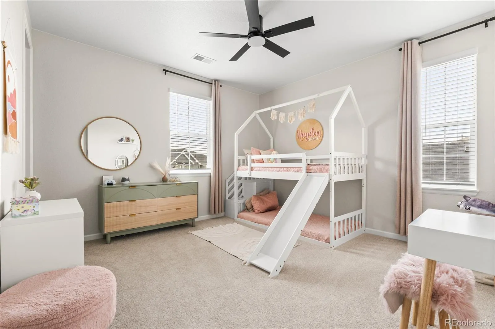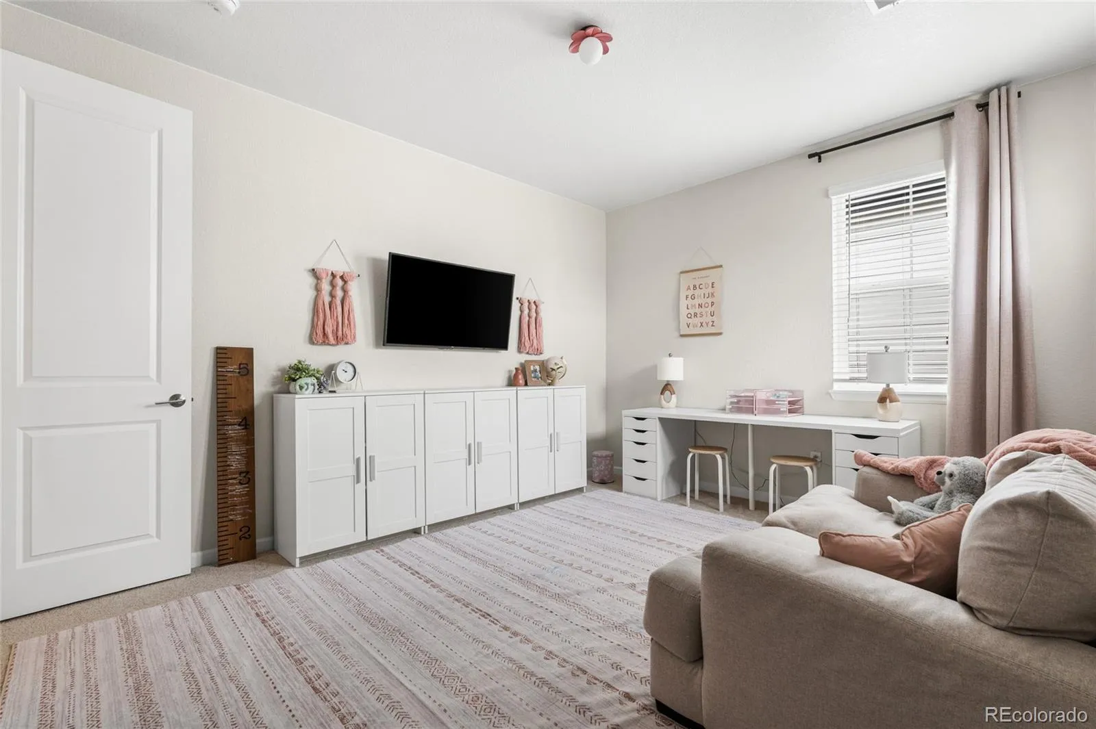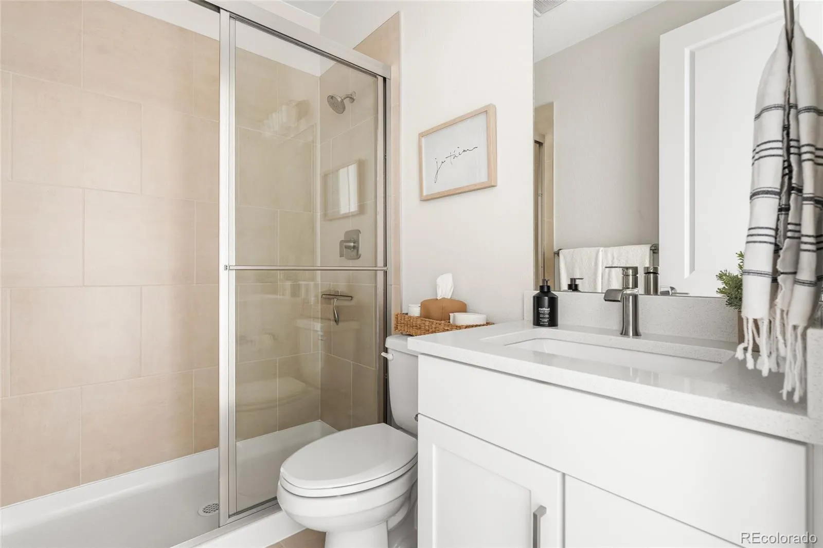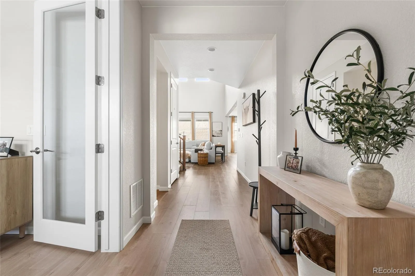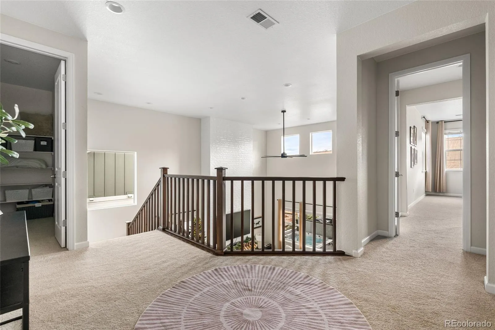 The newly finished backyard is an entertainer’s dream, featuring an outdoor kitchen with built-in gas grill, stamped concrete patio with gas fireplace, low-maintenance turf yard, private hot tub, and serene open-space views. Inside, the main level showcases a spacious kitchen island, generous pantry and owner’s entry storage, floor-to-ceiling tiled fireplace, high-end lighting, board-and-batten office, and renovated powder bath. A private guest suite with full bath completes the main floor.