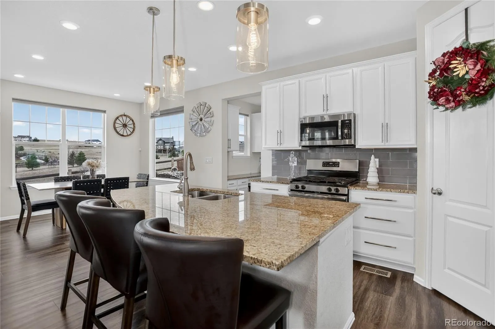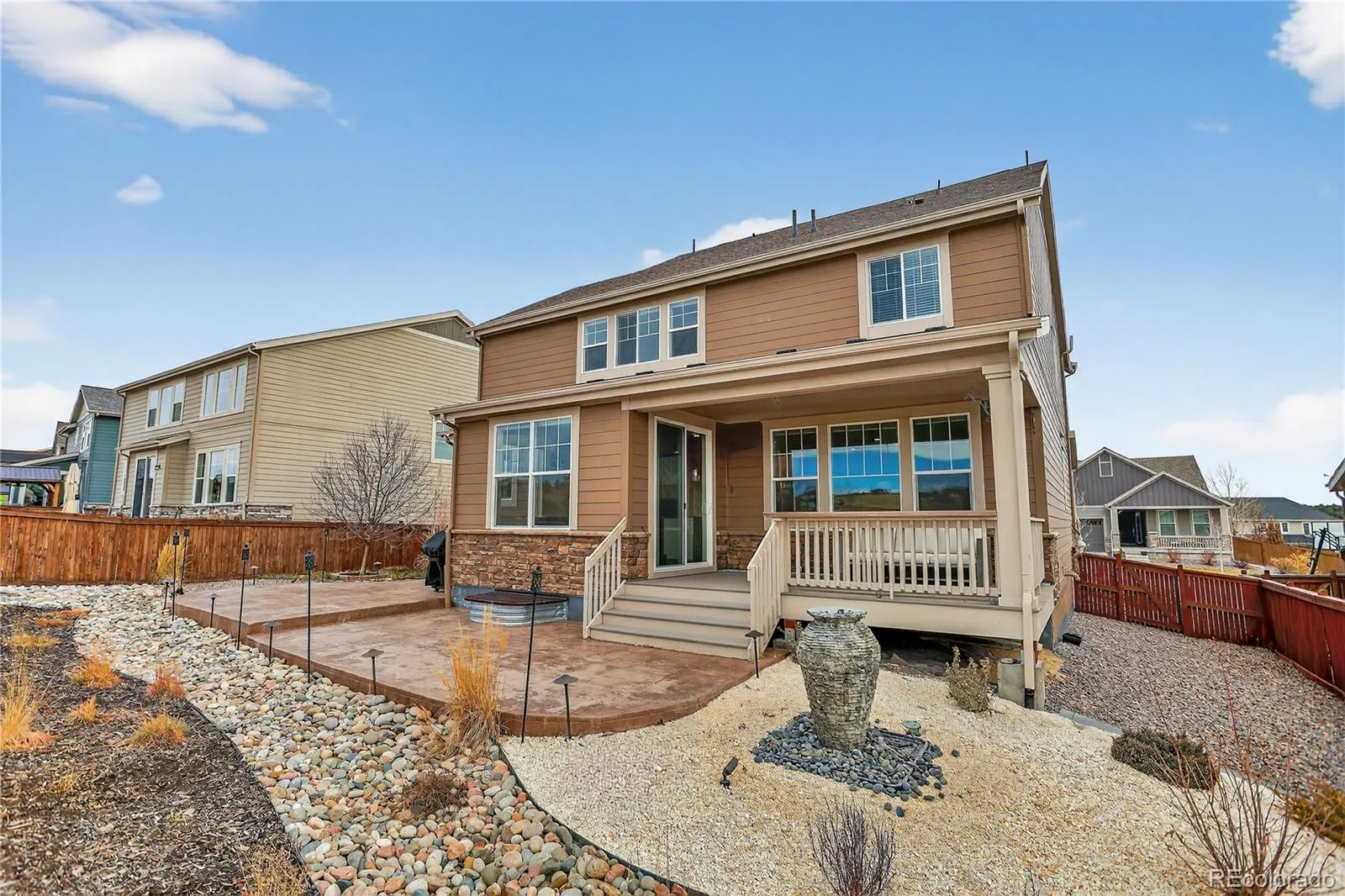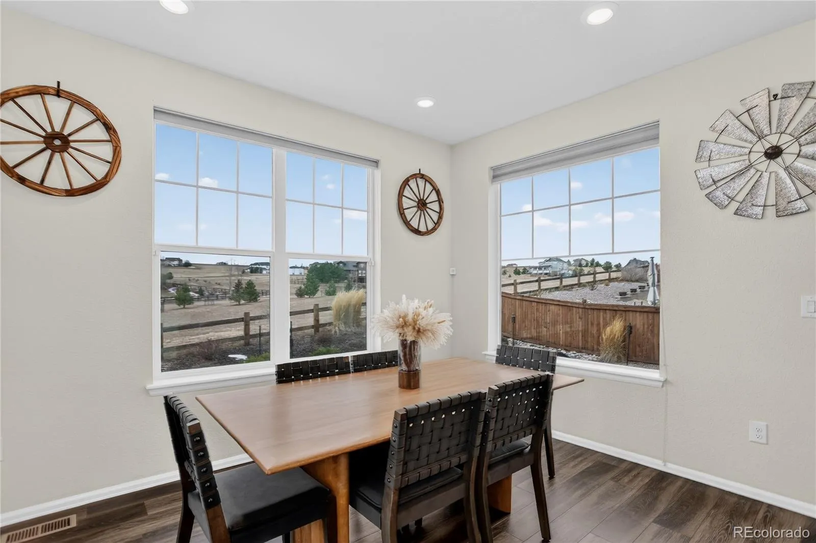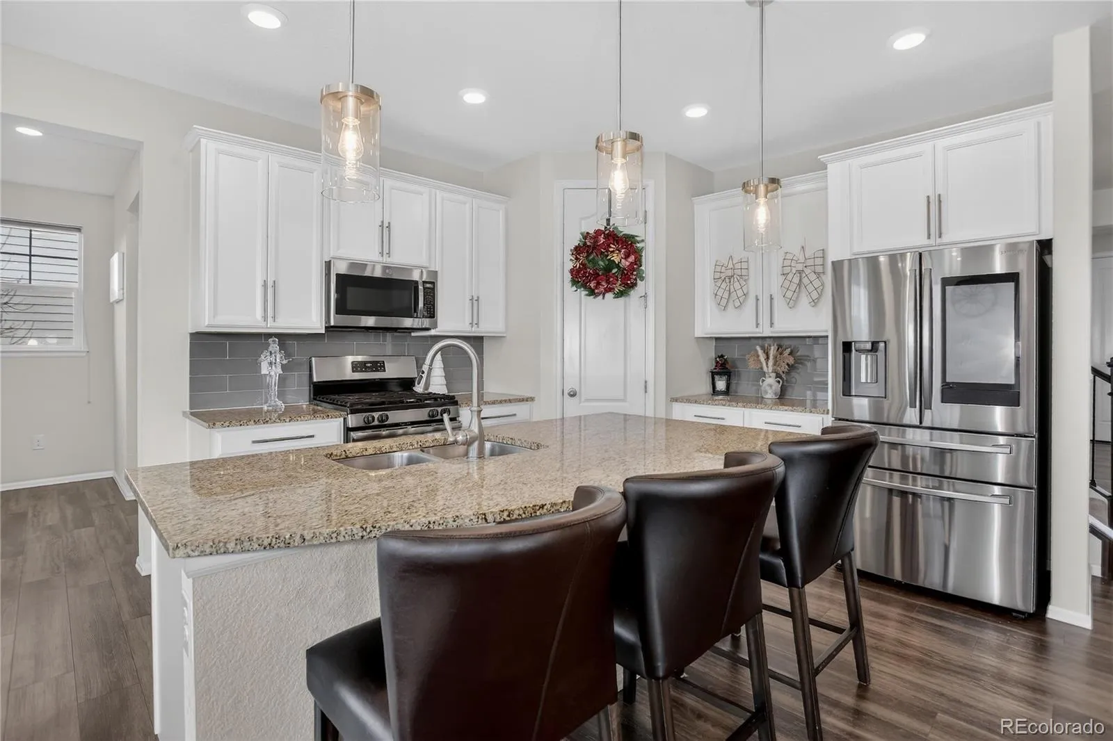 Move-in ready 2-story with rare 4-car garage, that backs to a 5-acre parcel! This home features 9′ ceilings and LVP throughout the main level…expansive views out the wall of windows in the large living and dining rooms…kitchen with 42″ white cabinets with crown molding, granite counters, subway tile backsplash, counter bar island with SS sink and decorator pendant lighting, corner pantry, ample recessed lighting and all SS appliances including gas range and newer touch screen French door fridge… 10’X6′ built-in desk area off the garage…office/flex space overlooking the covered front porch…and convenient powder bath with pedestal sink. Upstairs, you’ll find the 15’X15′ primary suite with window wall and serene views, tray ceiling and ensuite bath with double sinks, lowered makeup vanity, roomy shower and 7’x10′ walk-in closet…3 large additional bedrooms…one with an ensuite full bath, and two with walk-in closets and an expanded connecting Jack & Jill bath…and laundry room. The 1,216sqft unfinished basement offers 9′ ceilings, bath rough in, dual AC systems and so many possibilities for finishing the space. Outside, you’ll enjoy all the amenities of the thoughtfully landscaped backyard…17’X10′ covered deck with custom live edge bar top, sun shades and rolling gate (perfect to help manage small children or pets)…multi-level stamped concrete patio…several water features…dog run…automated landscape lighting…and shaded front porch for those hot summer afternoons. 3 houses down from the playground at Gold Creek Valley Park, .6 miles to Walmart and less than 2 miles to the center of the Town of Elizabeth, too!