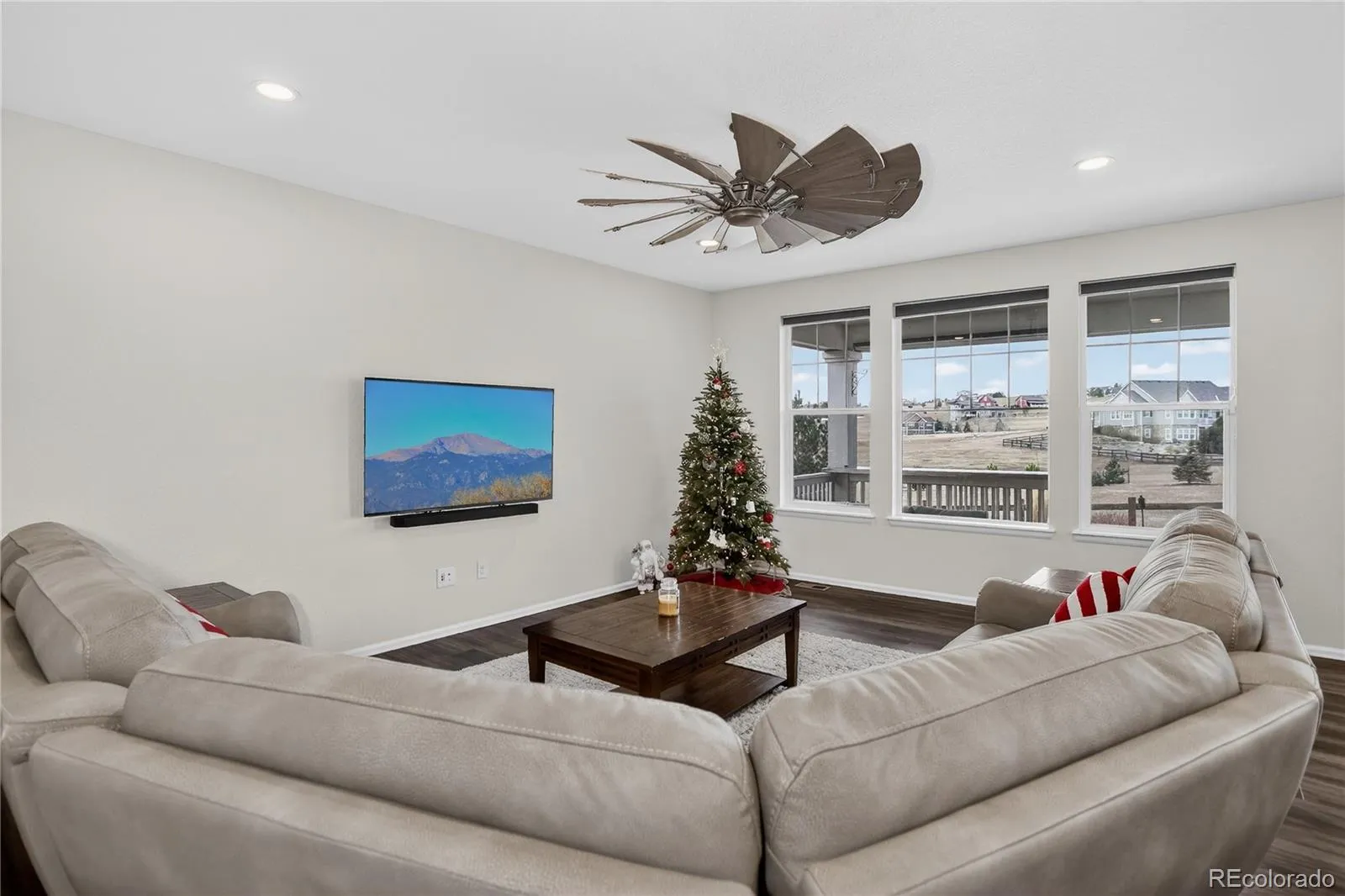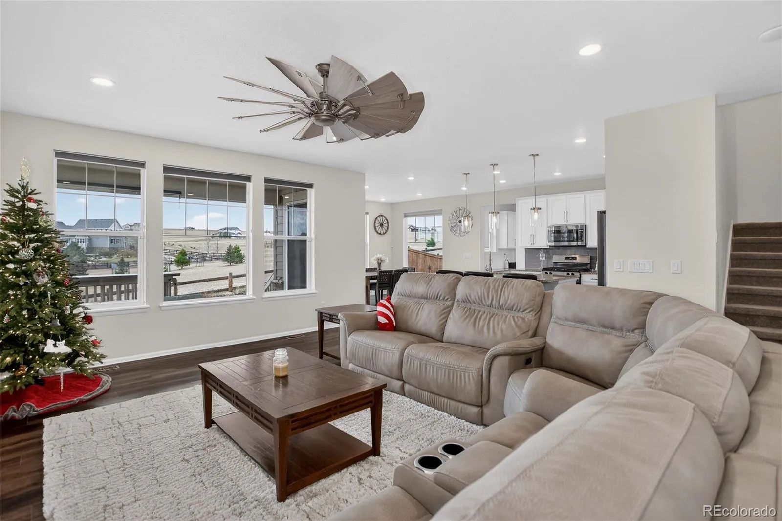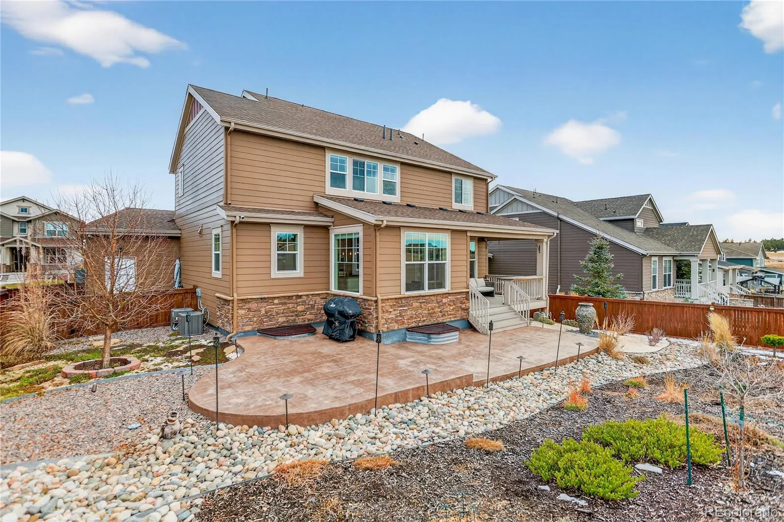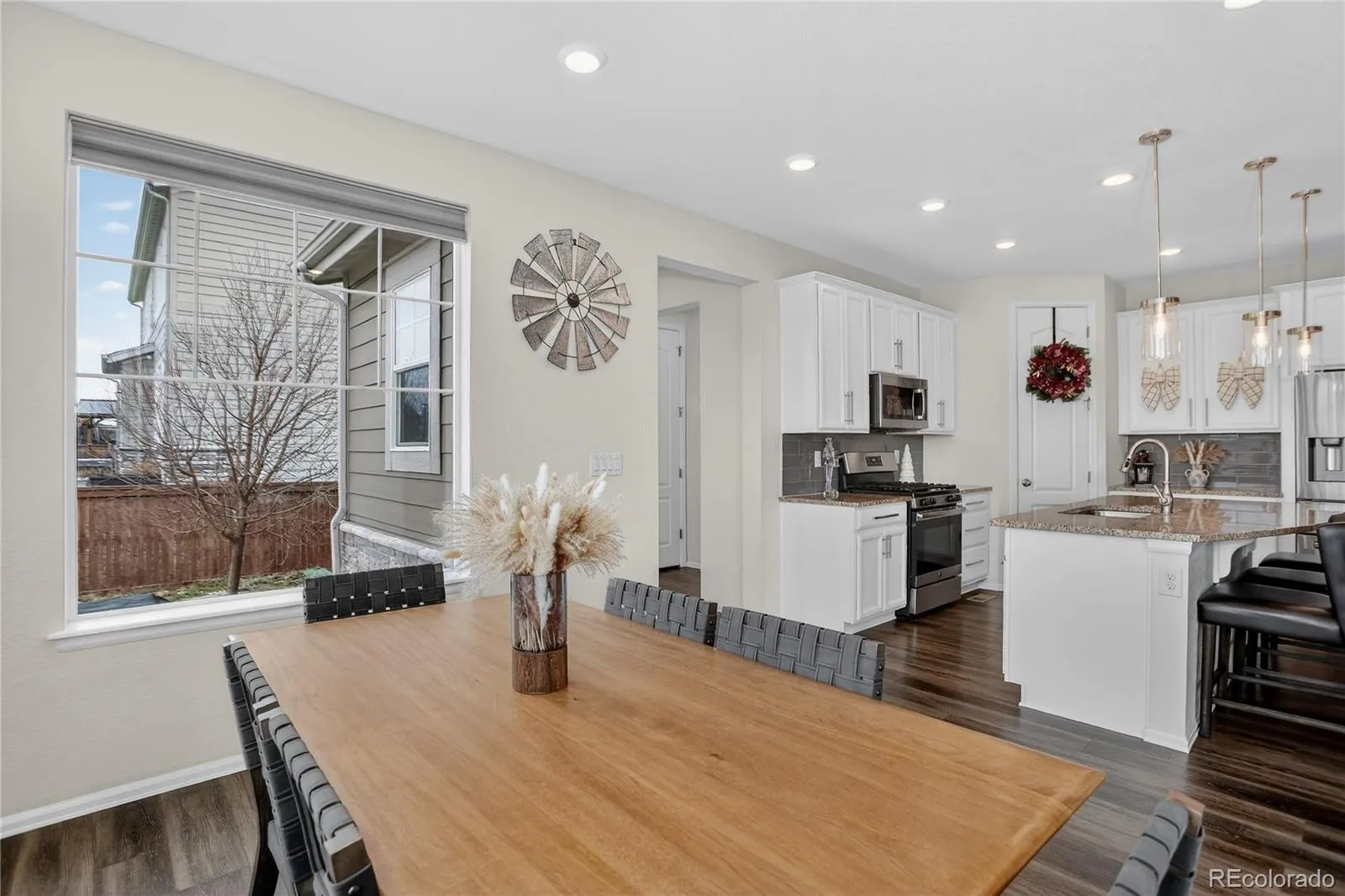 Move-in ready 2-story with rare 4-car garage, that backs to a 5-acre parcel! This home features 9′ ceilings and LVP throughout the main level…expansive views out the wall of windows in the large living and dining rooms…kitchen with 42″ white cabinets with crown molding, granite counters, subway tile backsplash, counter bar island with SS sink and decorator pendant lighting, corner pantry, ample recessed lighting and all SS appliances including gas range and newer touch screen French door fridge… 10’X6′ built-in desk area off the garage…office/flex space overlooking the covered front porch…and convenient powder bath with pedestal sink. Upstairs, you’ll find the 15’X15′ primary suite with window wall and serene views, tray ceiling and ensuite bath with double sinks, lowered makeup vanity, roomy shower and 7’x10′ walk-in closet…3 large additional bedrooms…one with an ensuite full bath, and two with walk-in closets and an expanded connecting Jack & Jill bath…and laundry room. The 1,216sqft unfinished basement offers 9′ ceilings, bath rough in, dual AC systems and so many possibilities for finishing the space. Outside, you’ll enjoy all the amenities of the thoughtfully landscaped backyard…17’X10′ covered deck with custom live edge bar top, sun shades and rolling gate (perfect to help manage small children or pets)…multi-level stamped concrete patio…several water features…dog run…automated landscape lighting…and shaded front porch for those hot summer afternoons. 3 houses down from the playground at Gold Creek Valley Park, .6 miles to Walmart and less than 2 miles to the center of the Town of Elizabeth, too!
