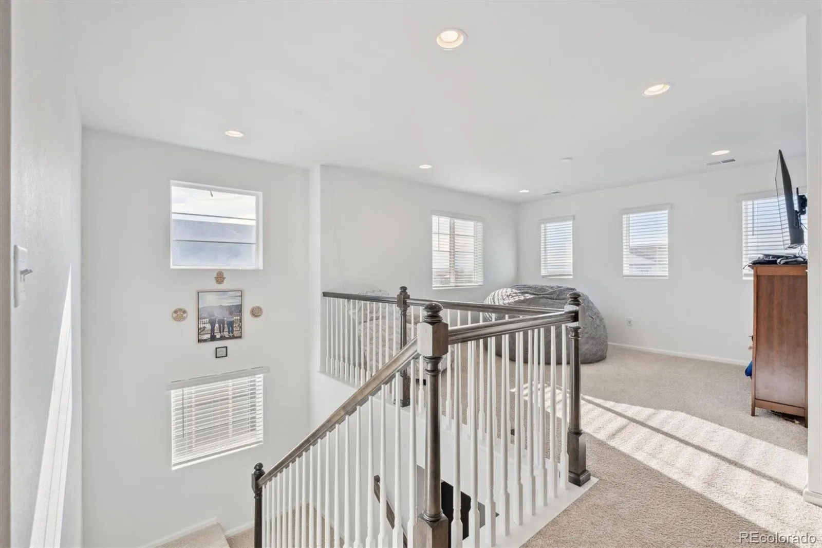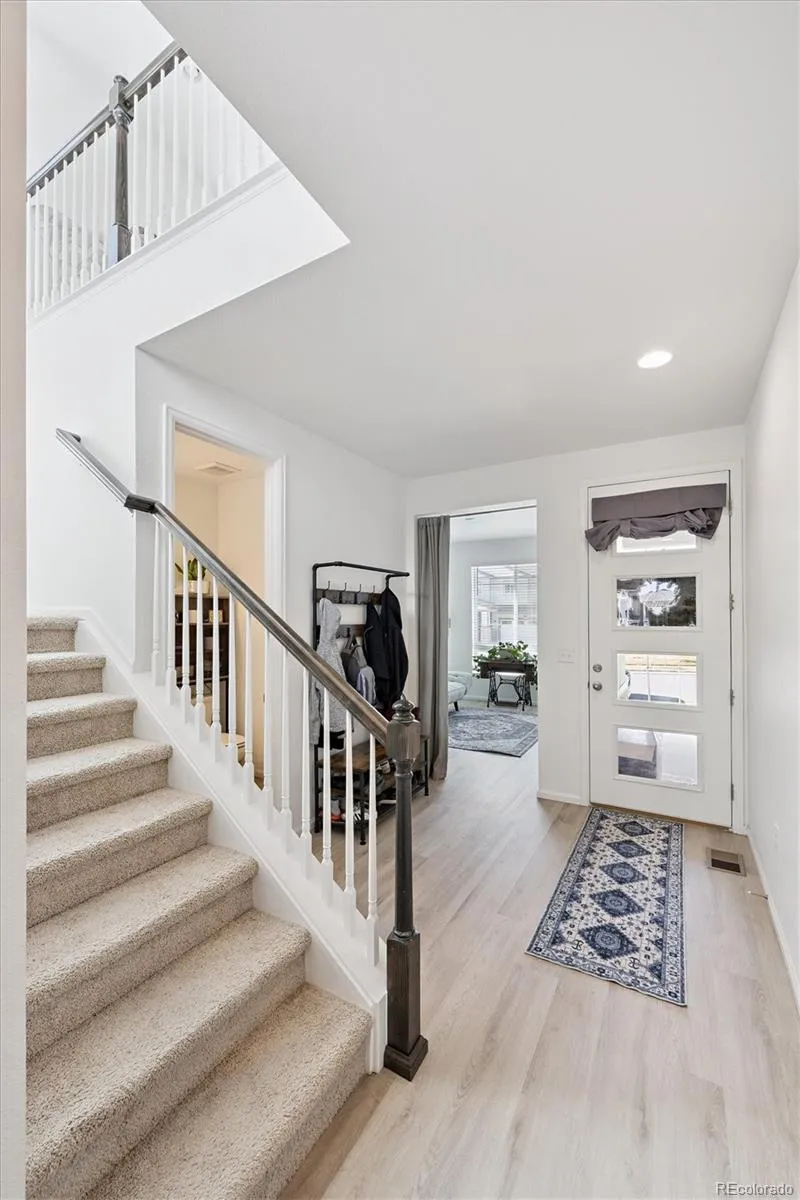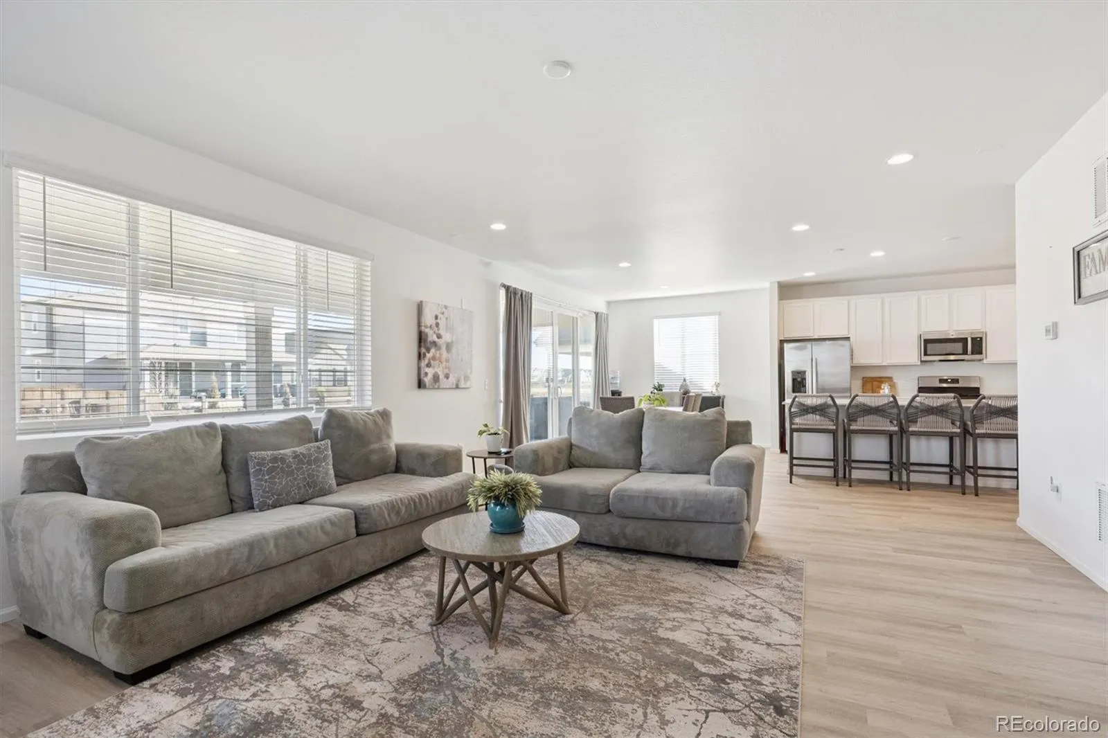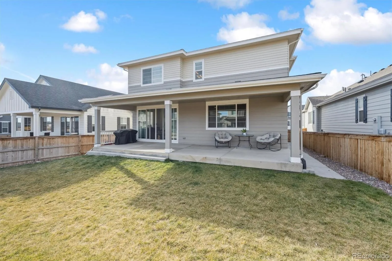 A thoughtfully designed home in Northeast Denver showcasing modern elegance and functionality. Constructed in 2024, this like-new residence boasts an open floorplan, second-story laundry and plentiful storage space. A welcoming front porch reveals an interior entry featuring a convenient ½-bath and a secluded home office, perfect for work or study. At the center of the home is a crisply finished eat-in kitchen adorned with a generous center island, stylish quartz countertops complemented by a sleek gas range stove, and a pantry for food and kitchen storage. Beyond the kitchen, formal dining is trimmed with a covered patio and the backyard for outdoor gatherings or quiet relaxation, and by a great room outfitted with a fireplace and mudroom with access to the attached two-car garage. Stairs near the kitchen lead upstairs and are met by a versatile loft area perfect for children’s play or creative pursuits; three well-appointed secondary bedrooms, one featuring a walk-in closet; and a full-bath with double-sink vanity. Opposite, is the laundry room and a spacious primary bedroom, complete with a ¾-ensuite and large walk-in closet. The home offers easy access to E-470 and Denver International Airport, and is situated within close proximity to neighborhood schools and outdoor recreation with nearby parks, trails, open spaces, and the stunning Rocky Mountain Arsenal National Wildlife Refuge.
