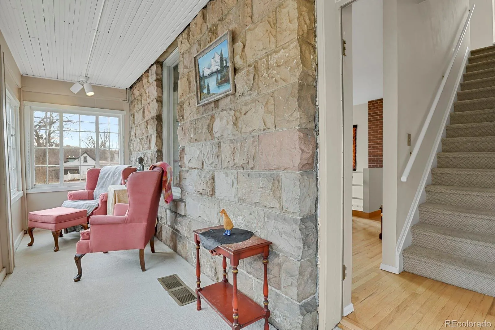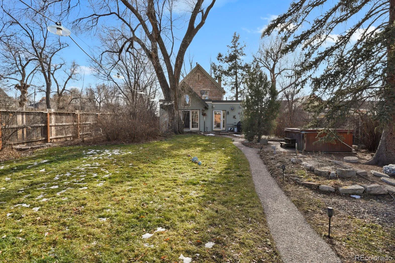 Own a piece of history from 1895! This beautiful historic home, aptly named “Mountain View,” showcases timeless craftsmanship, featuring an original turret and a stunning stone wall. Set on a fully fenced 9,500-square-foot corner lot with mature trees, it includes a detached two-car garage with alley access and desirable R-2 zoning. Upon entry, historic charm meets modern updates, creating a unique and inviting home. The main level features a sitting area with wood floors that flow seamlessly into the dining room and kitchen. A charming sunroom with the original exposed stone and a row of windows creates the perfect reading room. The updated kitchen features custom cabinetry with crown molding, granite countertops, undermount lighting, a gas range, and recessed lighting. The main-level bedroom suite offers abundant natural light, vaulted ceilings, a walk-in closet, French doors to the backyard, and an adjoining bath. The four-piece bath includes a walk-in glass block shower with tile surround, a large soaking tub with overhead skylight, and tile flooring. The conveniently located main-level laundry room offers ample additional storage, and a spacious mudroom off the back door features a custom built-in bench. The upper level has two additional spacious bedrooms, both with bright natural light and one with mountain views, and a recently updated bathroom that features custom decorative double sinks and walk-in shower with tile surround and glass doors. Lower level has a cozy family room with wood burning brick fireplace and natural light from windows above. The large private backyard hosts mature trees, a lush lawn, hot-tub, patios, and a picturesque walkway to the garage with additional parking. Possibilities abound for a potential ADU addition. Enjoy being walkable to downtown Colorado Springs, local restaurants, shopping, coffee shops, hospitals, Olympic Training Center, Shooks Run Park, schools, and walking trails. This property is truly unique and a must see!