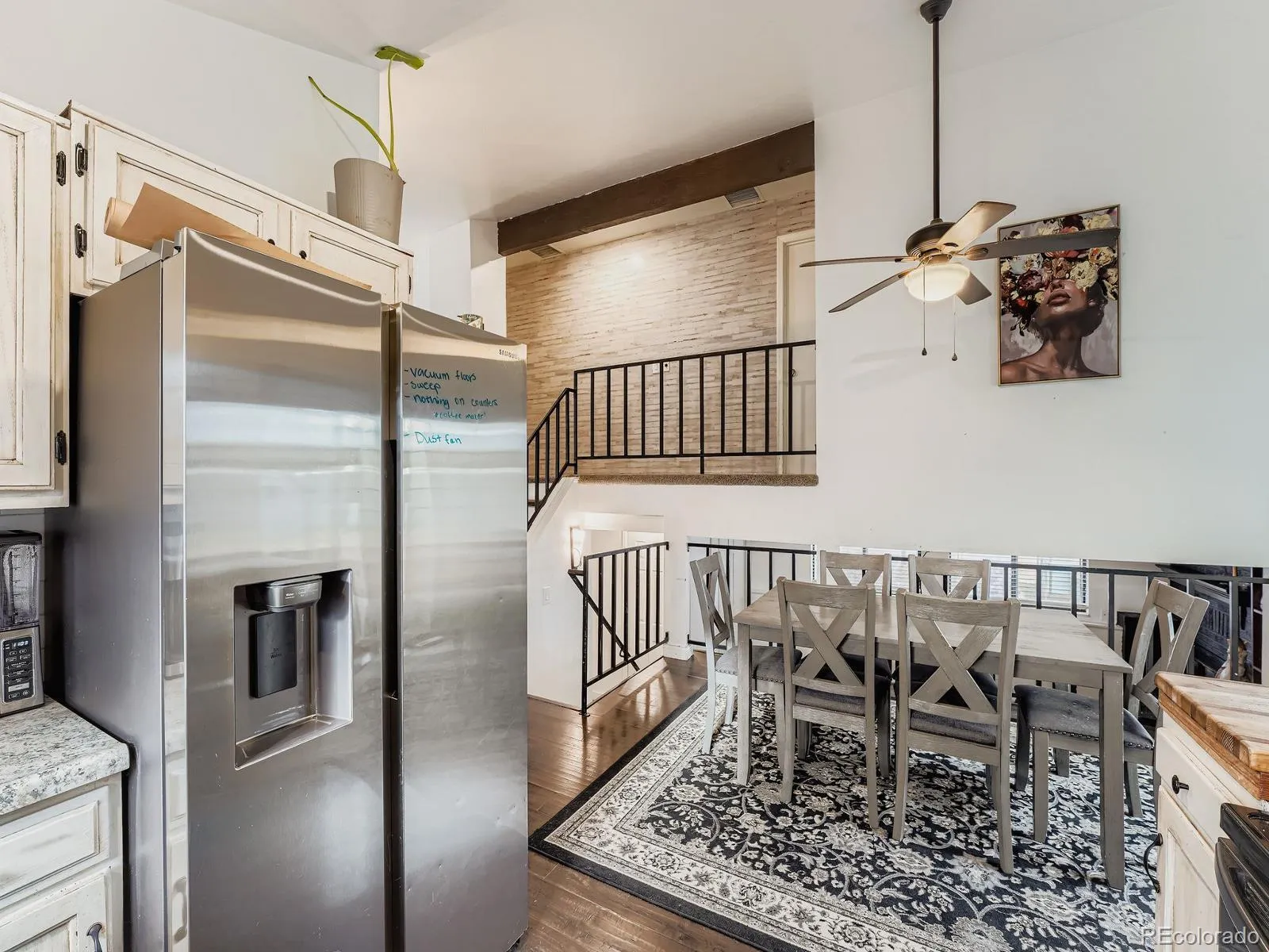 Upstairs, you’ll find a peaceful primary suite with an en-suite ¾ bath, along with two additional bedrooms and a full hall bath. The main floor features engineered hardwood flooring, a bright living room with vaulted ceilings, and a kitchen equipped with stainless steel appliances. The adjacent dining area, complete with a ceiling fan, opens directly onto the backyard patio.