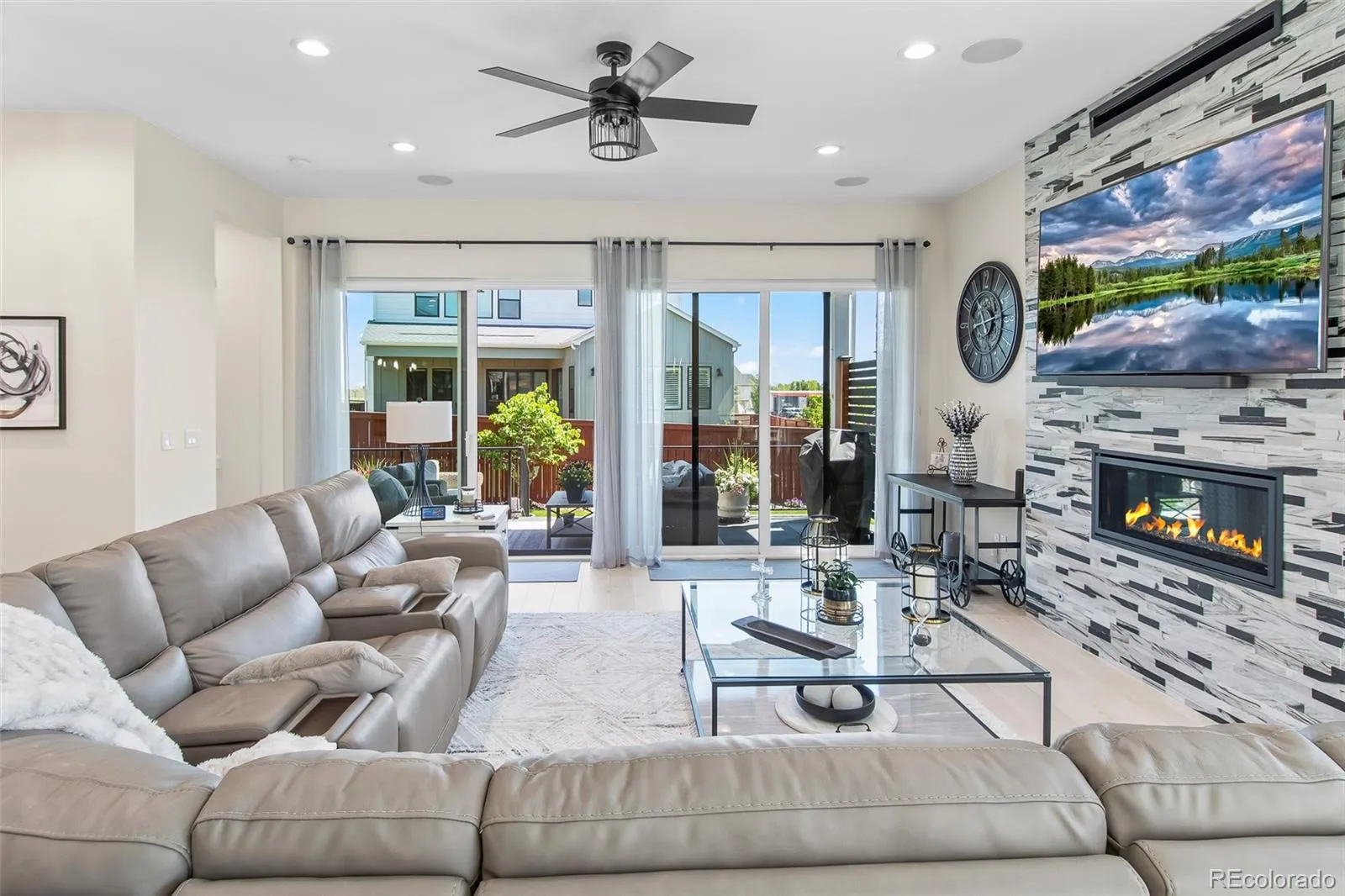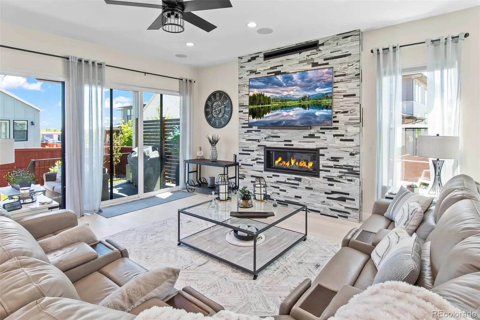Welcome to the desired Sub Area of Raindance in Windsor Colorado! This immaculate property offers 5 bedrooms, 4 bathrooms, a flex room/office, the fully finished two car garage features custom hot water faucet with epoxy flooring. The main level features brand new gray stained wood flooring throughout, a gourmet kitchen with ample cabinet space, waterfall kitchen countertops, walk in pantry, gas range top. The living room features a floor to ceiling backsplash gas fireplace that is absolutely beautiful. Power remote window shades and new LED light fixtures. Enjoy walking out from your main level to an oversized patio with rod ironed railing, privacy wall, custom winter proof tv cover with LG TV with a 110 electrical outlet included, custom cedar ceiling and a plumbed gas line for grilling! Three bedrooms on the upper level with a bonus flex room/office area and a laundry room for convenience. Your large primary bedroom features a five-piece bathroom with an oversized shower, free standing bathtub, double vanities and a massive walk-in closet. Enjoy dual zone thermostats and OLEO Lighting on the exterior. The newly finished basement offers an open concept area, a full wet bar with custom 10′ quarts countertop. two huge bedrooms one with a walk-in closet, a dedicated workout area with rubber flooring. The designer bathroom in the basement offers a 72-inch square sink quartz double vanity countertop, with overhead rainfall shower. Amazing location with festival park directly in front of the home. Raindance National Golf course which is the longest course in the United States is .2 miles away from hole 1! Hoe Down sledding Hill is a block away. Golf pro-shop and Grainhouse bar within walking distance (1 block) This is truly a one-of-a-kind custom home and a must see in person!
