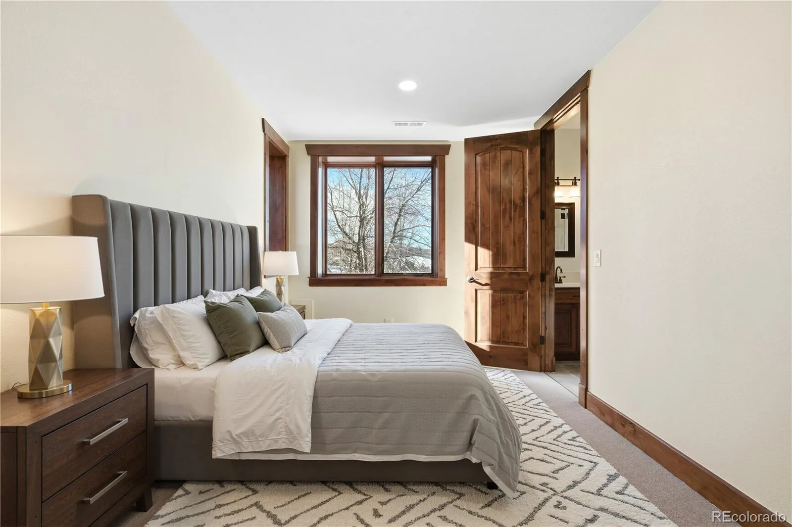 An upper-level bedroom suite offers a bright & private retreat with large windows and an en-suite bath & shower. The adjacent “Costco-style” closet offers seasonal organization.
