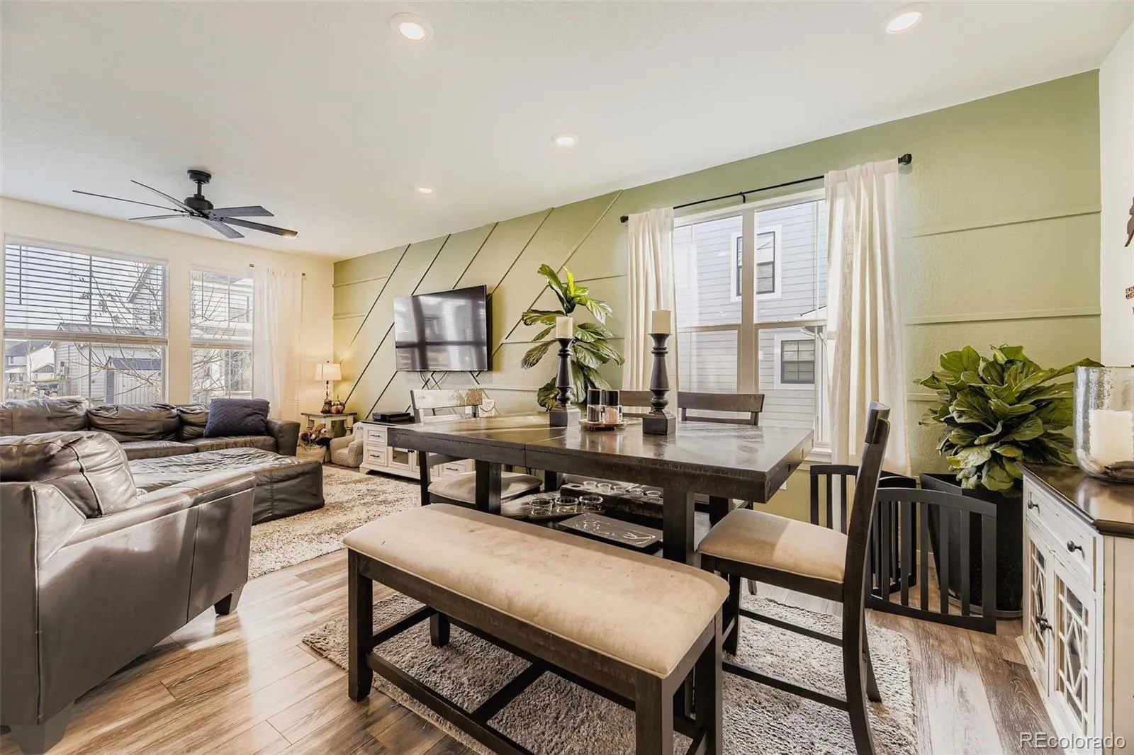 large family room showcases designer paint and a wood accent wall, offering a cozy yet stylish atmosphere. Upstairs, the