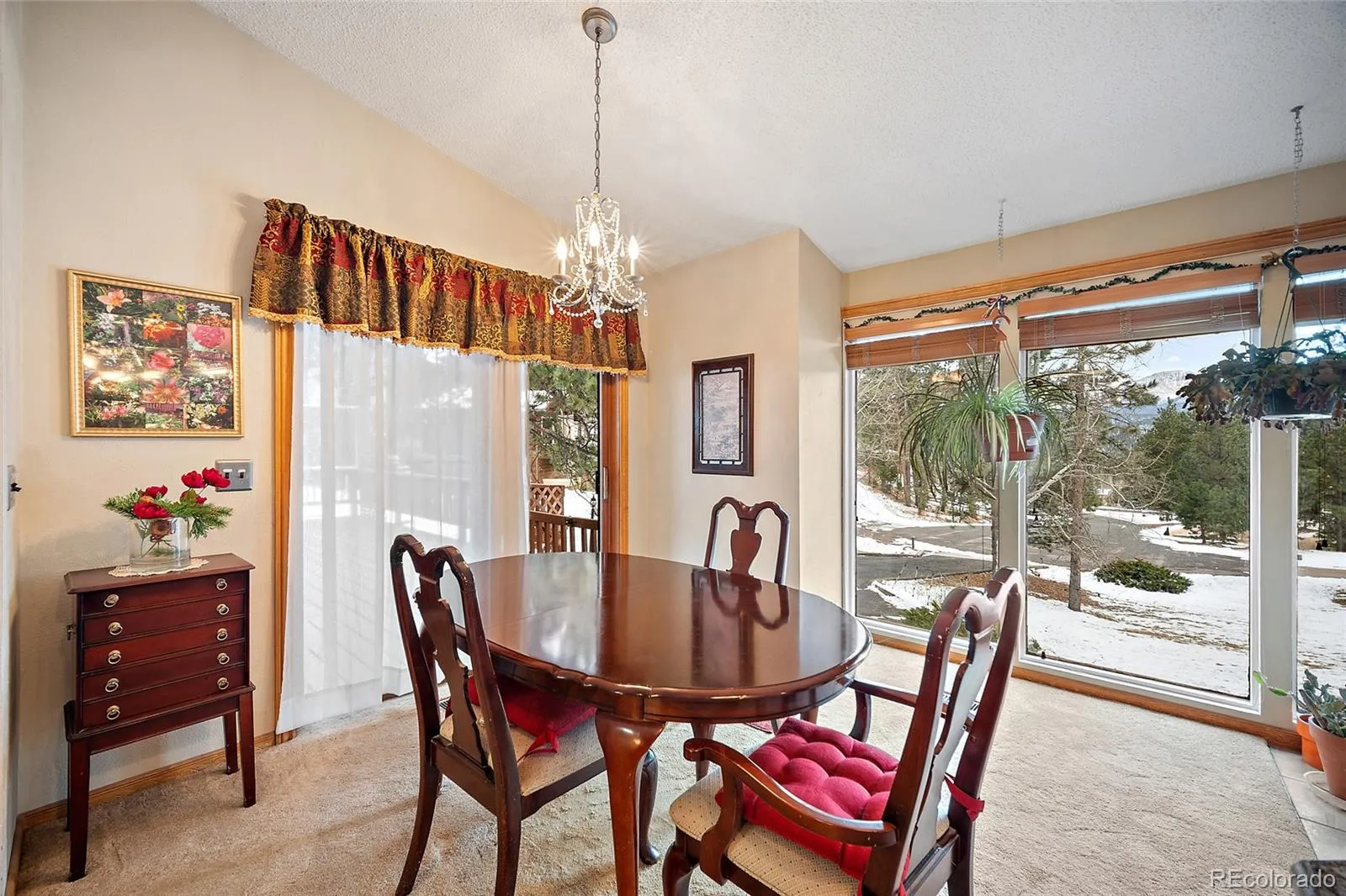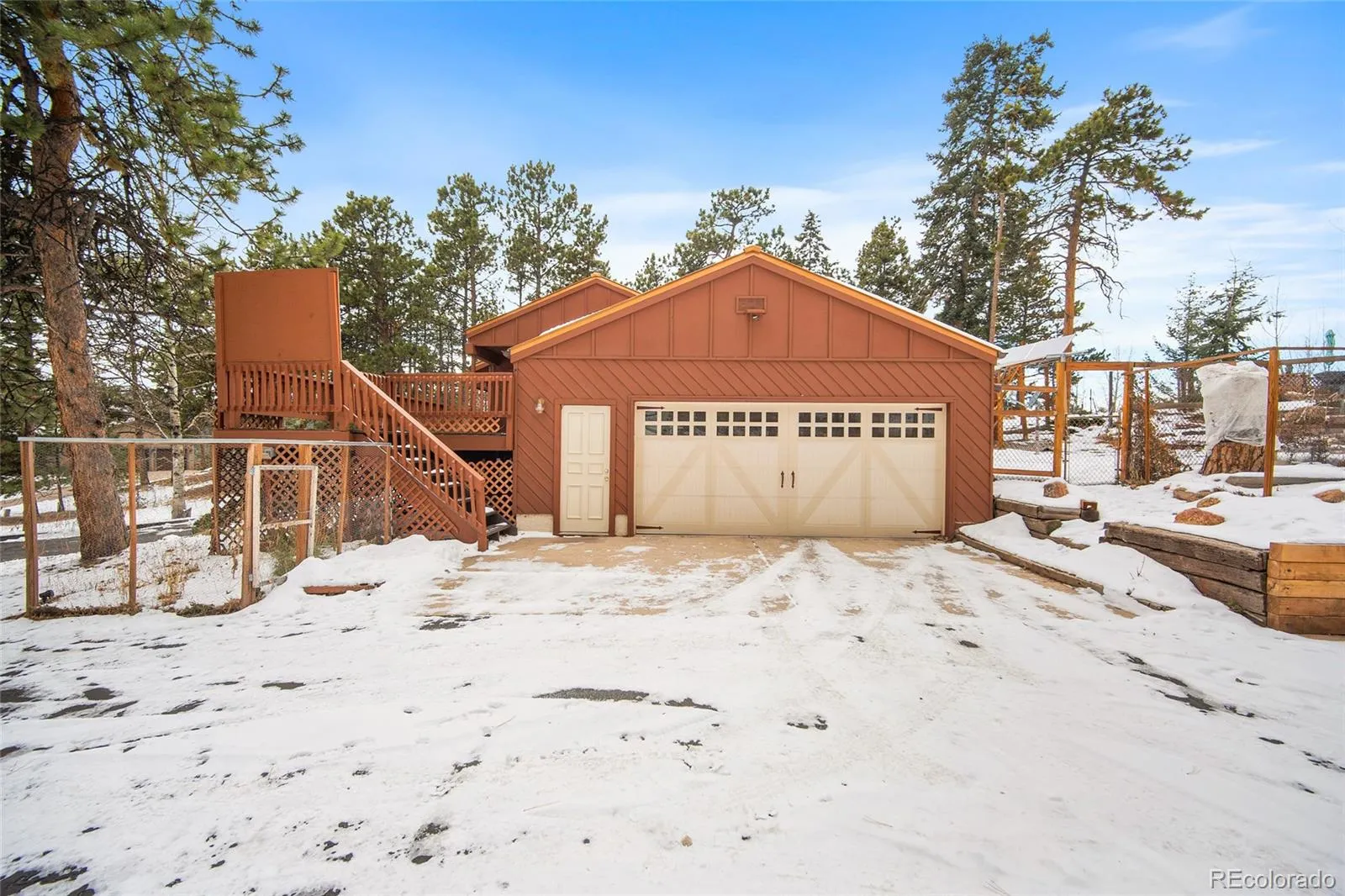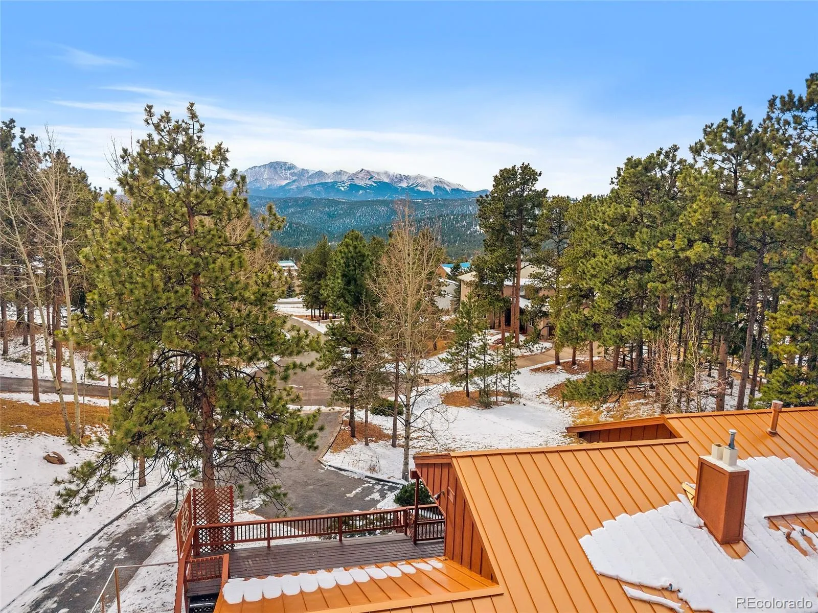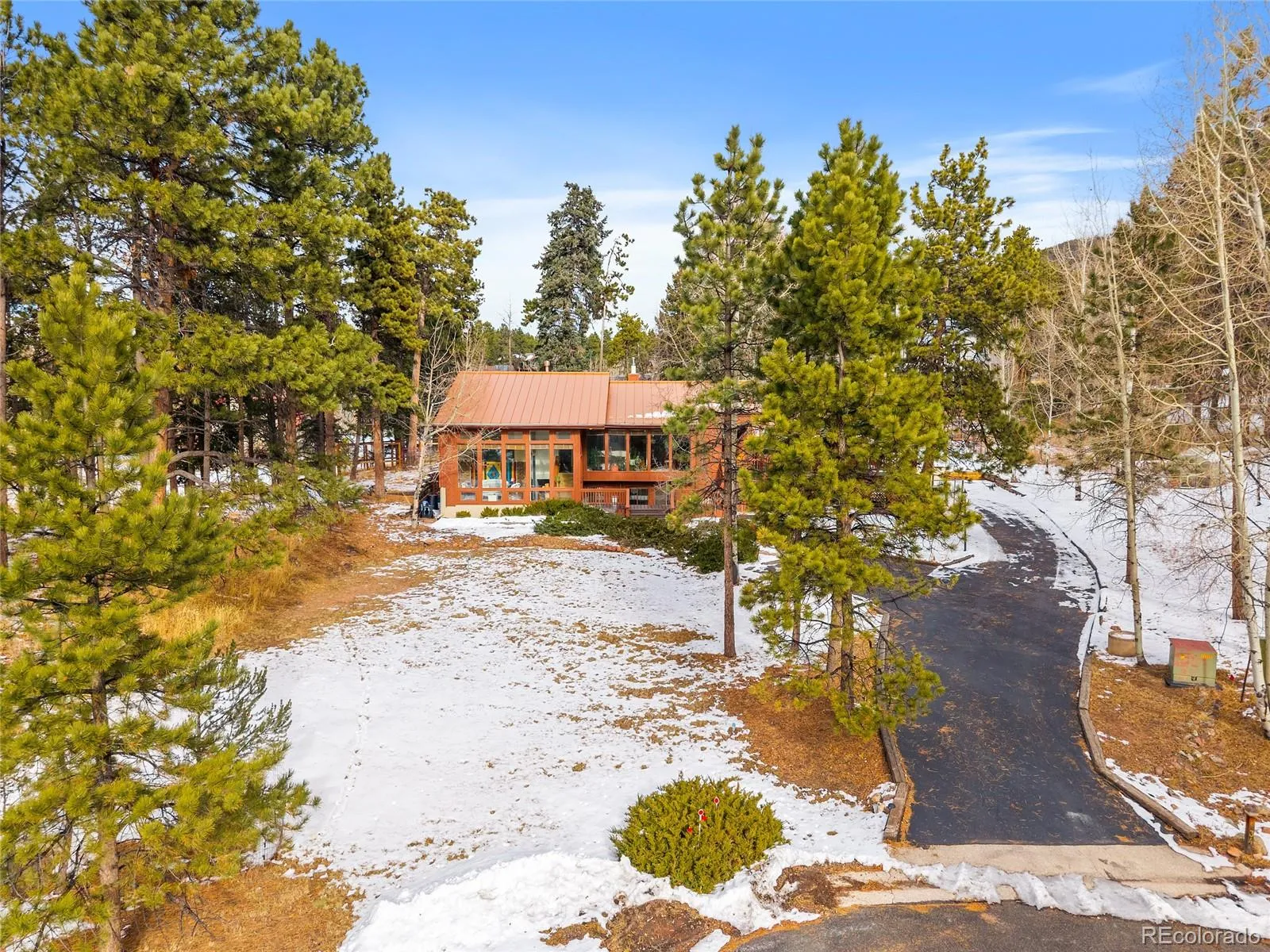 The owners of this property have poured there lives into this home and it truly shows. Centrally located and neighbor to Chimney park, this NO HOA, 2450 sq ft, 3 bed 2 bath home is ready to be yours! A country vibe with refined sense of comfort and connection to the Colorado outdoors. A true standout feature of the home is the Colorado esque wood exterior boasting large glass panes for Mountain views all throughout the home. Self sufficient on power with 28 solar panels, included.; Enjoy warmth, and unbeatable mountain scenery. Inside, the kitchen is hickory cabinetry, solid-core doors, new wood flooring, and a brand-new oven. The primary suite has dual walk-in closets and views toward Pikes Peak. The walk-out basement provides two additional bedrooms, a full bath, family/rec room, a cozy gas stove. The attached 2 car garage comes with 2 freezers and a fridge, a workshop area, utility sink, storage area, and bonus pantry space.Landscaped and fenced backyard featuring mature trees, abundant gardens, and a greenhouse/covered seating area. A rainwater cistern system for water collection and a solar setup with battery storage for electricity independance/efficiency. A new metal roof, freshly painted exterior, and paved driveway further enhance durability and curb appeal.This is mountain home is ready to be yours!