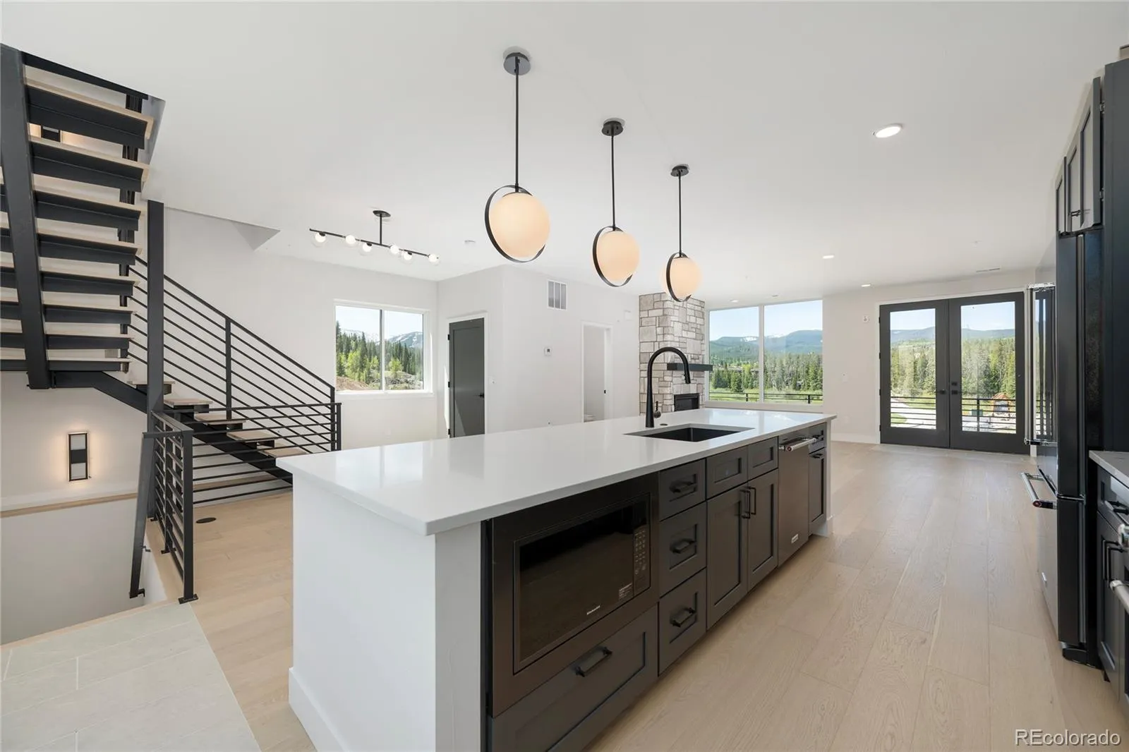 Introducing our largest floor plan to date, a contemporary retreat nestled in the serene setting of Winter Park, CO, just a 5-minute walk to Hideaway Park. This stunning home boasts a sleek, modern design with 4 bedrooms & 4 bathrooms, offering 2,115 square feet of refined living space plus 230 sq ft on the deck! The open floor plan starts with a welcoming foyer including a built-in “drop zone” for organizing essentials. Bask in the natural light streaming through 500+ sqft of floor-to-ceiling windows, perfectly positioned to capture breathtaking mountain views. The heart of the home is here, an enormous great room with fireplace, seamlessly connects to a large wrap around deck—ideal for entertaining or savoring the peaceful surroundings. The gourmet kitchen is equipped w/ Black SS KitchenAid appliance package, including hood above the gas range & under-counter microwave. Oversized island, ample counterspace with quartz tops, near private outdoor patio with more than 150 sqft – hot tub ready, allowing for easy indoor-outdoor living. Open-iron rail stairway enhances the spaciousness of the great room. The upper floor includes a luxurious primary suite, featuring enormous shower, double sinks, & a walk-in closet, offering a tranquil escape within the home. Two additional bedrooms on this floor share a full bath, ensuring comfort & privacy for all occupants. This level also includes convenient laundry closet. A fourth bedroom awaits on the lower level, complete with a 3/4 bathroom, creating a separate private quarters—perfect for guests or a secluded retreat. Additional amenities include an oversized, EV-ready 2-car garage + 2 driveway spots to meet all parking & storage needs. Whether you’re hosting lively gatherings on the deck or enjoying quiet moments of relaxation, this home is designed for both entertainment & rejuvenation, offering endless opportunities for recreation & leisure. Your mountain lifestyle awaits in this exceptional Winter Park residence.