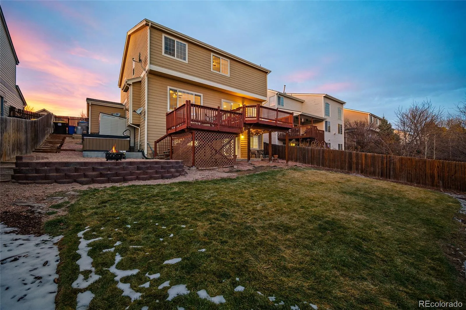 Welcome home to this beautiful 6 bedroom, 4 bathroom home offering over 3,000 sq ft of versatile living space in Founders Village in Castle Rock. When you first walk in you are welcomed by a large dining room that is perfect for entertaining, dinners and gatherings. This home features a spacious kitchen with an island and bar seating, open to a cozy family room with a gas fireplace. Main floor bedroom with attached en suite bathroom offers ideal guest or multigenerational living. The finished walk out basement includes a private in-law suite with full kitchen, bathroom, separate laundry, bedroom with egress window, and private patio. Also perfect for house hacking and renting out the basement to help offset your mortgage. Enjoy the expansive backyard deck with tons of space for BBQ, parties, great entertainment or relaxation offering beautiful views all around. Upstairs you’ll find the spacious primary suite with dual closets and large 4 piece bathroom. The last three bedrooms round out the upstairs with a full bath and laundry room. Additional highlights include a 3-car attached garage which is a very rare find for this price in this neighborhood, underground sump pump, and a full crawl space with approx. 5 ft of headroom underneath the entire house. This home is located near top rated schools, parks, and miles of scenic hiking and walking trails. Nothing else like this on market right now! The only thing missing is it’s new owners! Call today to make it your very own!