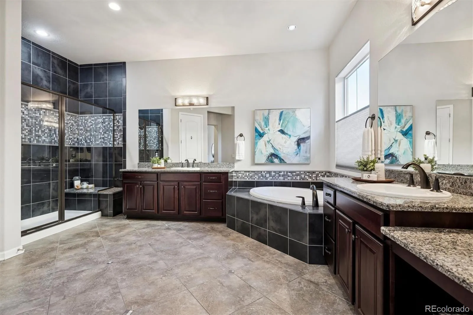 The main level offers a versatile bonus room ideal for an office or additional bedroom, a stylish powder bath, a private guest suite with walk-in closet and en-suite bath, and a serene primary suite with blackout shades, dual vanities, soaking tub, tiled shower, and a spacious walk-in closet.