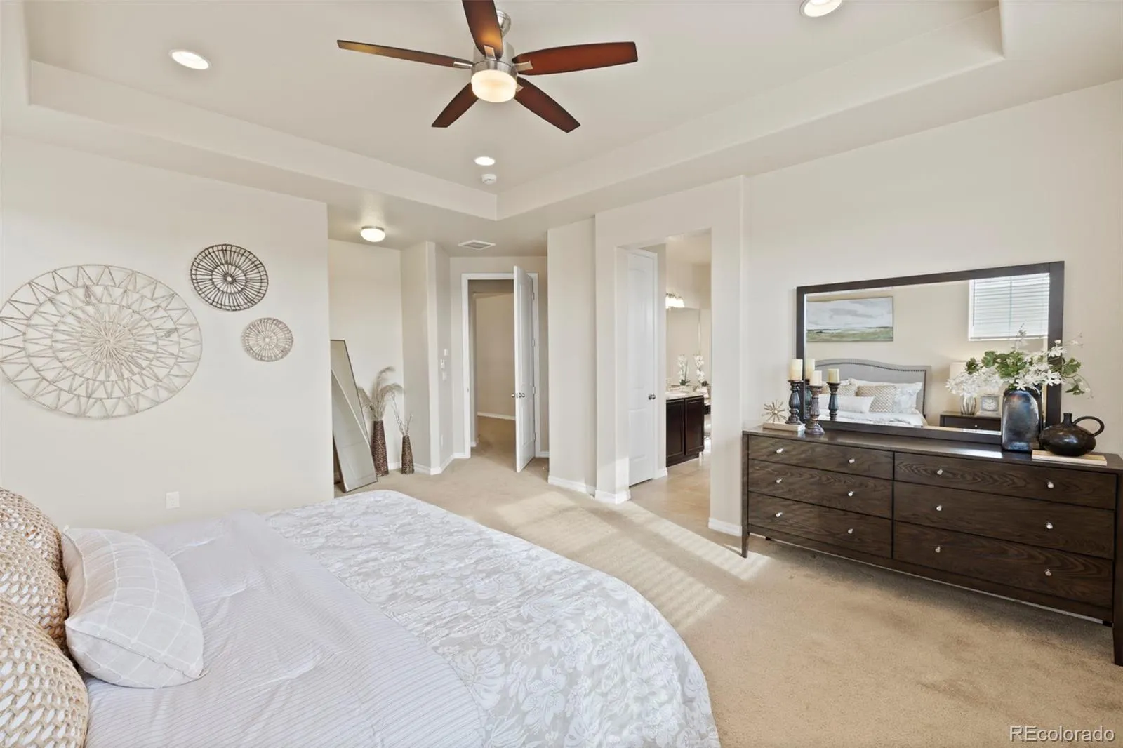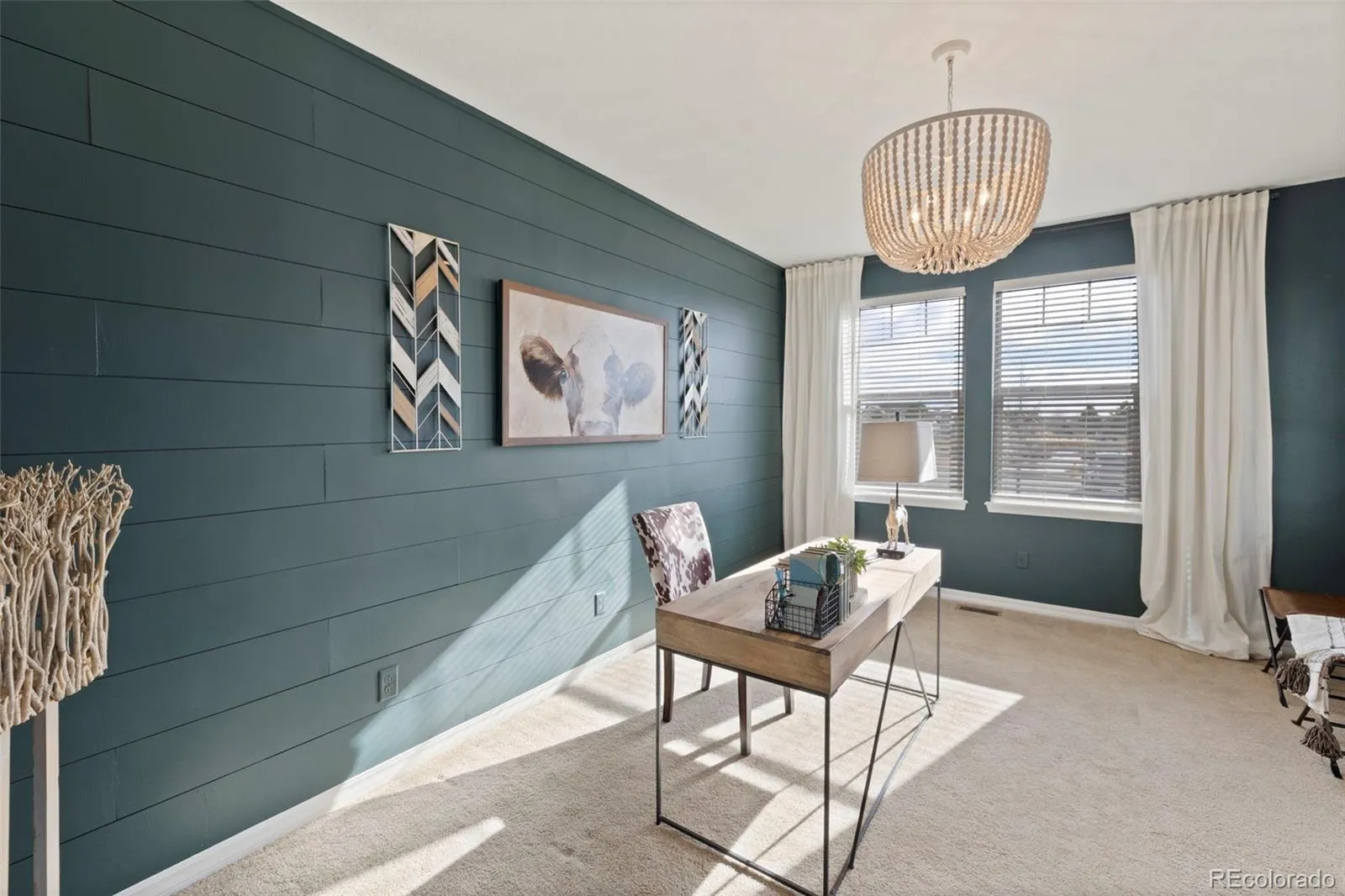 Spacious 5-bedroom, 5-bath two-story home with finished basement and 3-car tandem garage in Wolf Ranch in District 20, set on a low-maintenance cul-de-sac lot. A dramatic two-story entry with niches and curved staircase leads into the heart of the home, gourmet island kitchen with counter bar, cabinets with pullouts, granite counters, walk-in pantry, stainless appliances including a gas range and double ovens, open to the dining nook and great room with gas fireplace, built-in shelves, and rich wood floors that carry through much of the main level. Upstairs, the primary suite features a tray ceiling, walk-in closet, a spa-like 5-piece bath with separate vanities, make-up area, soaking tub, and oversized shower with seat. Two additional bedrooms share a Jack-and-Jill bath and each have walk-in closets, while a third upper bedroom enjoys its own en-suite bath; convenient upper-level laundry with tile floor sits near the bedrooms, along with a large walk-in storage closet. On the main level, a large front office with adjacent powder bath and its own exterior entrance is ideal for a home-based business, private workspace, guest space, caregiver, or client meetings. A formal dining room with tray ceiling and buffet recess sits just off the kitchen, and a mud room with custom cubbies connects to the garage and offers a convenient landing zone. The finished basement adds a large rec room with a cozy niche for media or play and a custom wet bar with driftwood-look tile, granite counters, bar fridge, and wine rack, plus a spacious fifth bedroom and full bath for guests or longer stays. Central air, two furnaces, whole-house air purifier and humidifier, upgraded window wells and covers, a covered front porch, and a location in the planned Wolf Ranch community with neighborhood parks, walking trails, pool, splash park, community events, and quick access to District 20 schools, shopping, restaurants, hospitals, the Powers corridor, and I-25 complete this well-appointed home.
