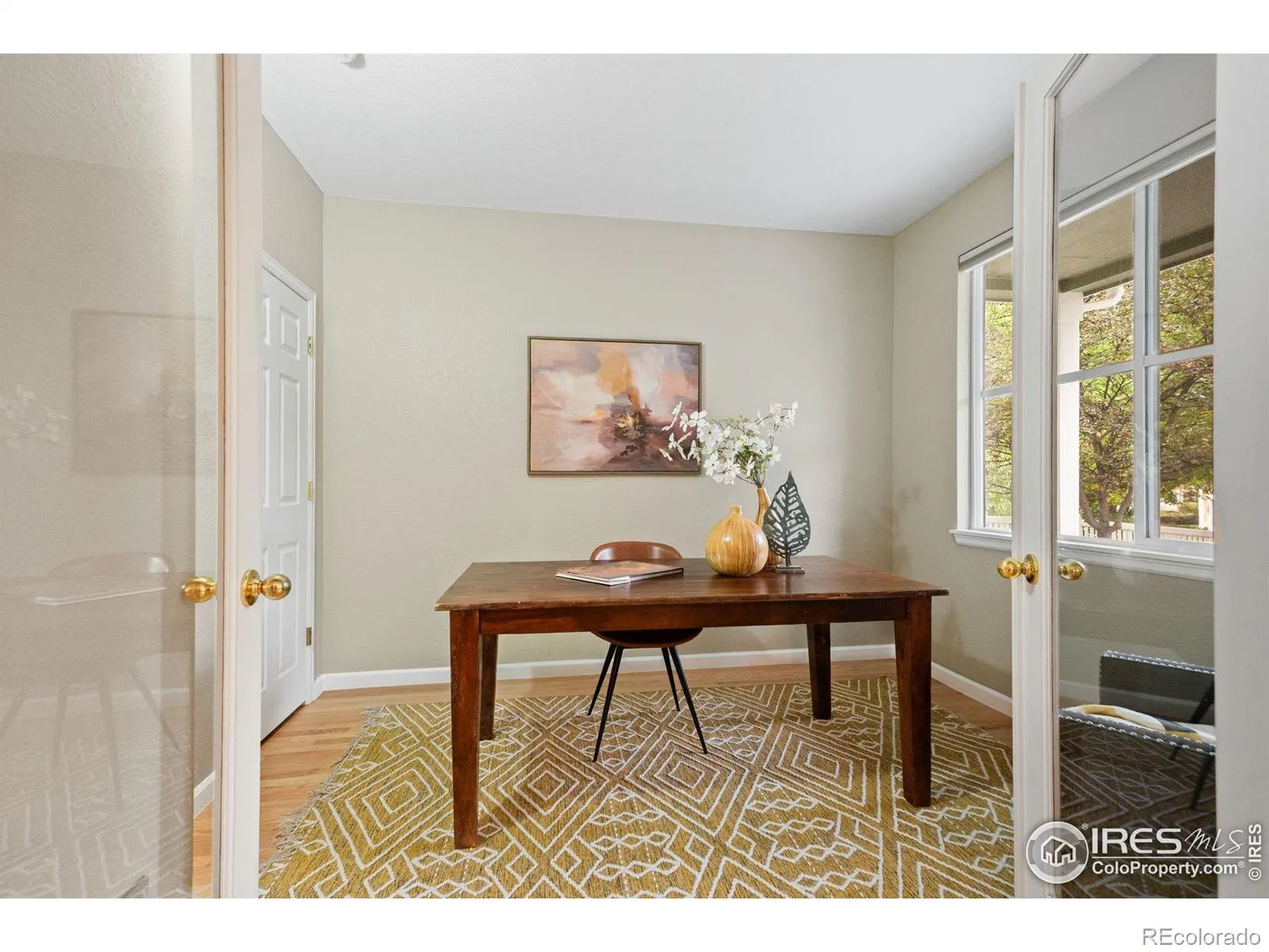 LOCATED IN SOUTHWEST LONGMONT, EASY ACCESS TO BOULDER. Sunny ground-floor corner unit with excellent natural light from 3 of the four walls. Not a stair or a step in this freshly updated 3-bedroom and 2-bath condo. The updates include modern white kitchen cabinets and newly refinished hardwood floors throughout; no “lived-in” carpeting to deal with. Open and easy to entertain between the kitchen, dining, and living areas. The master bedroom is spacious, with ample closet space, and is light and bright with a crawl space in the closet. The master bath features a tub/shower surround and a large vanity with ample storage space. The second bedroom has a large walk-in closet, and with lots of natural light, the third bedroom can also be used as a home office for the work-from-home professional. The main bath also features a tub/shower surround and a spacious vanity. The detached single-car garage is just steps away from the unit and includes shelving for additional storage-located in the highly desired St. Vrain Valley School District. The unit also includes an ample, fenced outdoor space, landscaped with low maintenance in mind, that provides a nice, private place to entertain in warmer months. Close to shopping at Village of the Peaks, Whole Foods Market, and Target. This lovely home is ready to move in and enjoy!