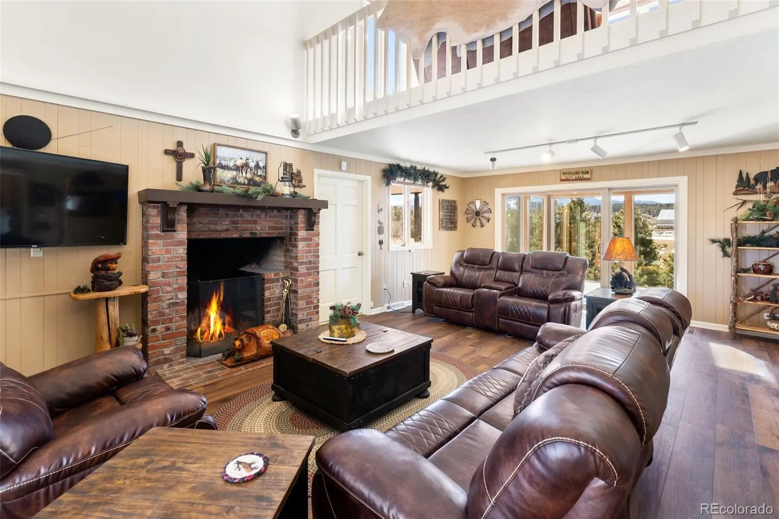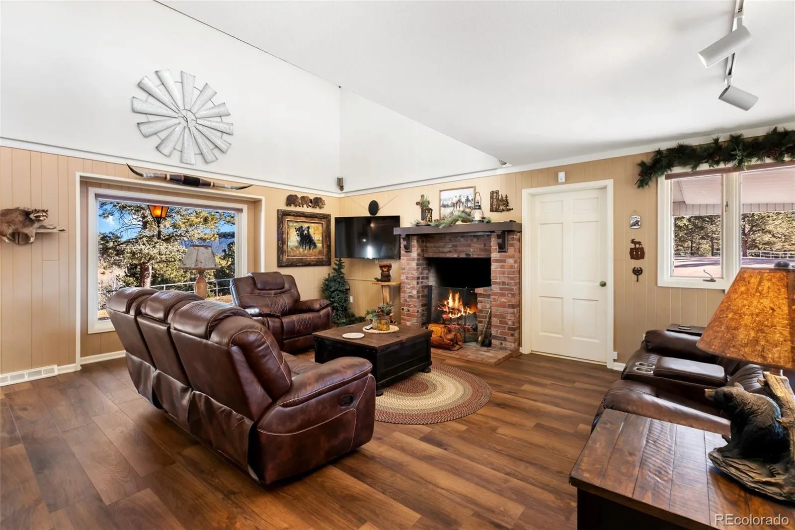 This inviting space features a new electric fireplace, new vinyl windows, tile flooring, stucco, custom log accents, & an active