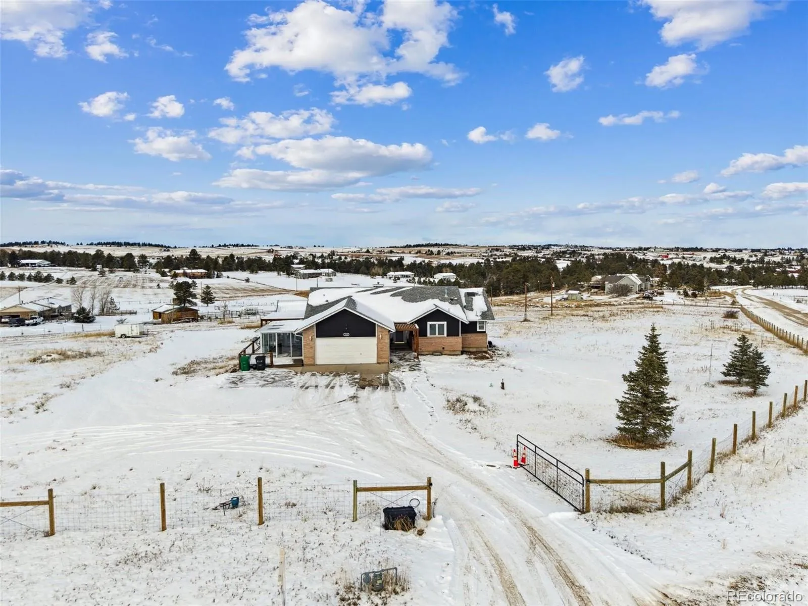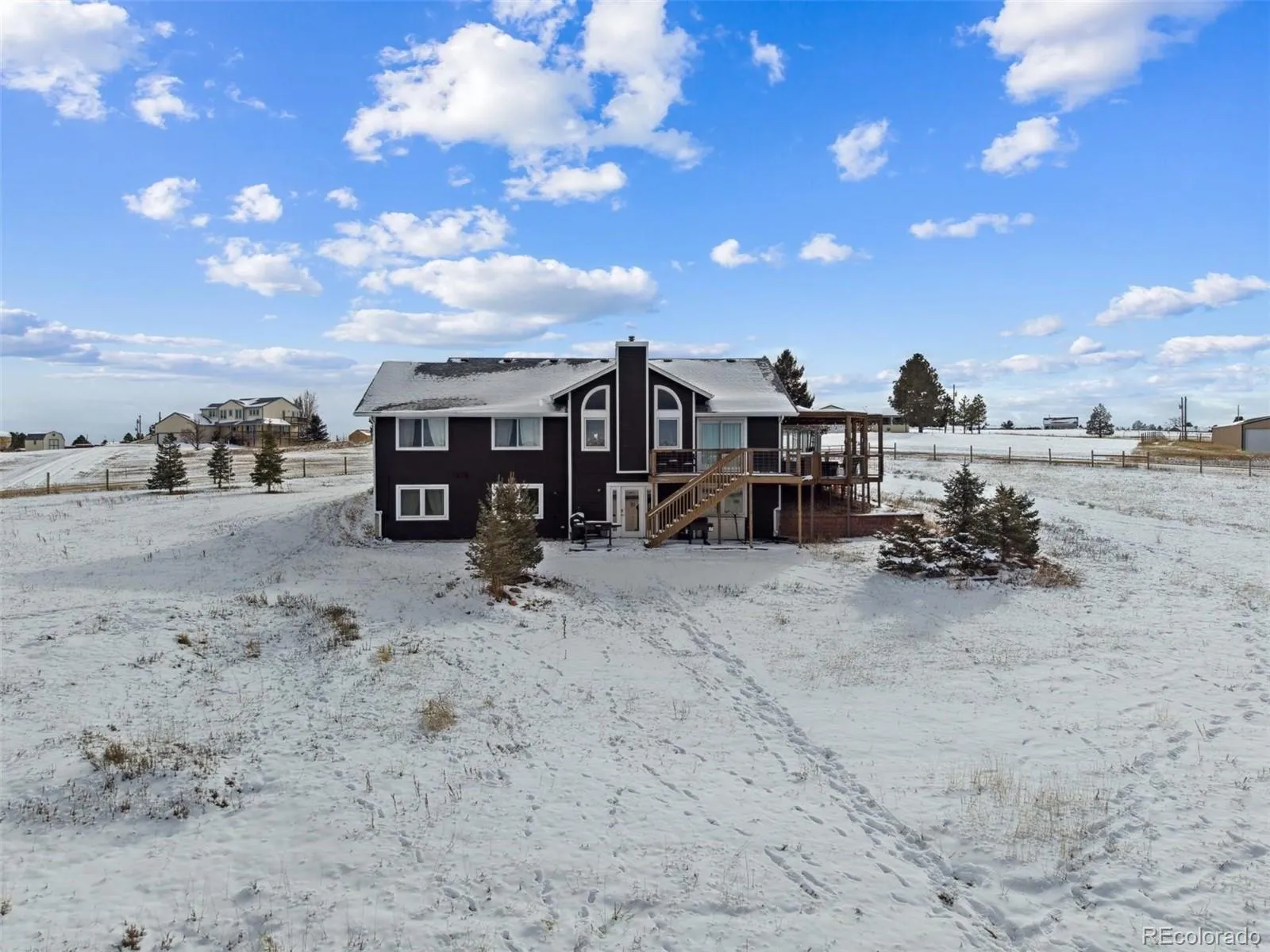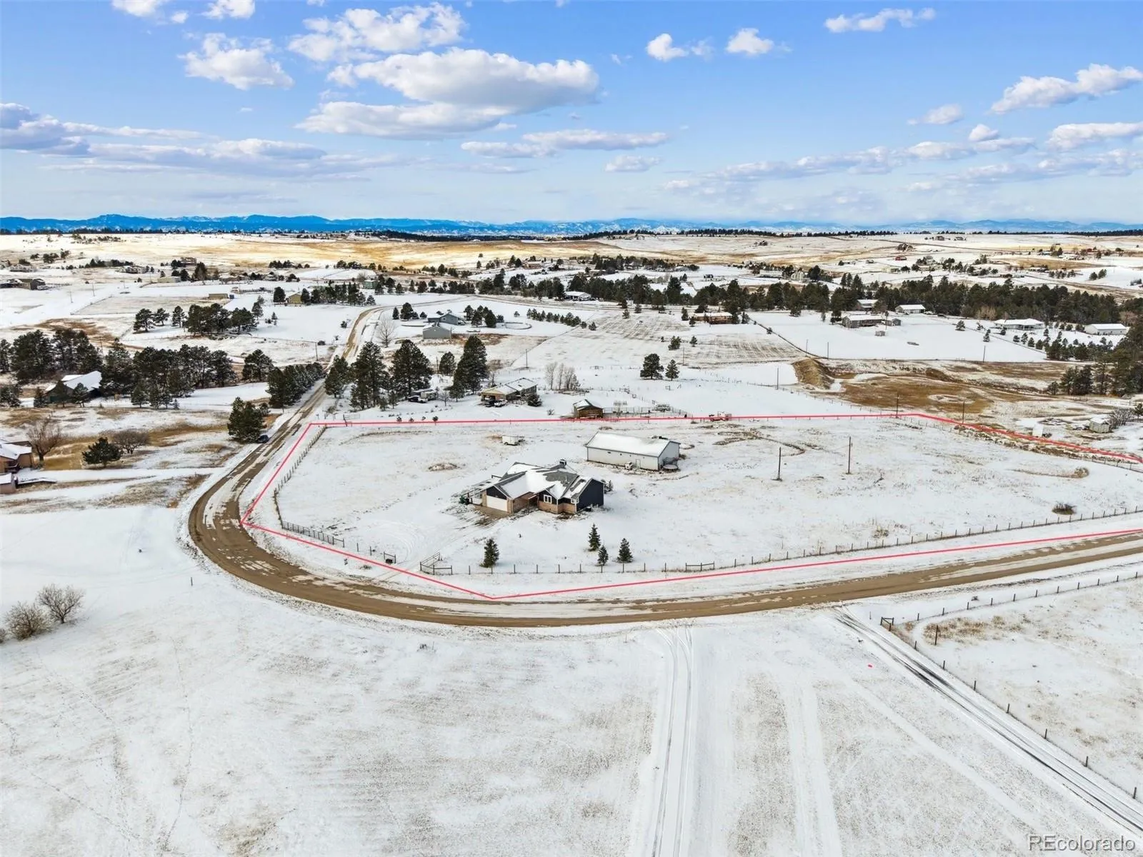 Located just minutes from shopping and restaurants in downtown Elizabeth, this beautifully maintained home offers a 5.03-acre setting, more than 3,360 finished square feet with 5 bedrooms and 3 baths, and a 40×60 outbuilding. It offers a quiet, country lifestyle, with the ability to slow down, be present, and savor life! This one-story ranch, with finished walk-out basement, provides an updated main-floor primary suite with dual vanities, soaker tub, tiled shower, and sizeable walk-in closet, with two additional main-level bedrooms (or bedroom/study) with a shared full bath. The open floor plan features extensive hardwood floors, with a gorgeous, updated kitchen, quartz countertops & full backsplash, stainless appliances, and walk-in pantry. Adjacent to the kitchen, the dining space accesses the covered back deck and flows seamlessly with the family room, where a vaulted ceiling, cozy fireplace, and handcrafted mantel accentuate the heart of the home. You’ll appreciate the convenient main-floor laundry, as well as a second laundry in the basement. An unheated sunroom and an extensive wrap-around deck are perfect for enjoying plentiful days of Colorado sunshine. The basement includes a fantastic great room with wet bar, flex spaces for workout area or playroom, two bedrooms (one with a walk-in closet), a shared ¾ bath, an additional laundry and plenty of unfinished storage. The perimeter of the property is fenced for horses. The 40×60 steel outbuilding features a cement floor, 220v power for RV hook-up or generator, water/sink/floor drain, hot water heater, workbench and storage shelves, air hose lines from front to back, and an overhead RV door. The upper driveway and both exits to the barn are covered with crushed asphalt. The sought-after Pawnee Hills community offers a riding barn, round pen, and miles of bridle paths. The clubhouse features event facilities, pool/sauna, tennis, pickleball, basketball, horseshoes, and monthly/holiday events!
