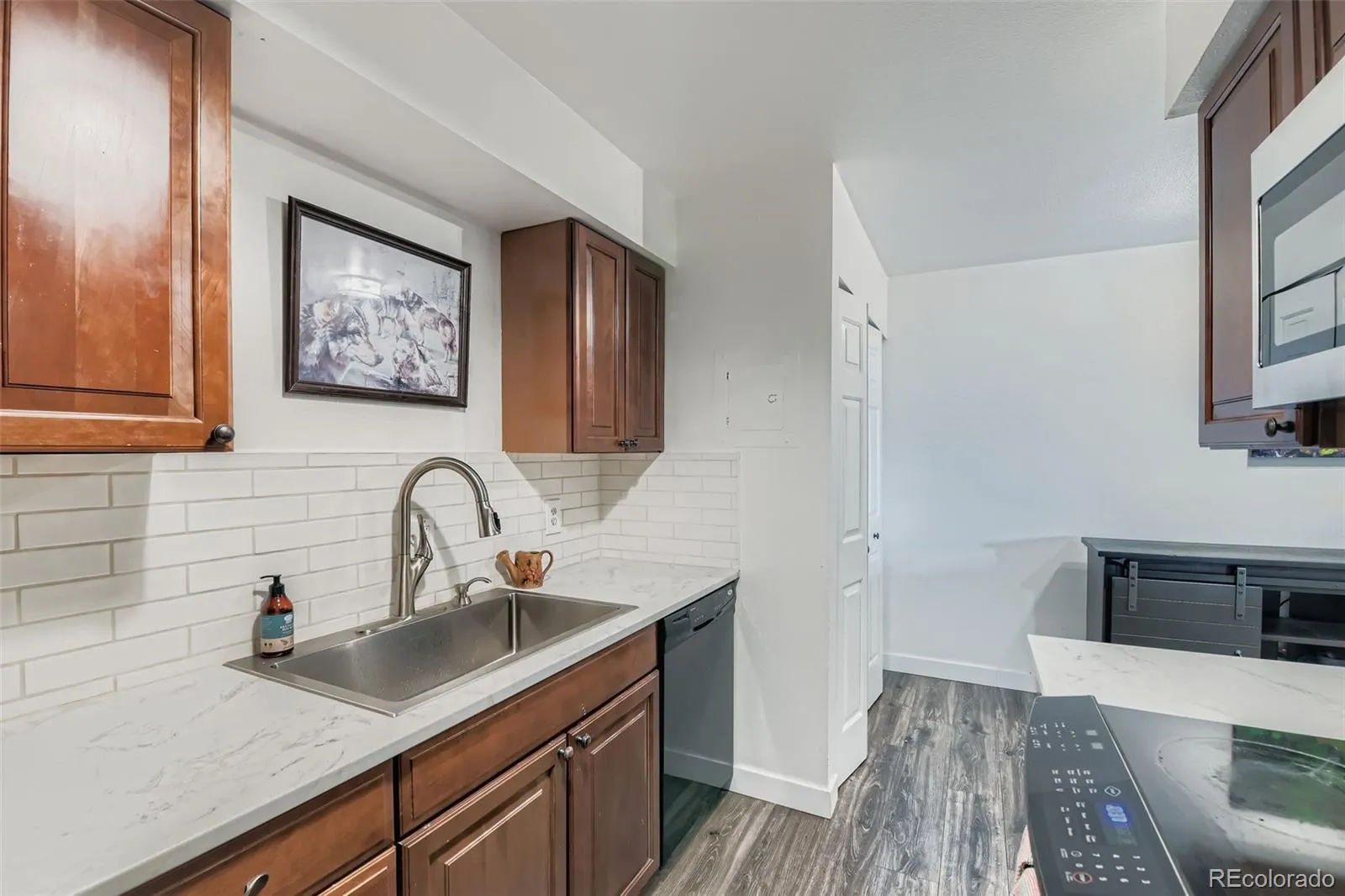 Welcome to low-maintenance living in South Denver. This well-designed 906 square foot condo offers an efficient layout, comfortable living spaces, and a location that attracts both homeowners and renters alike! As you walk into this top floor condo, the entryway is filled with natural light and flows easily into the kitchen or the main living area, creating a space that feels open, inviting, and ideal for everyday living or easy tenant appeal. The kitchen (updated in 2025) is thoughtfully arranged with ample cabinetry and counter space, making it equally practical for quick meals or hosting friends. The living area provides flexibility for multiple layouts and lifestyles, only made better by the southeast facing views and morning sun from the balcony. Both bedrooms offer great closet space while the recently remodeled bathroom (2022) and additional storage complete a layout that maximizes every square foot. This home boasts an array of additional upgrades such as new energy efficient windows, recessed lighting, new paint in 2022, and new front/storm doors. Situated minutes from Littleton, River Point, outdoor recreation, and everyday essentials, this home offers the perfect balance of accessibility and simplicity.