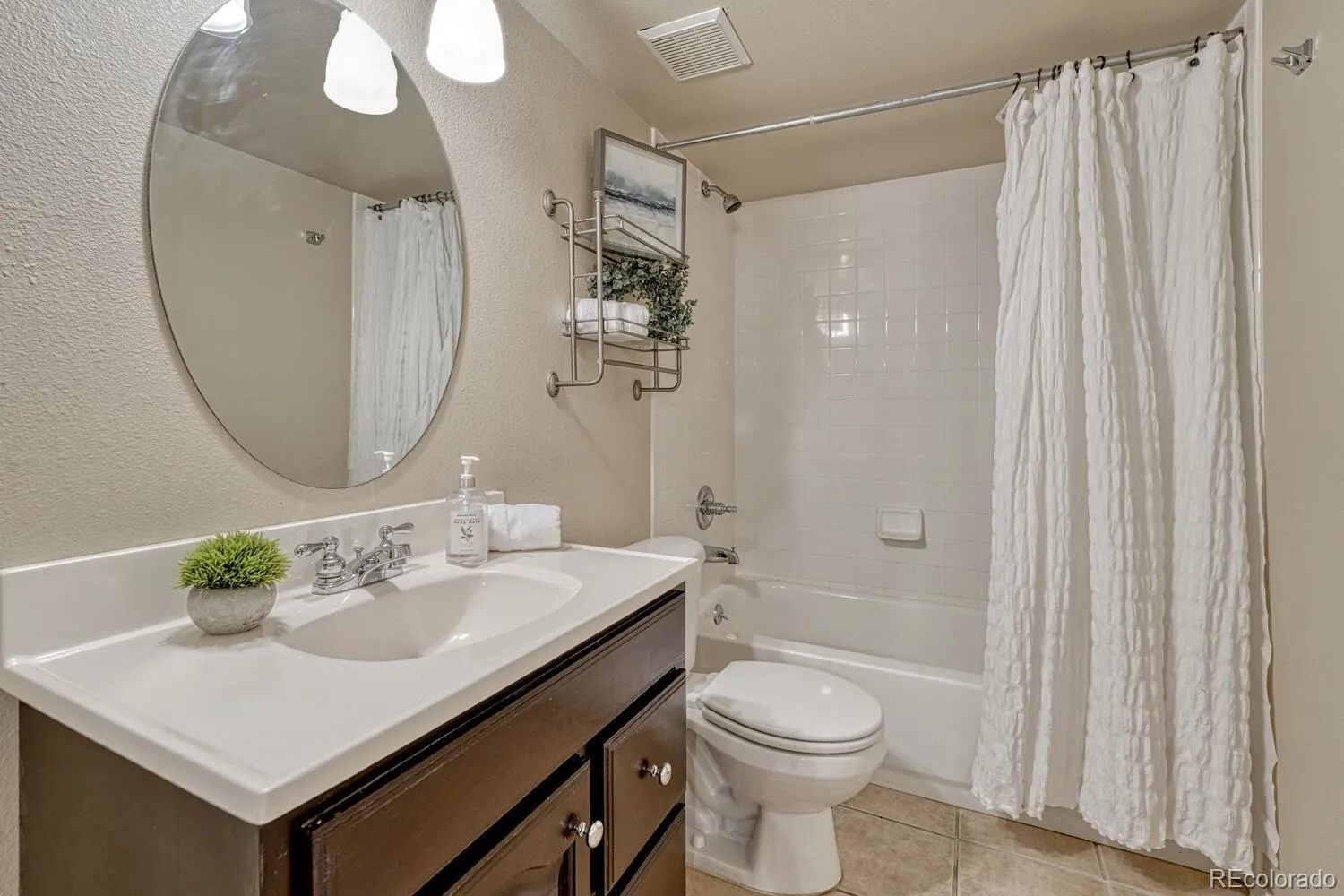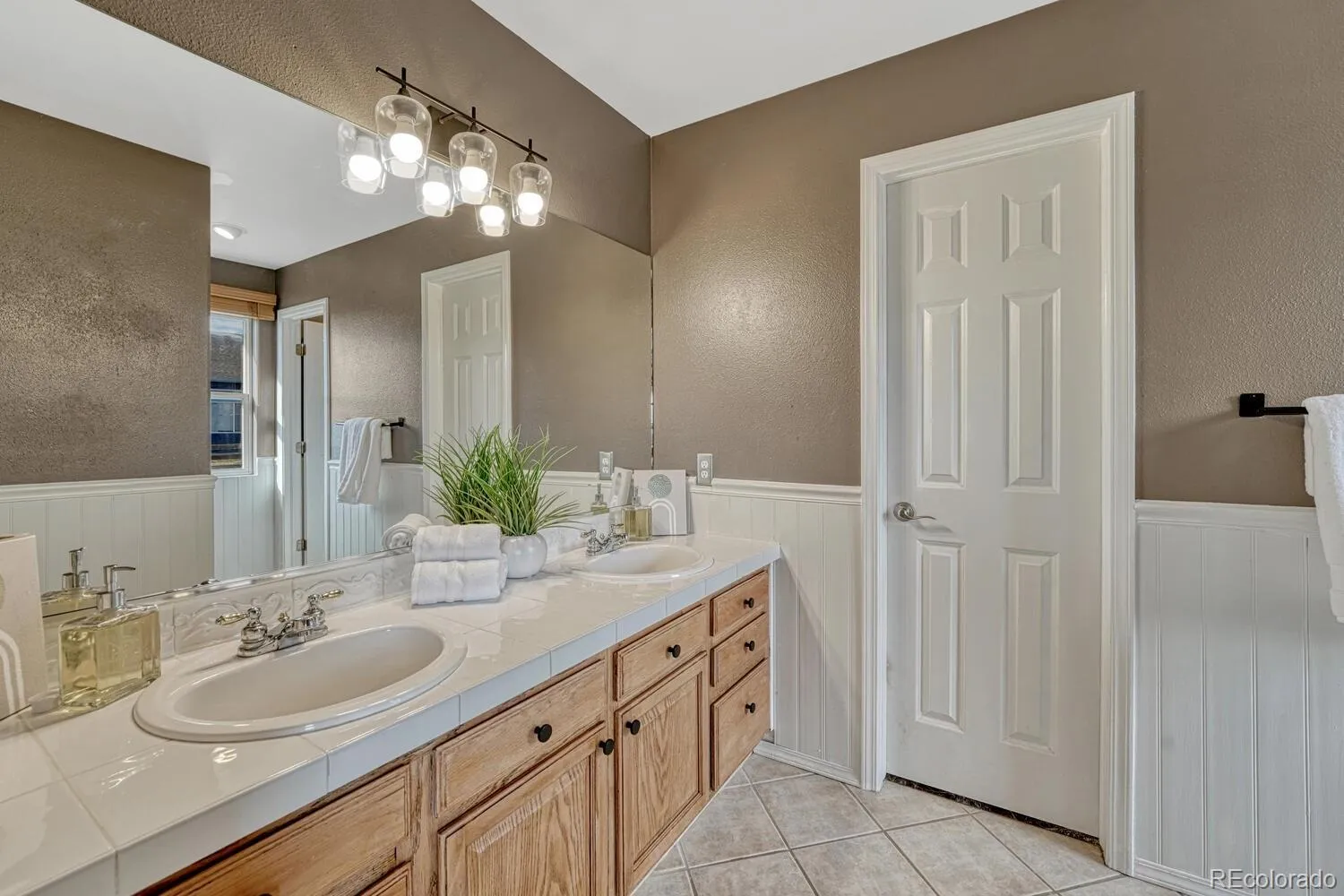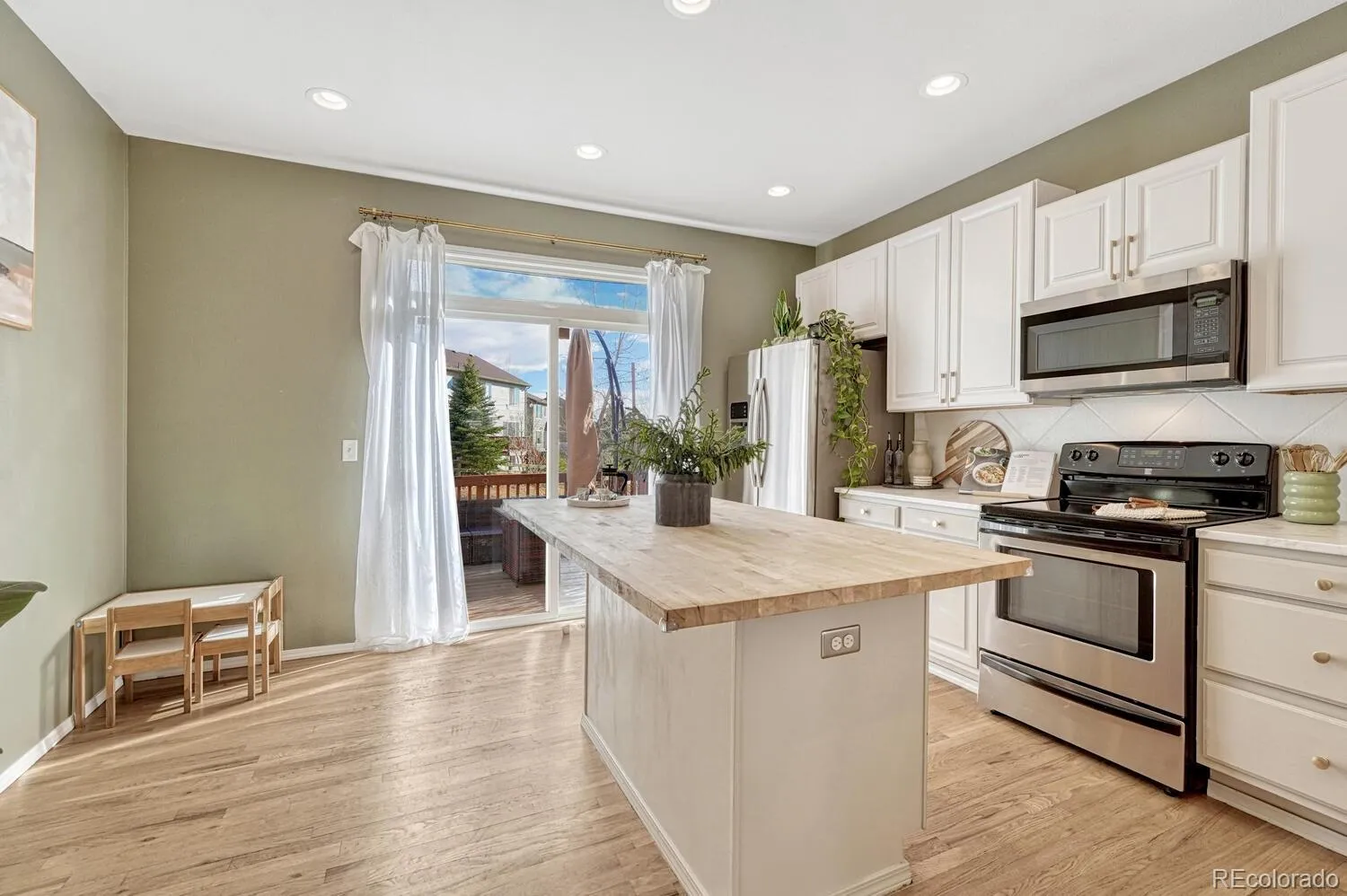 There’s still time to ask Santa for a new home for the holidays! Welcome to lovely main-level living in the coveted Jackson Creek neighborhood, backing up to open space & a walking trail with stunning mountain views from the back porch. This impressive home features 5 bedrooms, 3 bathrooms & a 2 car attached garage. Step inside to a bright, open living room with tall ceilings. Oak wood floors & a wall of built-in shelving accent a gas fireplace painted in chic charcoal grey. The open-concept main level flows effortlessly from living room to dining room to kitchen. The remodeled kitchen features stainless steel appliances, a large farmhouse sink, pantry, two-toned cabinets & a large butcher block island. Walkout patio doors off the kitchen lead to a peaceful deck with mountain views! The backyard backs to open space & a trail system, offering peace and privacy from neighbors. Newly installed hybrid grass turf provides the perfect spot for pets or kids to play. A storage shed painted to match the house can be used for extra storage—or lean into the urban farm lifestyle & house some chickens or even a bunny or two. Down the hall, discover the spacious main-level primary suite. It offers charming wainscoting trim & a wall of built-in shelving with a window seat. The ensuite bathroom has been upgraded with a huge walk-in spa shower featuring both a rain shower head & a handheld shower head. It also includes a double vanity, water closet, and large walk-in closet. The main level is complete with two additional bedrooms, a full bathroom, and a laundry closet. Down in the basement, enjoy a large family room with a wet bar. The basement features two additional bedrooms (5 total) and a full bathroom. Don’t miss the large storage room—perfect for a home gym. This home is in a great location and school district (D-38). Enjoy easy access to shopping, dining, and hiking and being perfectly situated with easy access to I-25 for those commuting to Denver. This one won’t last long!