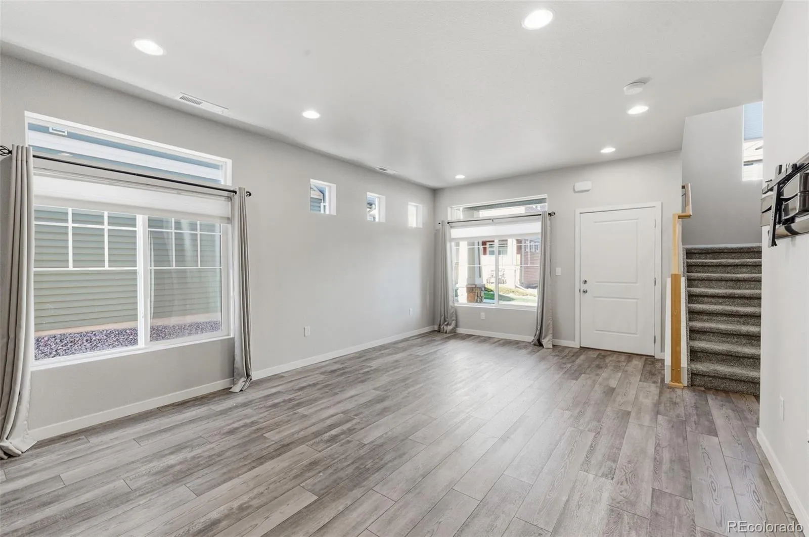 Make this desirable townhouse your home in the Banning Lewis Ranch neighborhood. No waiting and available for immediate move in. This home features 3 bedrooms, plus loft/flex space, 2.5 baths, and 2 car attached garage with a covered front porch. As you enter you see beautiful vinyl plank flooring throughout the main level. Lots of natural light comes through the extra accent windows. The large kitchen has an island with granite countertops, pantry, and black stainless steel kitchen appliances. The attached garage is finished with hanging shelves and customized finished garage flooring. There are wrought iron railings on the staircase which provide classic elegance and safety. There is also under stair space for additional storage on the first level. Appliances include the newer Samsung washer/dryer pair in the conveniently located laundry room on the second level which also has convenient built-in cabinetry above washer/dryer. The primary bedroom has a decorative barn door, walk-in closet, and an ensuite bath with tiled walk-in shower. The loft/flex room is pre-wired with surround sound. All upper baths have granite countertops and ceiling fans are located in all bedrooms and the loft/flex room. This home also features solar panels to reduce energy costs and live more sustainably. The Banning Lewis Metro District maintains the courtyard, landscaping, and snow removal throughout the community. Plenty of recreational opportunities and great schools. Perfect home to relax and entertain!