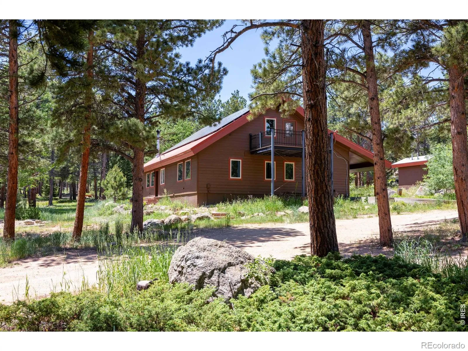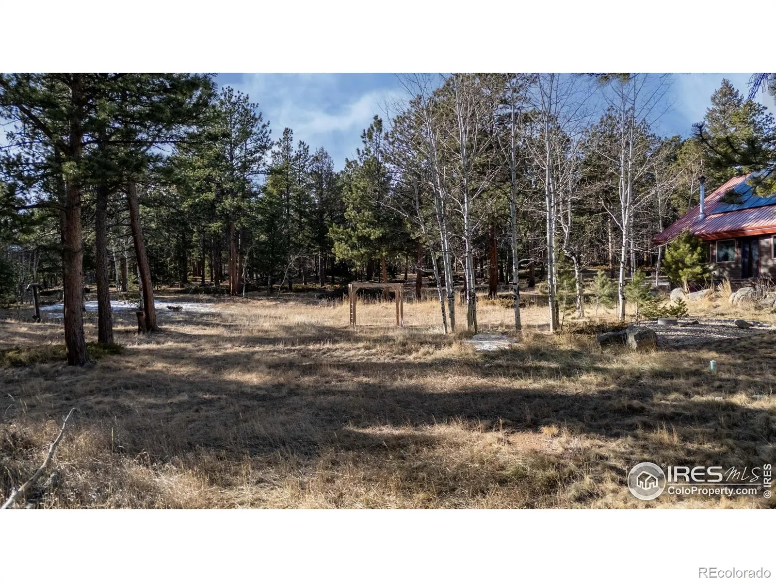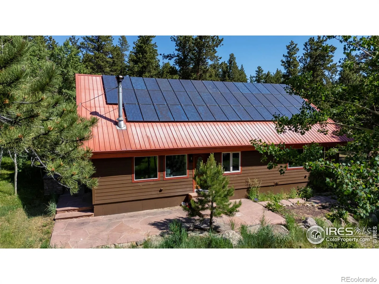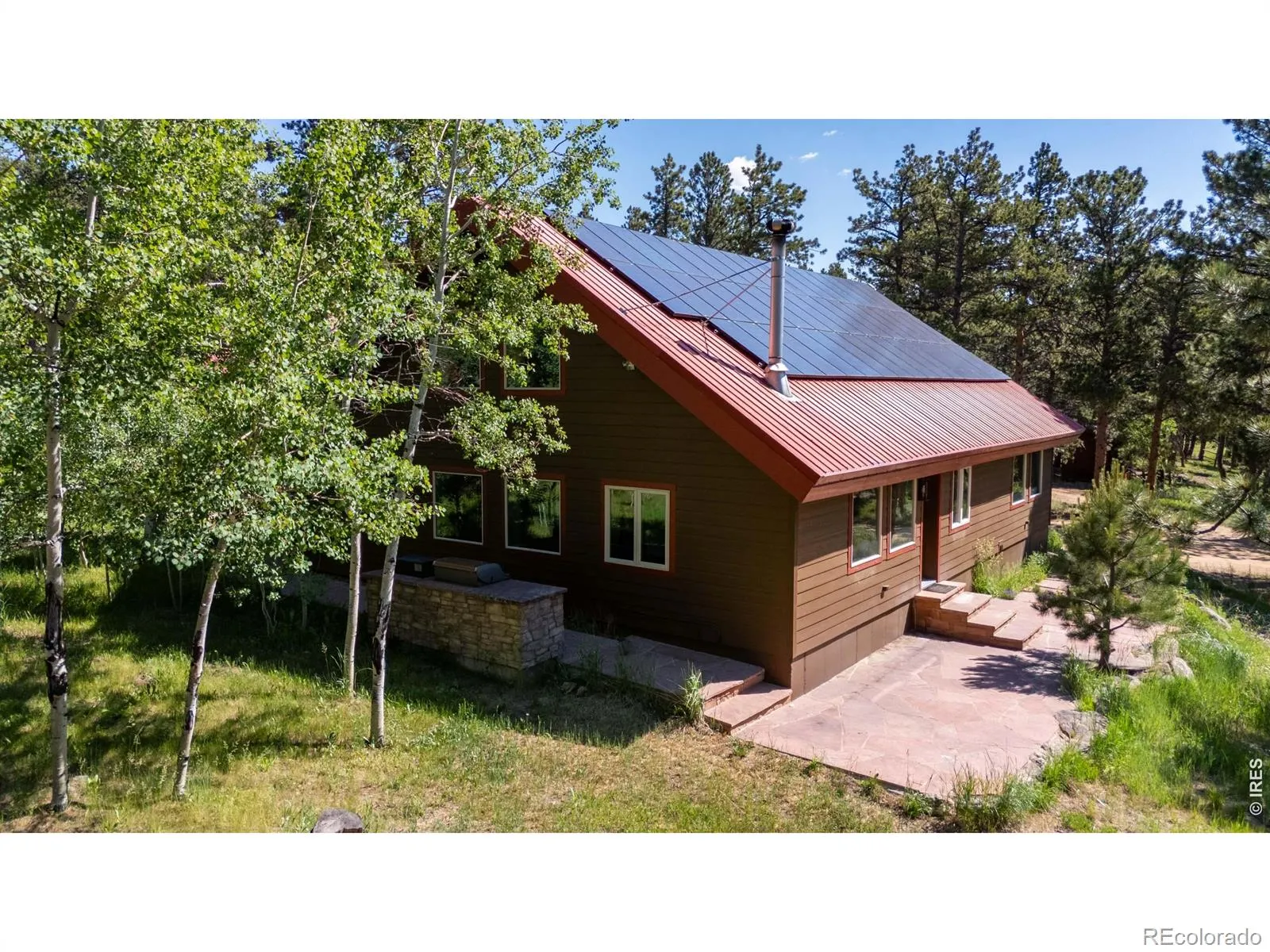 This is a place for people who come to the mountains to build a life. Quietly set among pine and aspen groves, this updated mountain home PLUS 2400 SF BARN/WORKSHOP sits on FIVE ACRES of usable land. The picturesque site is walkable & alive with seasonal wildflowers and glows with color in autumn as the aspens turn. There are no visible or audible neighbors here. Just quiet, wildlife, and land where you can garden, hike and watch the butterflies. Inside, vaulted ceilings and large windows open to the surrounding trees and sky. An upstairs loft that provides additional flex space. The main level primary bedroom supports single-level living and includes a five-piece bath with a steam shower. Two additional bedrooms are inviting. The interior has been updated over time, with newer flooring upstairs, updated bathrooms featuring quartz counters, and a modern steel stair railing. The kitchen is anchored by slate floors, granite counters, and light wood cabinetry and generous culinary space. A wood-burning stove brings warmth to the heart of the home. Twelve-inch-thick walls, radiant in-floor heat, and a geothermal cooling system help regulate comfort year-round. A south-facing sunkissed patio creates outdoor living space, staying warm through much of the year with an outdoor kitchen with a built-in gas grill and smoker. Four raised garden beds are already in place. A gazebo offers a shaded place to daydream. A chicken coop and woodshed sit nearby. Designed to function in all seasons, from bluebird days to snow days with solar system + generator. Walk to a private trail with long back range views or head downhill to riverside hiking. National Forest access, skiing, and renowned recreation are close by. Boulder is an easy, scenic drive to shopping and other everyday services. RMNP and Estes Park are close enough for lunch or an afternoon hike. If this looks great on your screen, I promise it will be even better in person.