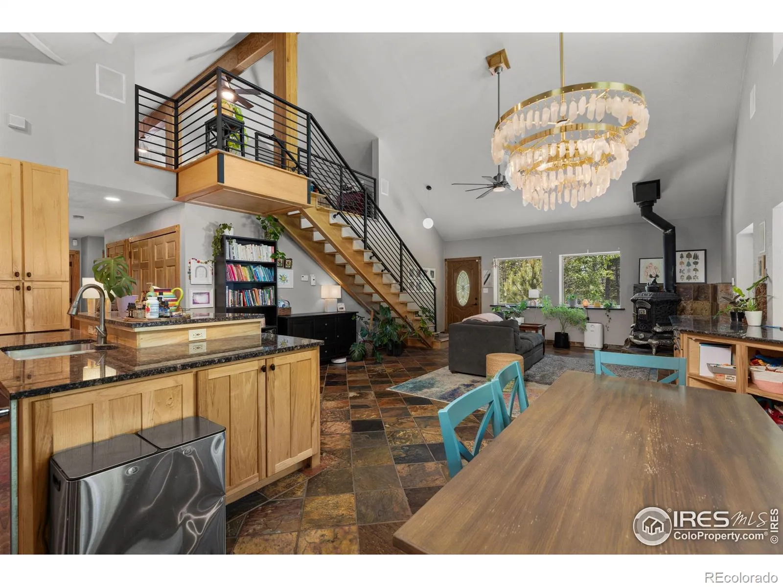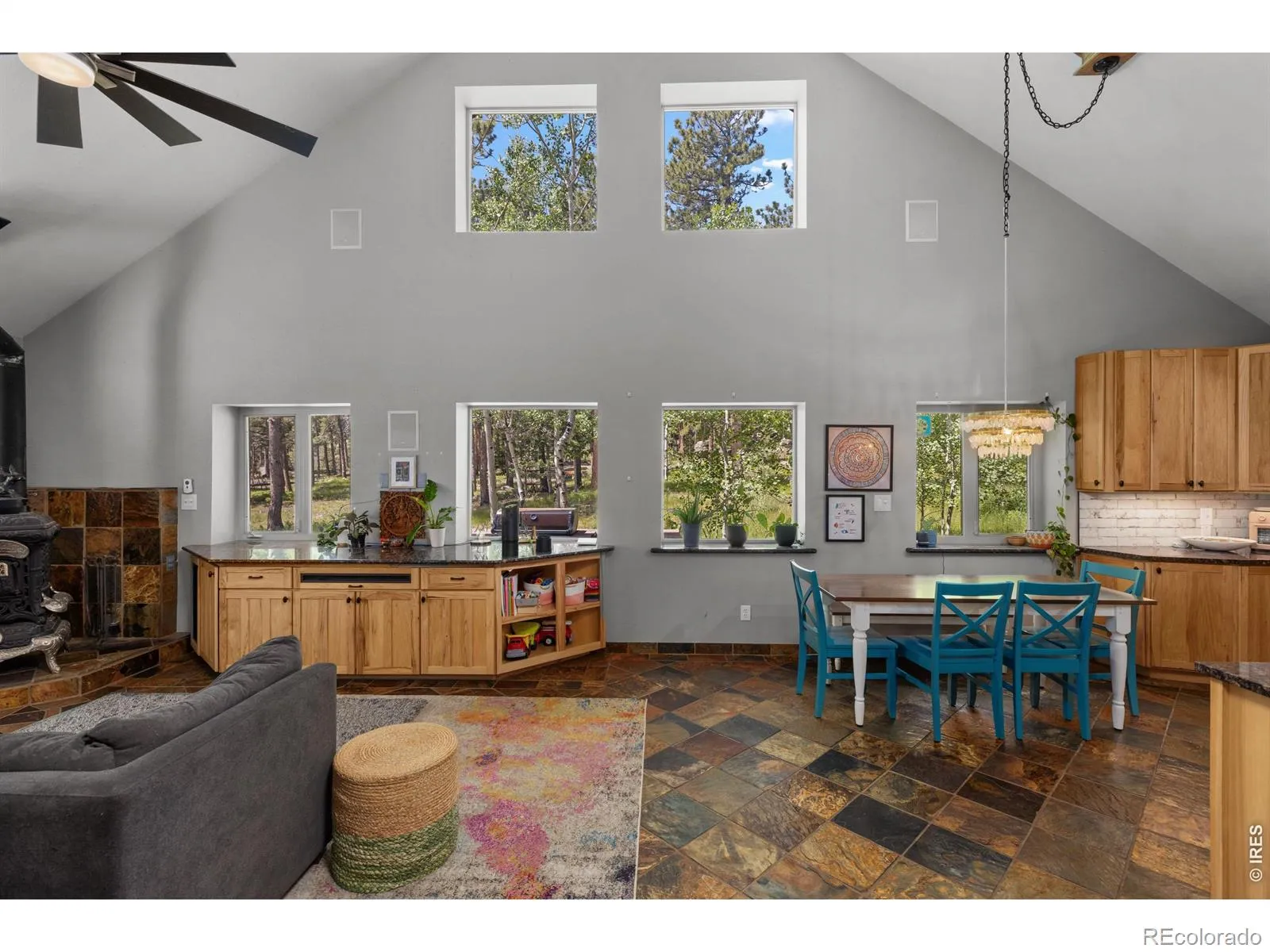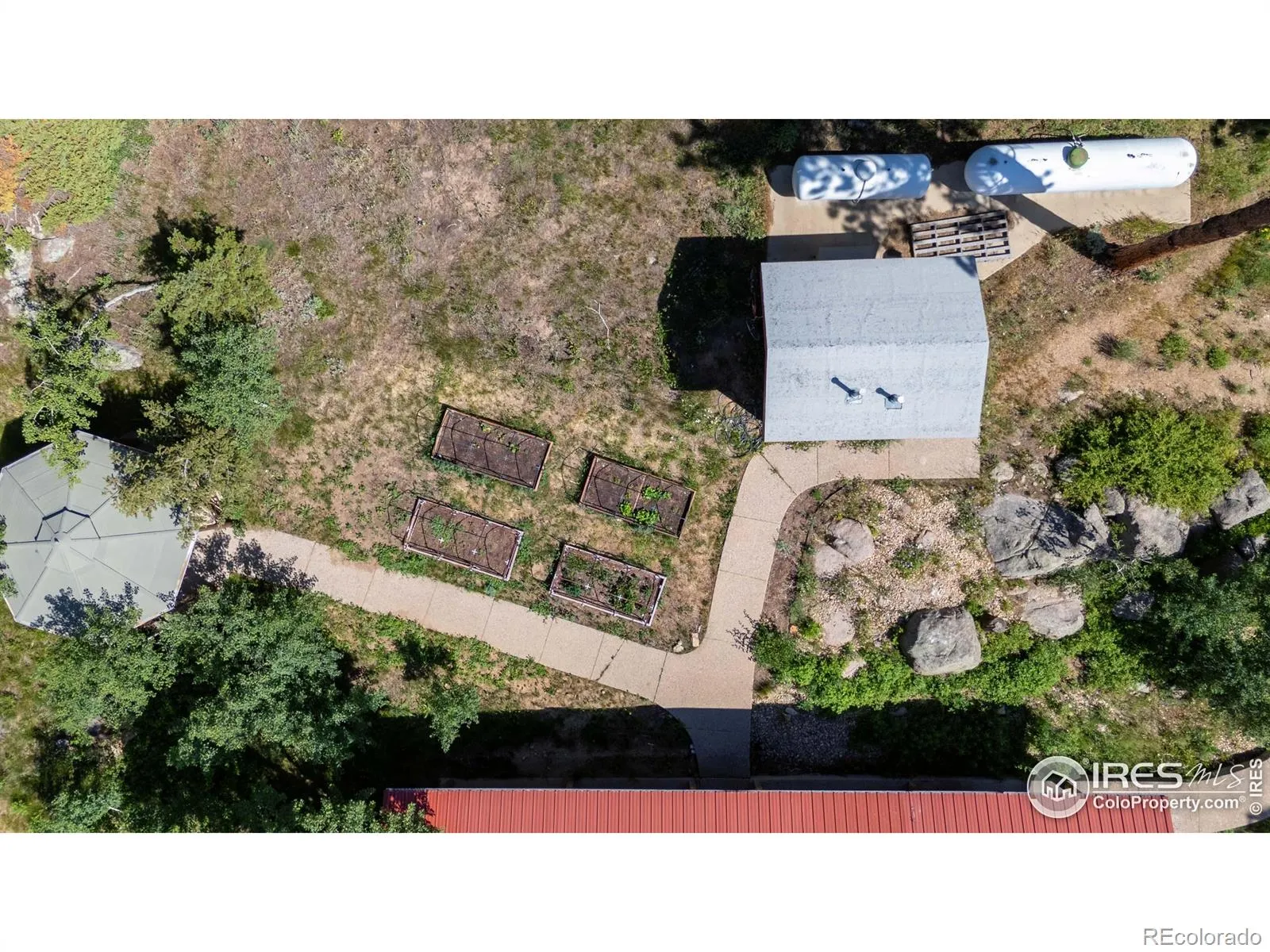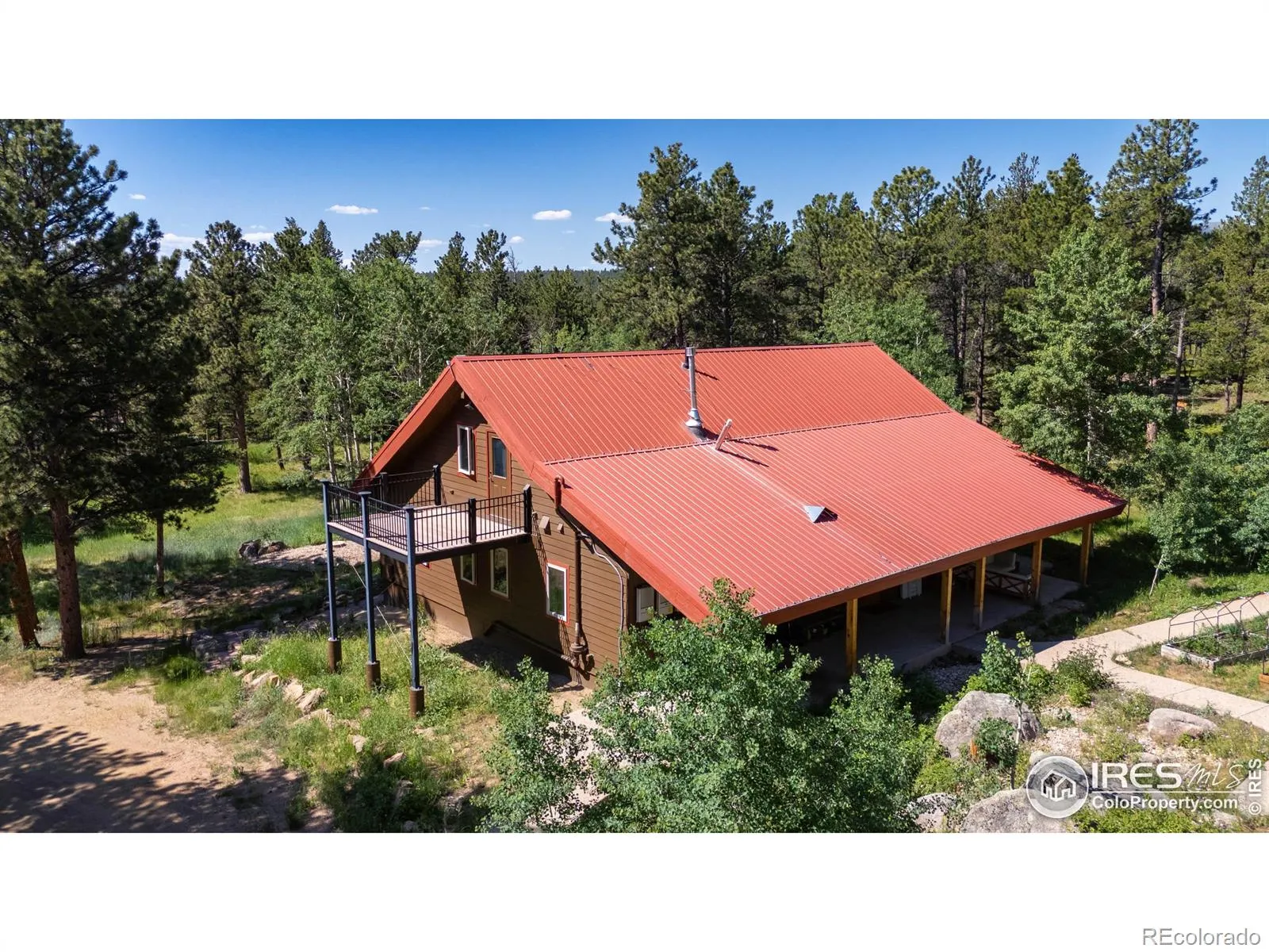 This is a place for people who come to the mountains to build a life. Quietly set among pine and aspen groves, this updated mountain home PLUS 2400 SF BARN/WORKSHOP sits on FIVE ACRES of usable land. The picturesque site is walkable & alive with seasonal wildflowers and glows with color in autumn as the aspens turn. There are no visible or audible neighbors here. Just quiet, wildlife, and land where you can garden, hike and watch the butterflies. Inside, vaulted ceilings and large windows open to the surrounding trees and sky. An upstairs loft that provides additional flex space. The main level primary bedroom supports single-level living and includes a five-piece bath with a steam shower. Two additional bedrooms are inviting. The interior has been updated over time, with newer flooring upstairs, updated bathrooms featuring quartz counters, and a modern steel stair railing. The kitchen is anchored by slate floors, granite counters, and light wood cabinetry and generous culinary space. A wood-burning stove brings warmth to the heart of the home. Twelve-inch-thick walls, radiant in-floor heat, and a geothermal cooling system help regulate comfort year-round. A south-facing sunkissed patio creates outdoor living space, staying warm through much of the year with an outdoor kitchen with a built-in gas grill and smoker. Four raised garden beds are already in place. A gazebo offers a shaded place to daydream. A chicken coop and woodshed sit nearby. Designed to function in all seasons, from bluebird days to snow days with solar system + generator. Walk to a private trail with long back range views or head downhill to riverside hiking. National Forest access, skiing, and renowned recreation are close by. Boulder is an easy, scenic drive to shopping and other everyday services. RMNP and Estes Park are close enough for lunch or an afternoon hike. If this looks great on your screen, I promise it will be even better in person.