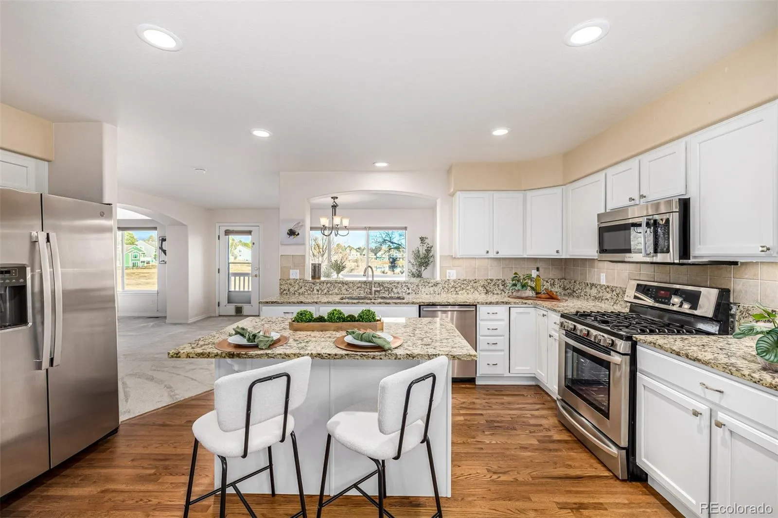 The only house currently available on the lake in the entire Grant Ranch community, this Gray Hawk home ends at a cul de sac and offers true lakefront living with uninterrupted water views from the living room, dining room, primary bedroom, rear deck, and walkout level patio. The main level is designed for everyday living with a gas fireplace anchoring the living room, a defined foyer, powder room, dining room with direct access to the back deck, and a kitchen with granite countertops, a gas stove, island, generous cabinetry, stainless appliances, a separate eat in area, and an adjacent utility and laundry room. Upstairs, the layout features an open overlook that looks down into the living room below, creating volume and connection between levels, while the primary suite faces the lake and includes plantation shutters, a large walk in closet, and a renovated oversized walk in shower with dual vanity. Two additional bedrooms and a full bath complete the upper level. The unfinished walkout basement is large and opens directly to the rear patio and lake views, offering immediate outdoor access and clear opportunity for future expansion. The attached two car garage is drywalled and oversized. This home is turnkey and low maintenance, supported by a new hybrid HVAC system with furnace, air conditioning, and heat pump. Grant Ranch amenities include a private lake with marina and dock, complimentary paddle boards, kayaks, and sailboats, a sailing club, clubhouse, pool, tennis courts, exterior maintenance, and snow removal. With Raccoon Creek Golf Course next door, Sunset Park down the street, and the Wadsworth corridor close by with Whole Foods, Trader Joe’s, Home Depot, and Lowe’s, this is a rare opportunity to own true lakefront property in a community built around access, activity, and ease.