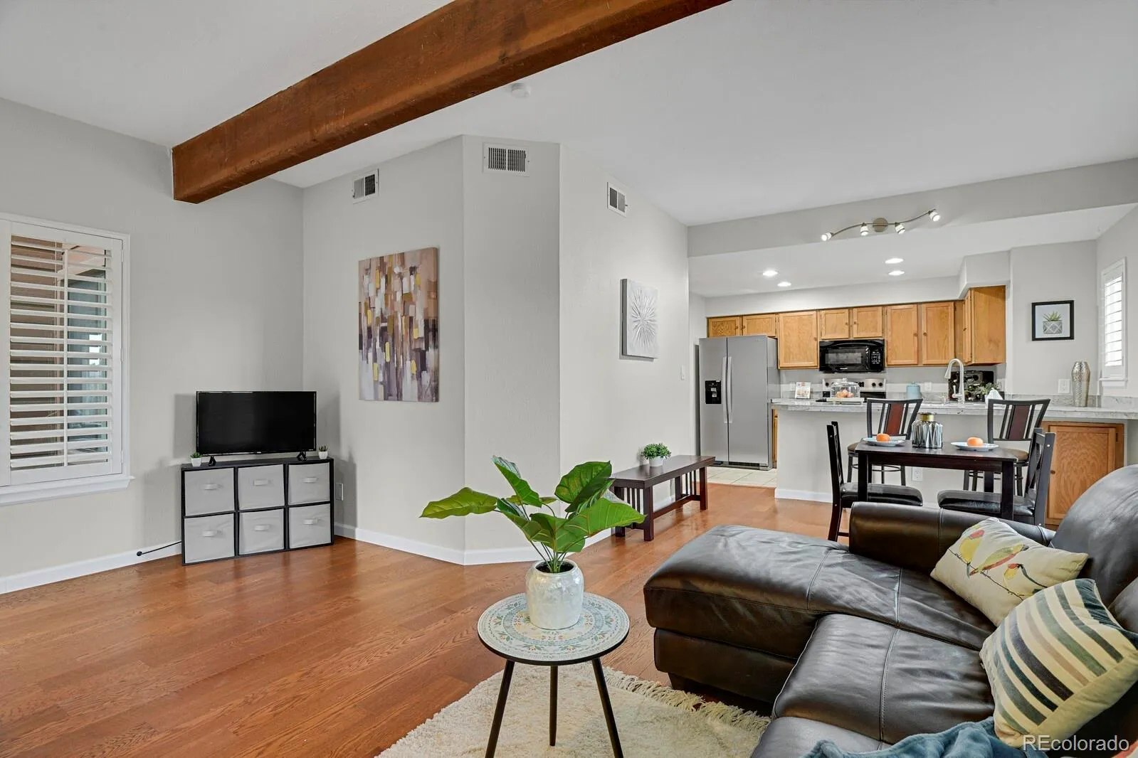 THIS PROPERTY IS FHA APPROVED! Welcome to Beaumont Place, where comfort meets convenience in this beautifully updated ground-level condo. Thoughtfully designed on a single floor, this one-bedroom, one-bath home combines warmth, charm, and easy living in one inviting package. This lovely homes also sports fresh paint throughout, brand new carpet, brand new washer/dryer/kitchen appliances. Step inside to a light-filled living room featuring real hardwood floors and a striking exposed wood beam that adds character and architectural appeal. A cozy wood-burning fireplace anchors the space, creating the perfect setting for relaxing evenings at home. The kitchen is both stylish and functional with granite tile counters, sleek new appliances, and ample cabinetry. The spacious bedroom offers a large walk-in closet and all windows are fitted with elegant upgraded shutters for privacy and light control. A few steps outside your door, the Beaumont Place community provides access to a sparkling pool and spa—ideal for unwinding or meeting neighbors. The location is a dream for outdoor enthusiasts, with the High Line Canal Trail, Kennedy Golf Course, and Cherry Creek Country Club all just a short stroll away. Restaurants, shops, and everyday conveniences are nearby, making this home an exceptional choice for those seeking lifestyle and location in equal measure. Discover easy living at its best—schedule your showing today.