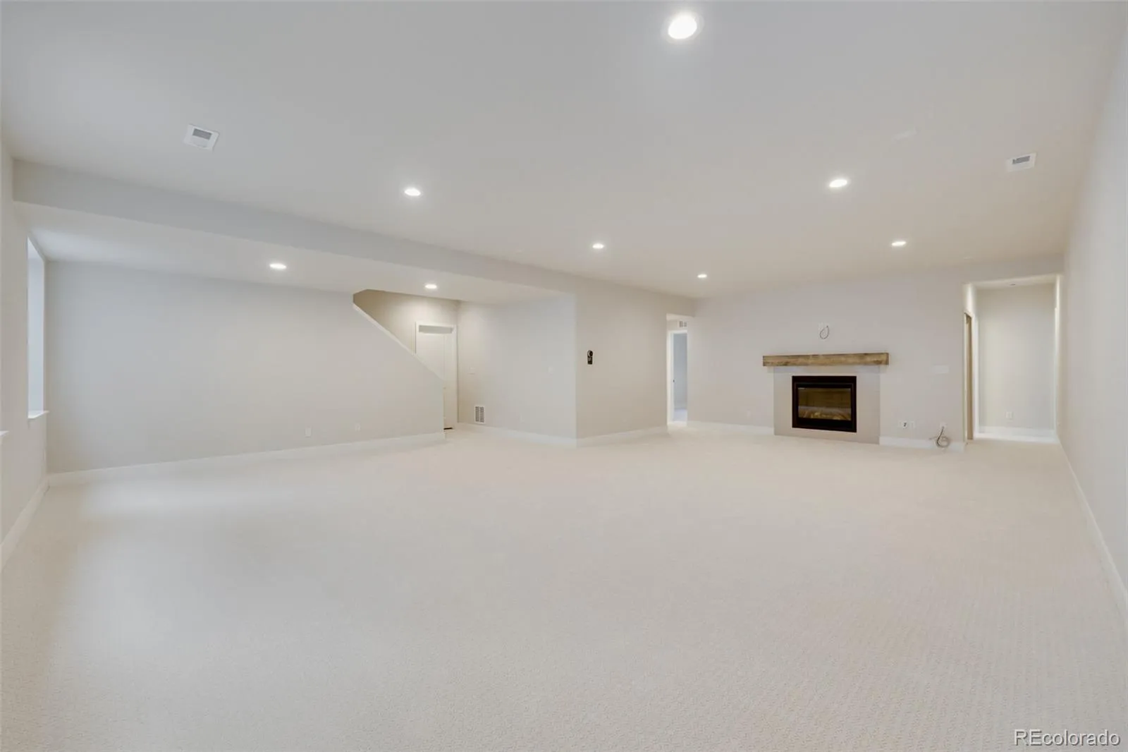 modern and distinctive open-concept design. The main living room boasts a cozy fireplace and dual sliding doors that