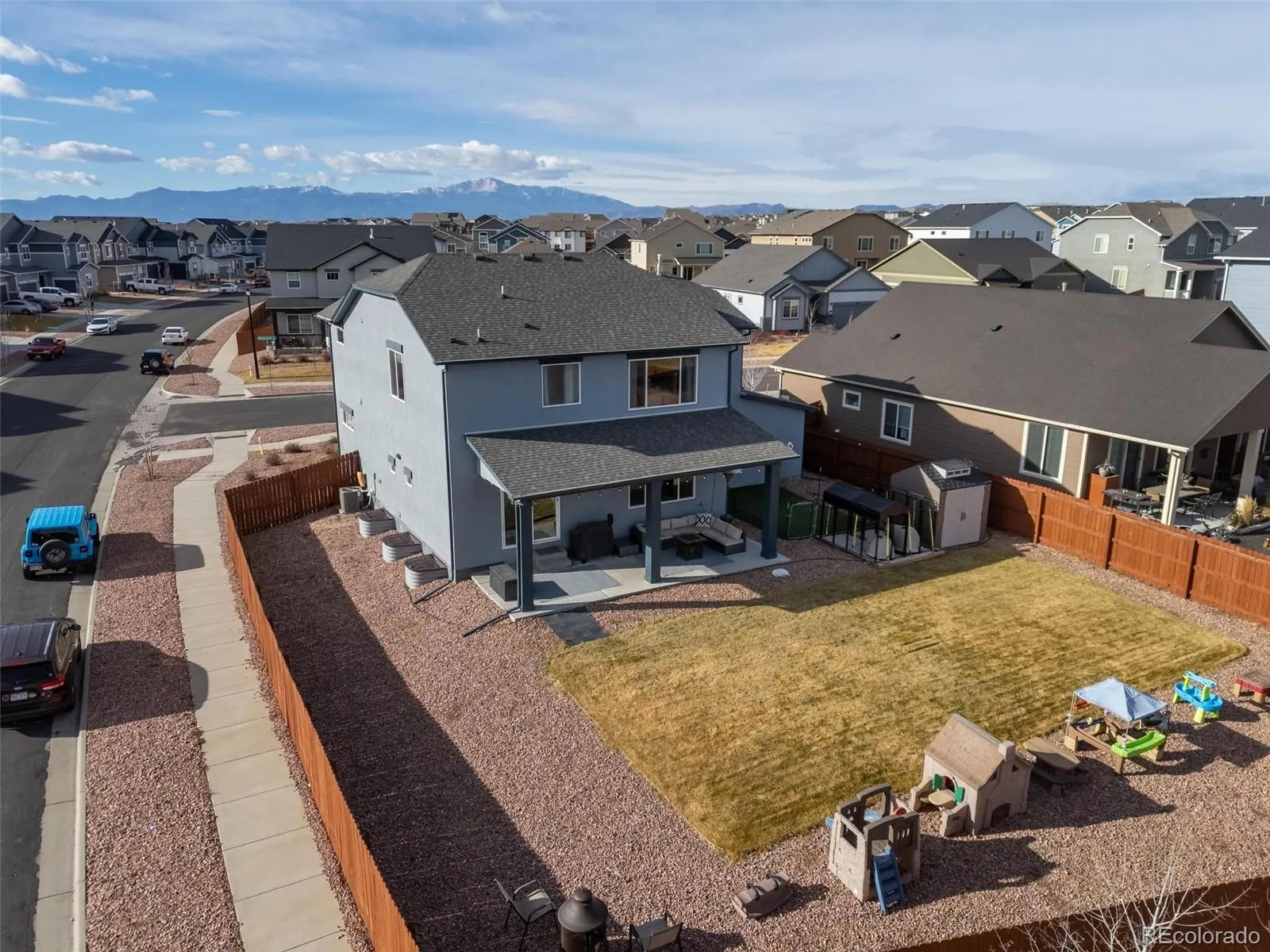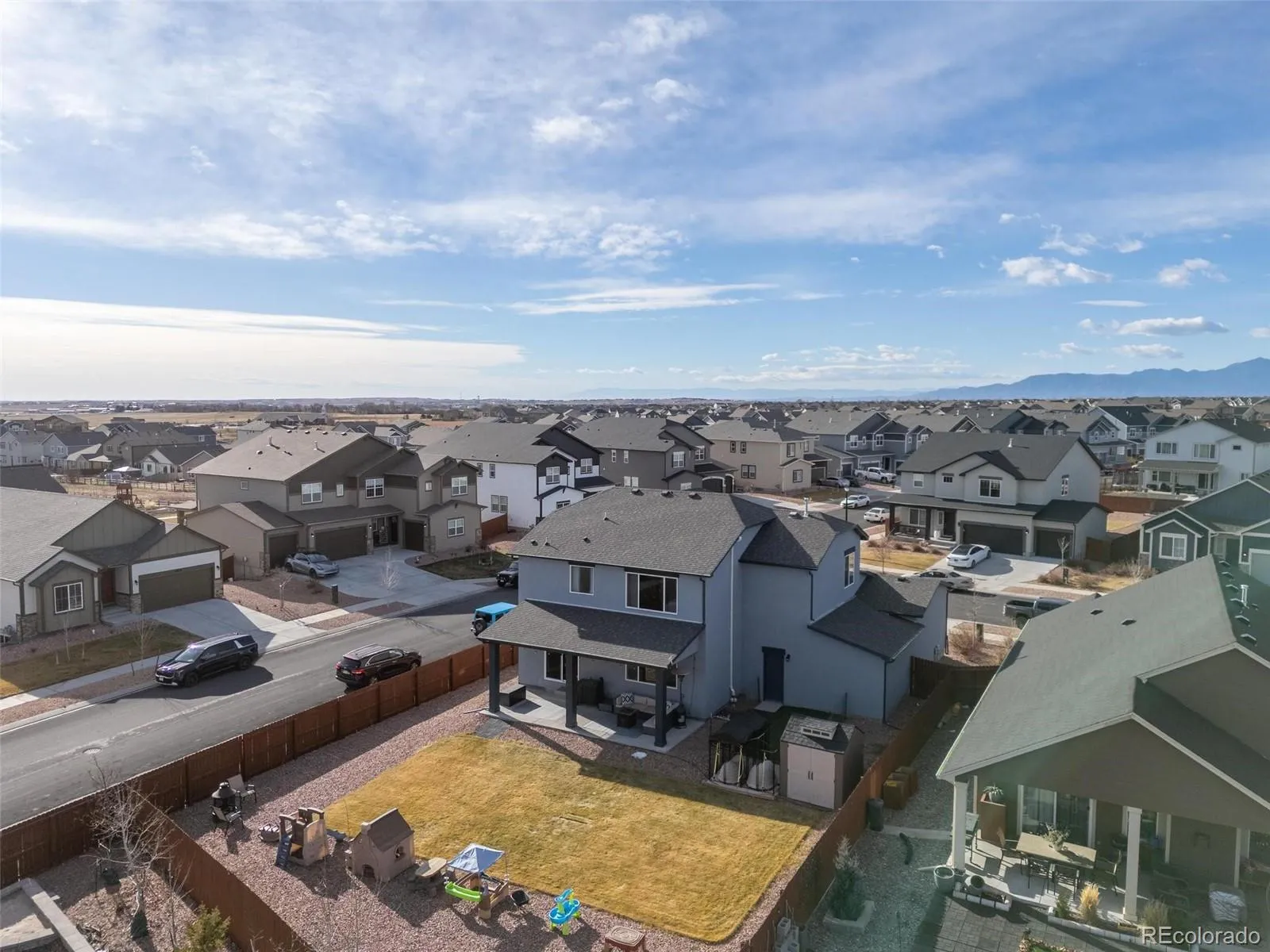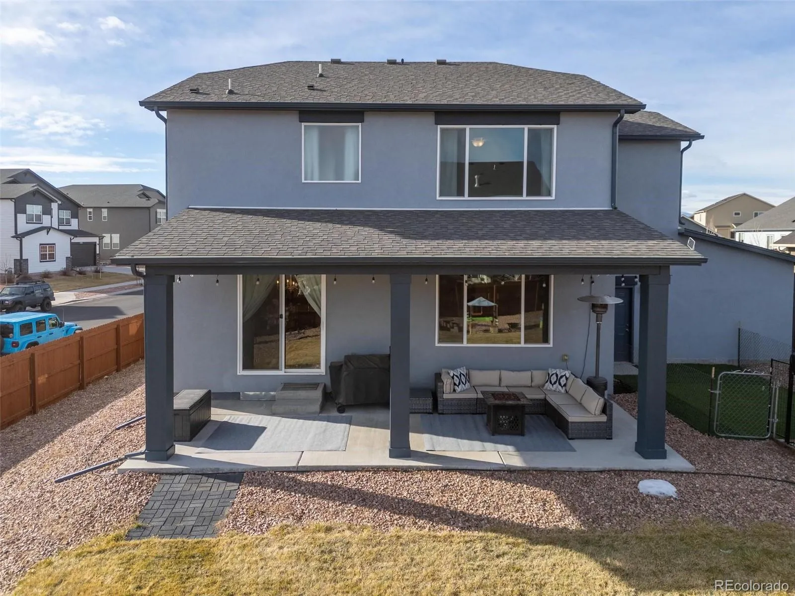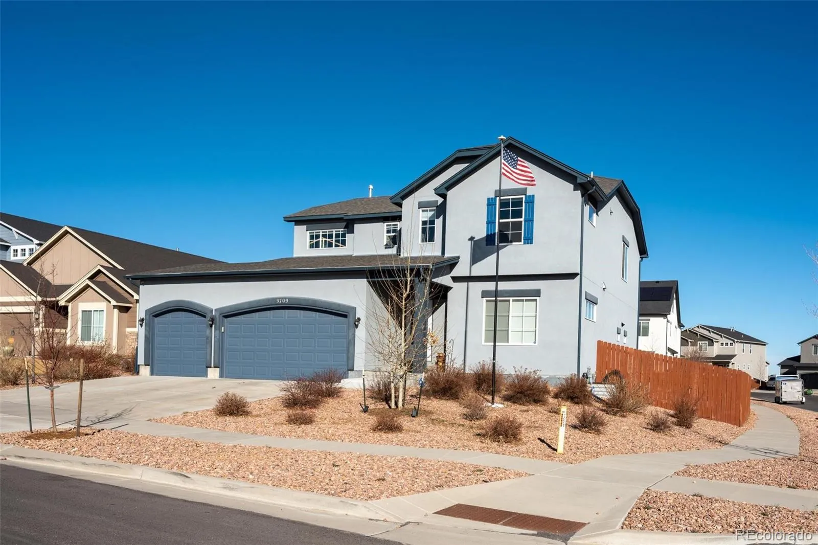 Welcome to this expansive 3,862 sq ft home built in 2020. This home offers extended living spaces across all three finished levels. The main level welcomes you with a bright entryway, private office, half bath, and a spacious living area with an electric fireplace. The kitchen is both stylish and functional, featuring quartz countertops, a large center island, 42″ upper cabinets, a walk-in pantry, and a dedicated dining area complete with a built-in buffet. Additional upgrades include a reverse osmosis water system under the sink and a whole-home water filtration and softener system. Upstairs, the primary suite is a true retreat, boasting a luxurious five-piece bath, a double vanity with quartz counters, and an expansive walk-in closet. Three additional bedrooms, 2 full bathrooms, and a laundry room complete the upper level. Blackout blinds in all bedrooms and the living room provide comfort, privacy, and energy efficiency. The fully finished basement adds exceptional flexibility with a large great room, exercise or flex space, two additional bedrooms—each with a walk-in closet—and a full bath, making it ideal for guests or multi-generational living. This home is equipped with premium health, comfort, and security features including a radon mitigation system, UV light filter in the furnace, whole-home humidifier, and a security system. Outdoor living shines with an extended covered patio measuring 29′ x 11′, complete with a ceiling fan. The fenced yard features a dog run, and storage shed. Completing the property is an oversized, fully insulated 5-car garage with a heater making it comfortable for year-round use, storage, or workshop needs. Located in the desirable Meridian Ranch community, this home offers an easy commute to military installations and access to exceptional neighborhood amenities including hiking and biking trails, a golf course, and two recreation centers featuring full gyms, childcare, and both indoor and outdoor pools.