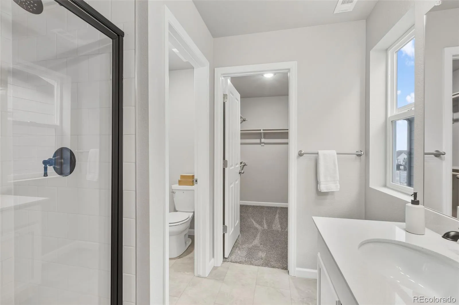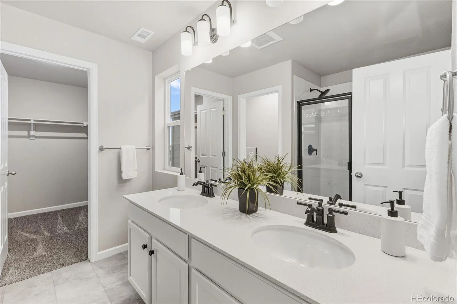 Upstairs, a centrally located laundry room adds everyday convenience. The primary bedroom at the front of the home includes a private bathroom with a double vanity, tiled shower, water closet, and a large walk-in closet. The second bedroom is located at the back of the home and features its own private full bathroom.